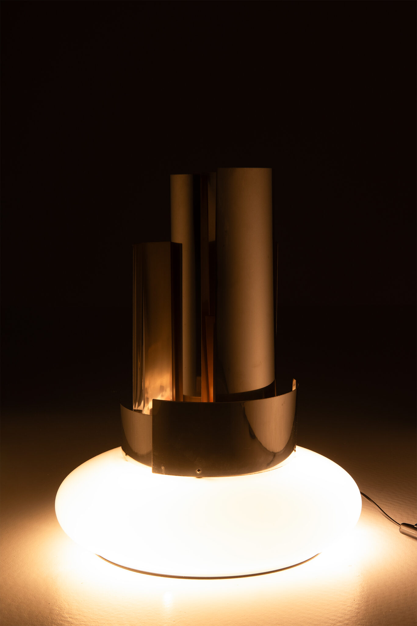 Rare lampadaire/table sculptural, réalisé en 1971 par l'artiste italien Giuseppe Calonaci. Le lampadaire se compose d'une base en plexiglas sur laquelle sont fixées plusieurs feuilles d'aluminium incurvées. La position de ces feuilles peut être modifiée en utilisant les petits cubes en métal et en les repositionnant dans différents trous. La production de cette lampe a été limitée à 300 exemplaires, dont celui-ci est le n° 57, ce qui en fait une pièce rare. La lampe est signée par l'artiste et se trouve dans son état d'origine. Elle présente peu de traces d'usure normales pour son âge et son utilisation.