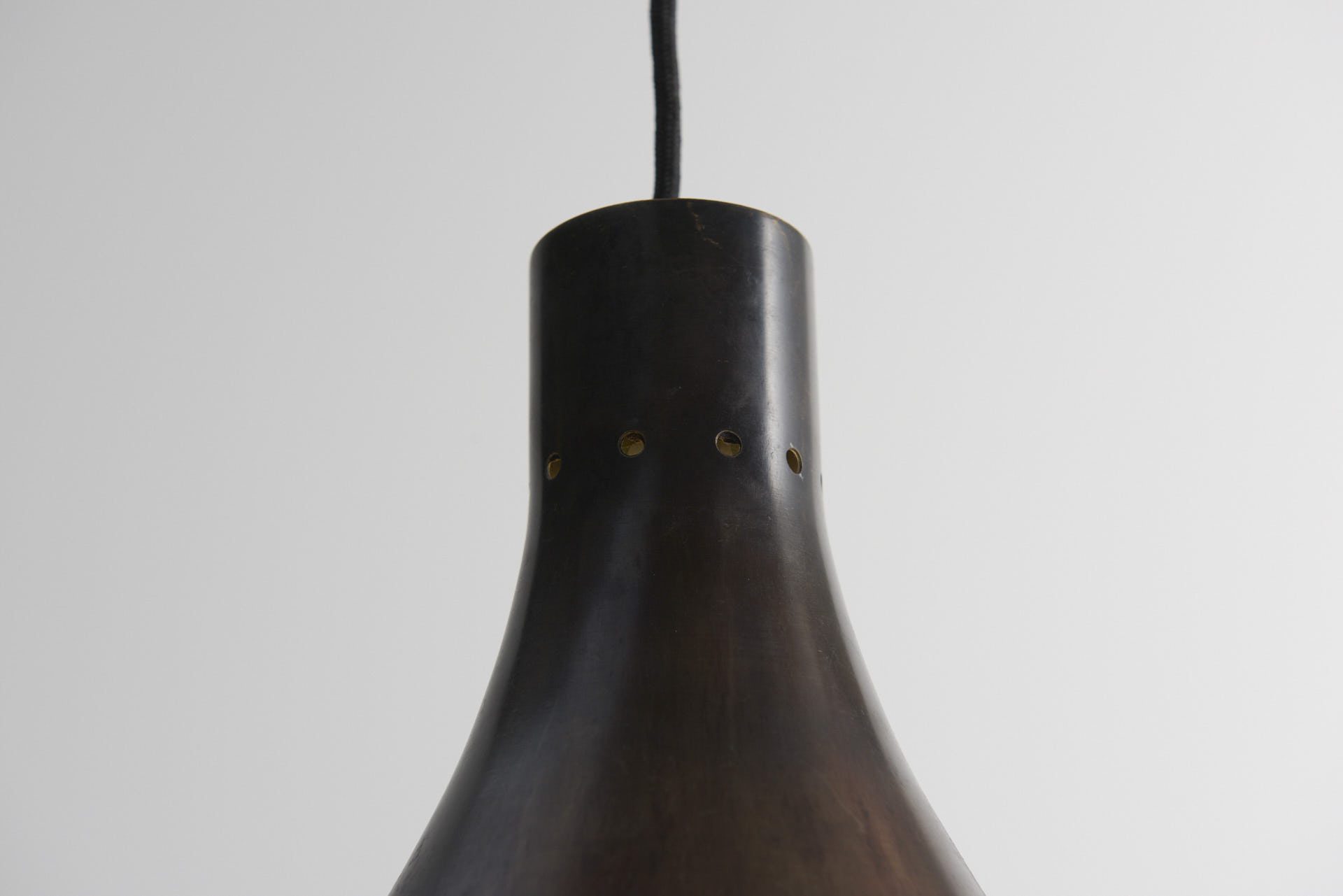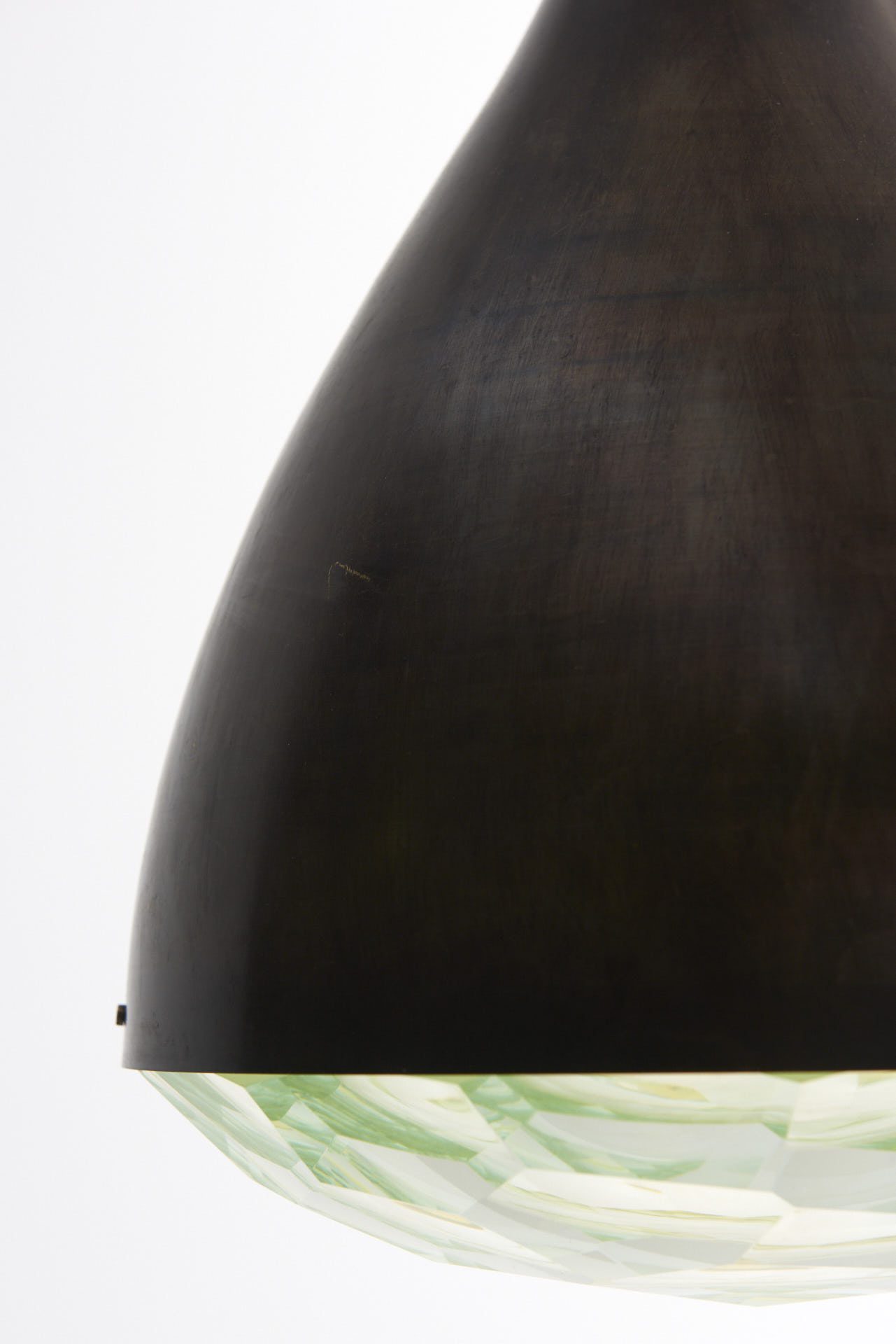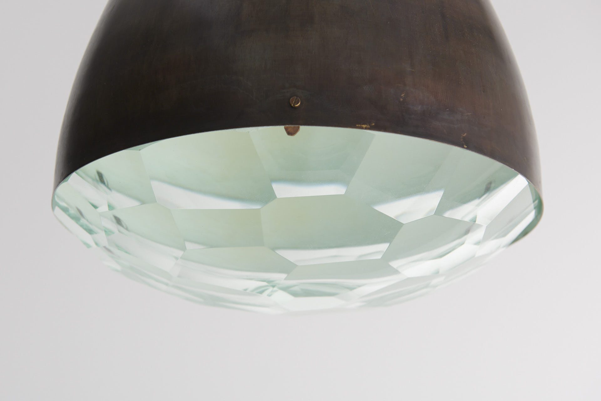 Une rare et magnifique suspension en laiton avec une finition oxydée foncée, un intérieur peint en blanc et un grand diffuseur en cristal facetté. Peut contenir une ampoule de taille standard et peut supporter jusqu'à 75 watts. Design de Max Ingrand pour Fontana Arte. Fabriqué en Italie.