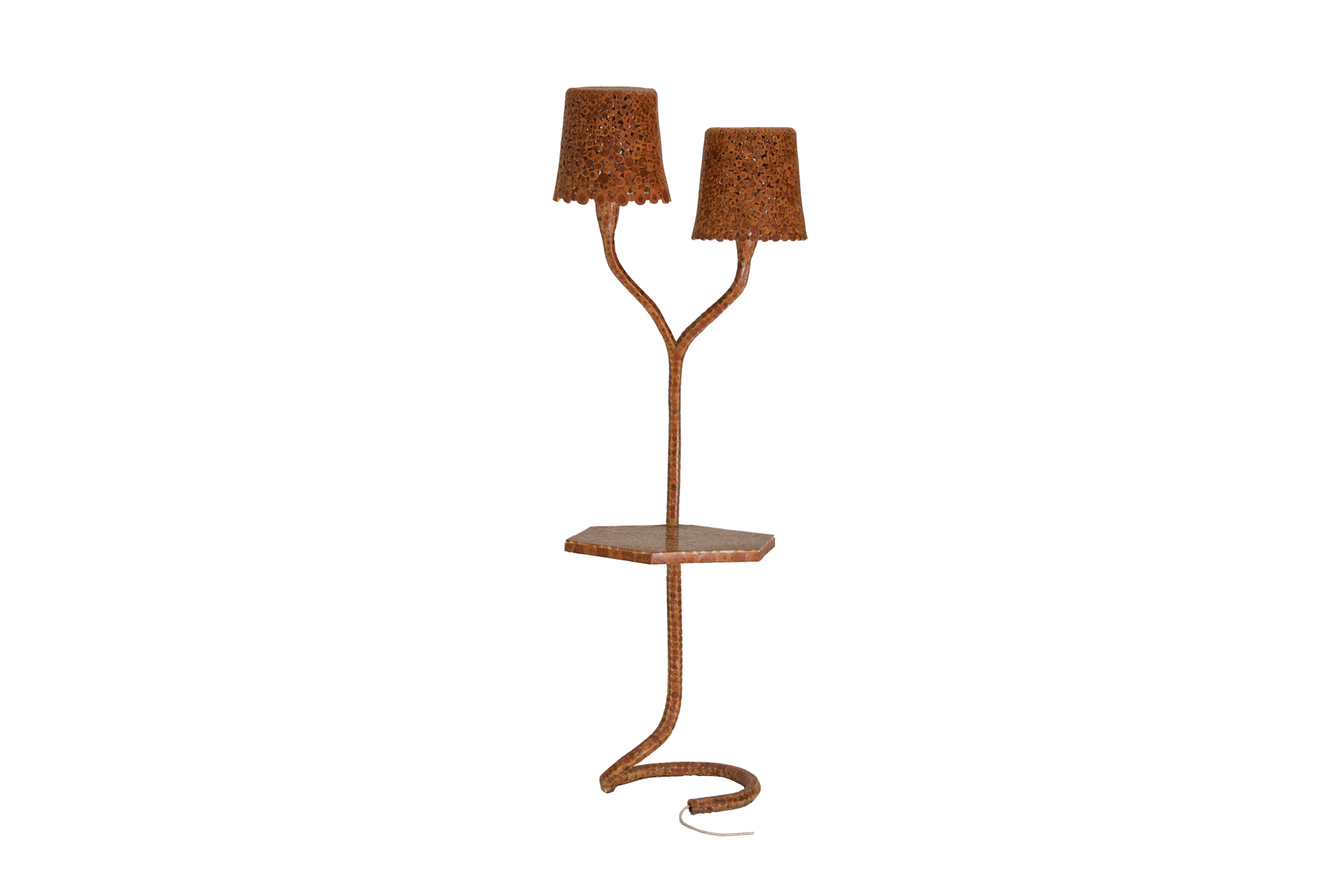 La base de la lampe a une forme organique qui rappelle la queue d'un serpent. Vers le haut, la base se divise en deux abat-jour.