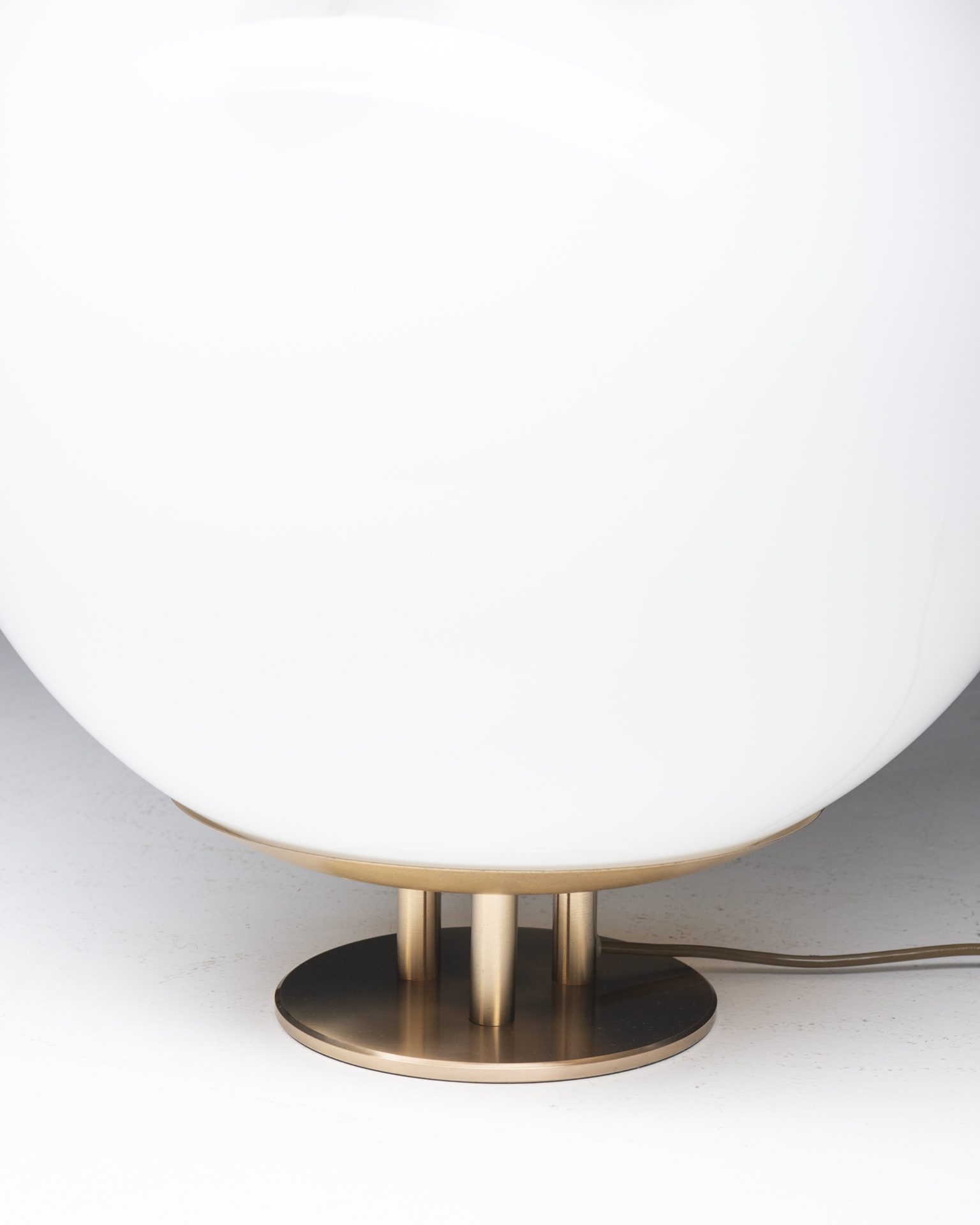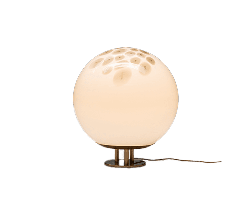 Un superbe lampadaire en verre de Murano, fabriqué par La Murrina (IT) dans les années 1960. La lampe se compose d'une grande sphère en verre opalin blanc soufflé à la main avec des illustrations, reposant sur un pied en laiton. La sphère est signée "La Murrina". Elle se trouve dans son état d'origine, avec quelques traces d'usure normales pour son âge.