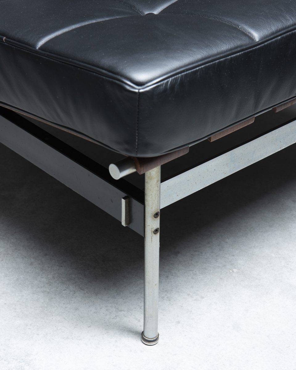 À l'époque, il était radicalement nouveau avec son design à lattes et l'utilisation de l'acier brossé. Les lattes de contreplaqué sont recouvertes d'un placage de jacaranda. Les coussins, recouverts de cuir noir, sont en très bon état. Le cadre présente quelques signes mineurs d'usure. Fabriqué par Artifort aux Pays-Bas.