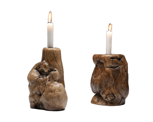Une paire unique de bougeoirs, probablement fabriqués dans les années 1960/70. Le pays d'origine reste inconnu. La paire comprend une pièce de couleur foncée et une pièce de couleur plus claire. La bougie est maintenue par une petite coupelle en acier. Les deux pièces sont dans leur état d'origine.