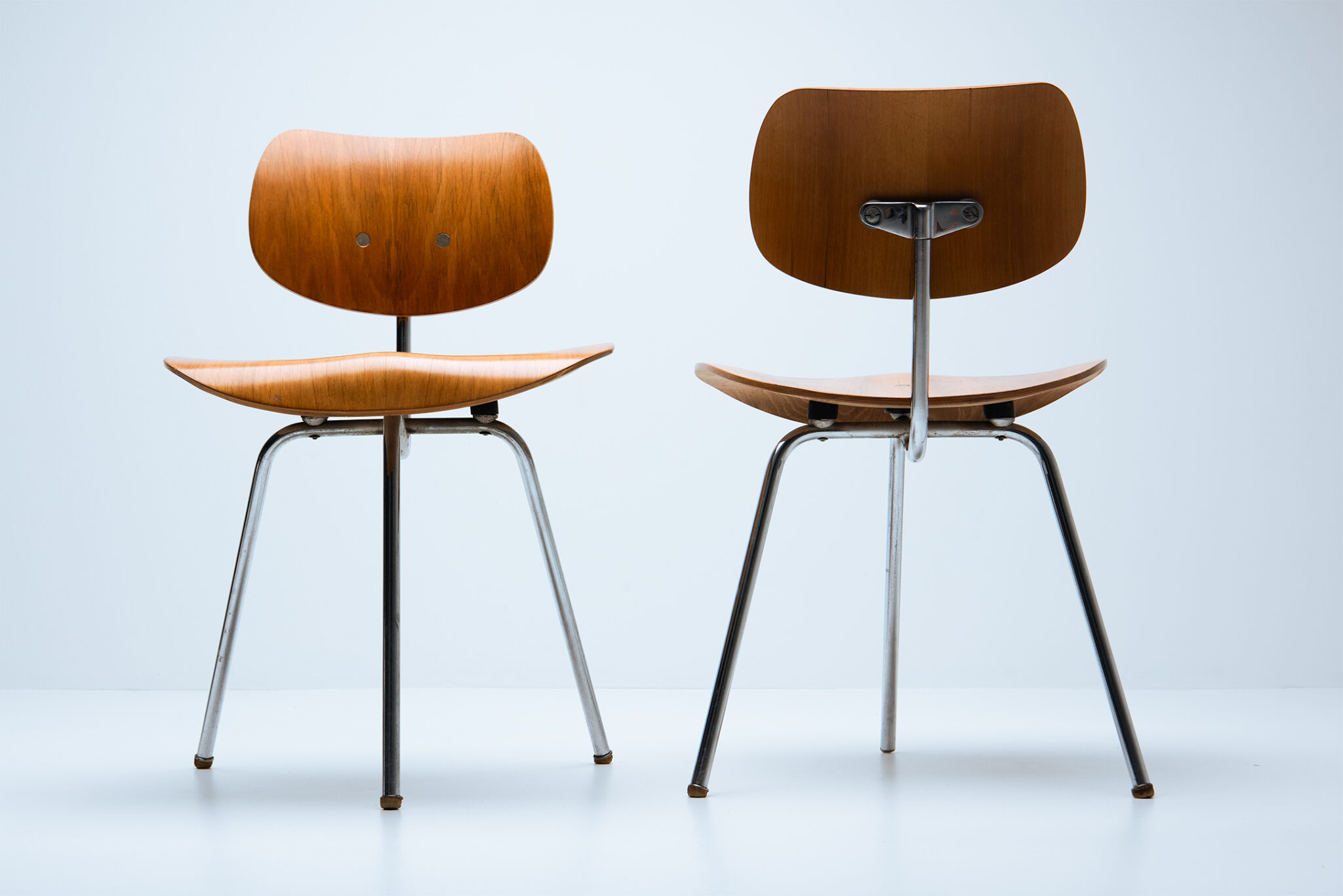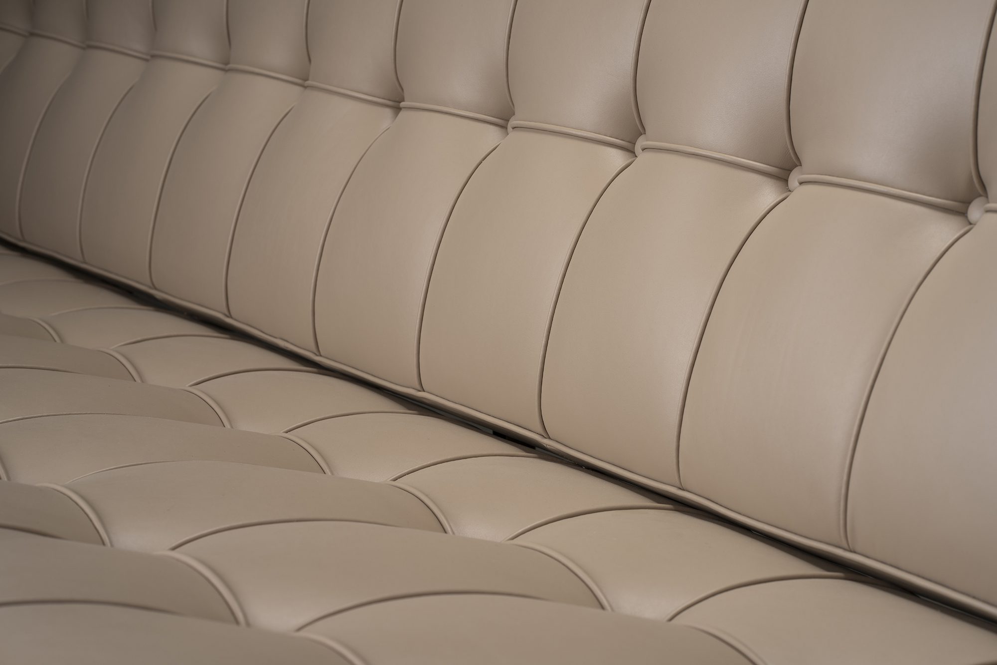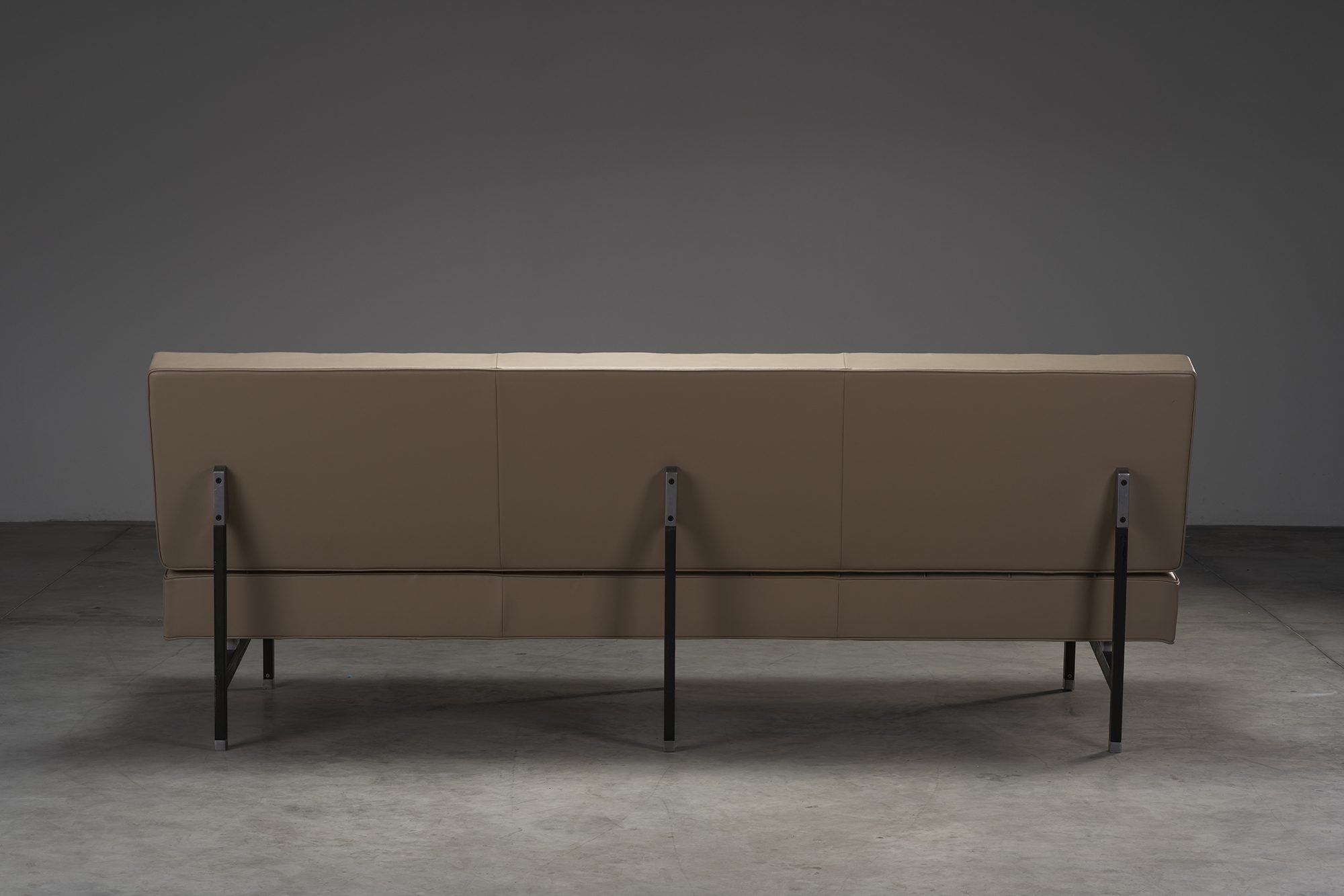 Il s'agit de la première production, la base métallique est laquée en gris foncé (plus tard, elle sera chromée) et les pièces détaillées sont fabriquées en aluminium massif. Le canapé est restauré par Troon Works avec du cuir semi-aniline de haute qualité. La mousse est remplacée pour un confort exceptionnel combiné à une excellente durabilité. Les sangles ont également été remplacées, une restauration complète a été effectuée. Le métal et l'aluminium présentent une patine et des signes d'utilisation acquis au fil des ans.