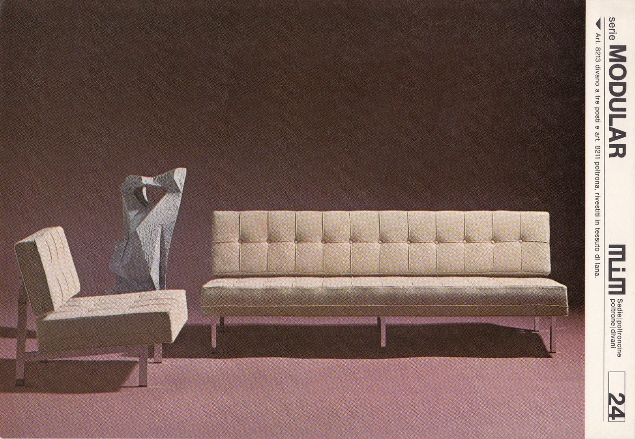 Rare canapé produit par MIM Roma (Mobili Italiana Moderne) en Italie. Fondée en 1958 par Ennio Faziola, la société MiM avait pour objectif de prendre en charge l'ensemble du cycle de production des meubles de maison et de bureau, de la conception à la vente, en passant par la production. L'artisanat et les nouveaux matériaux combinés à de nouvelles techniques devaient s'intégrer à l'époque "moderne" actuelle. En outre, les meubles devaient pouvoir être utilisés à la fois à la maison et au bureau.