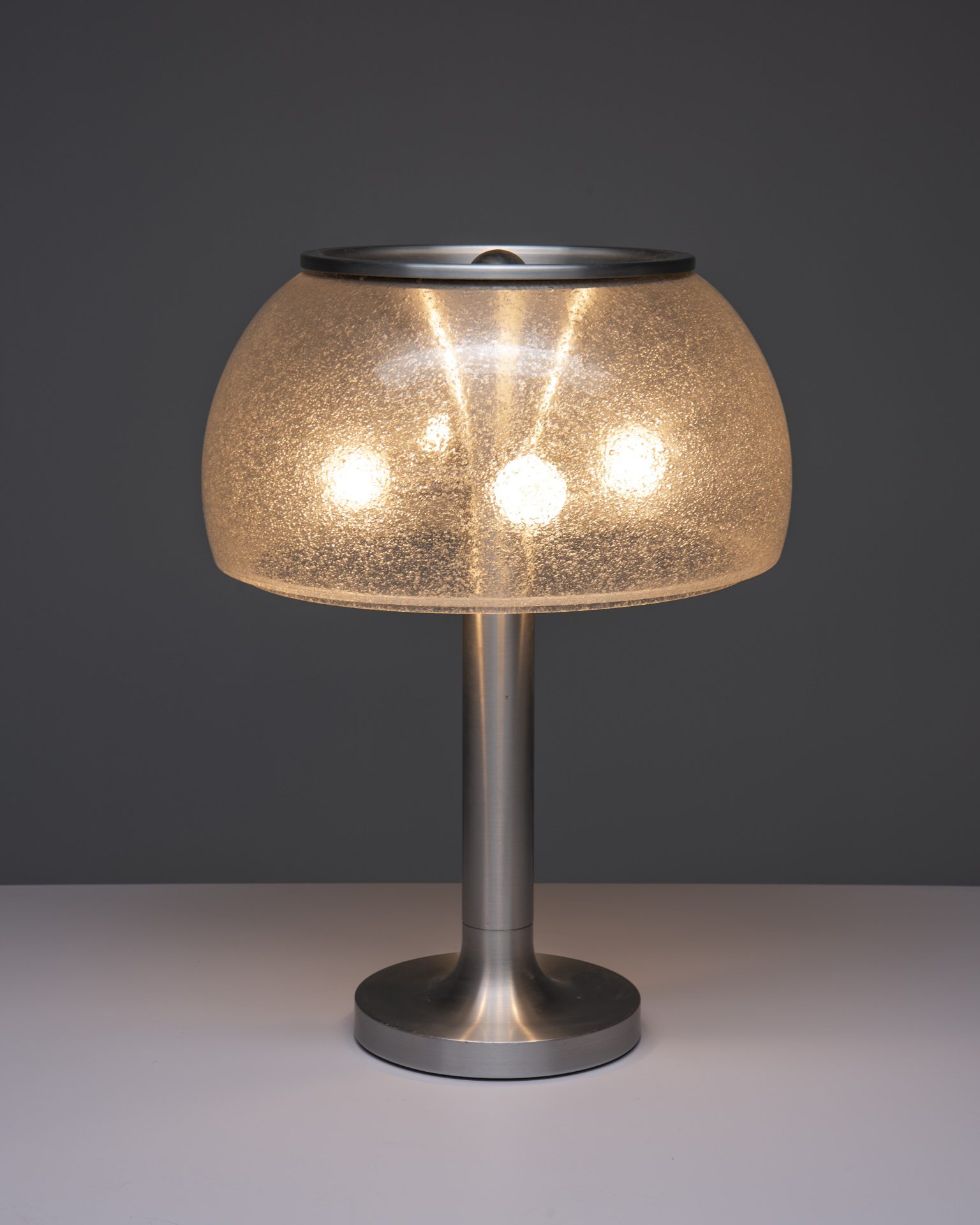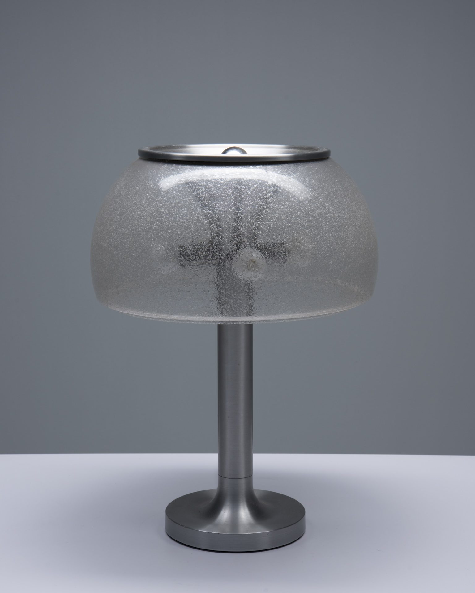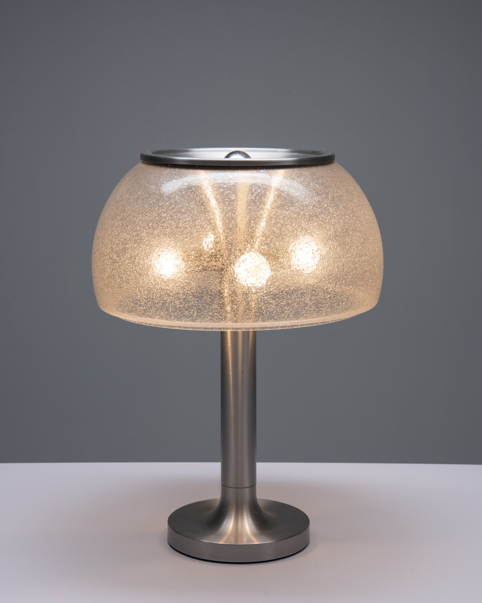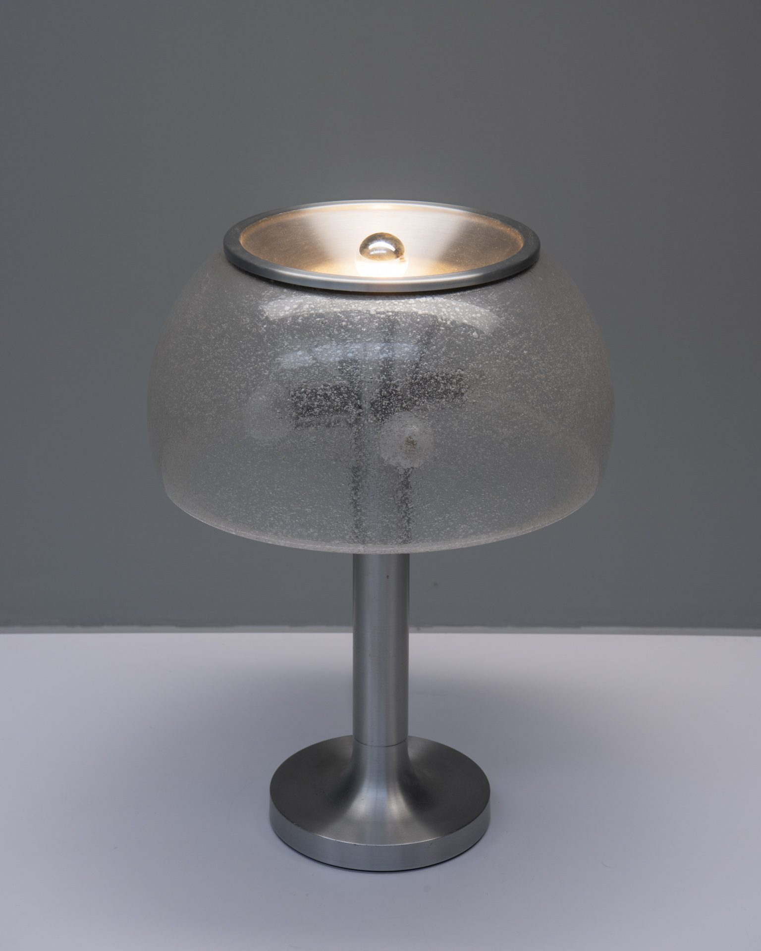 Une lampe de table rare, fabriquée dans les années 1960 par Temde, Allemagne. Elle se compose d'une base en aluminium brossé sur laquelle repose un dôme en verre bullé. La lampe a 5 prises E14 au total, 4 sous le dôme en verre, 1 au-dessus. Les deux peuvent être allumées séparément. Pour la douille supérieure, il est recommandé d'utiliser une ampoule miroir pour un éclairage optimal. Cet article est dans son état d'origine et présente peu de traces d'usure telles que des rayures.