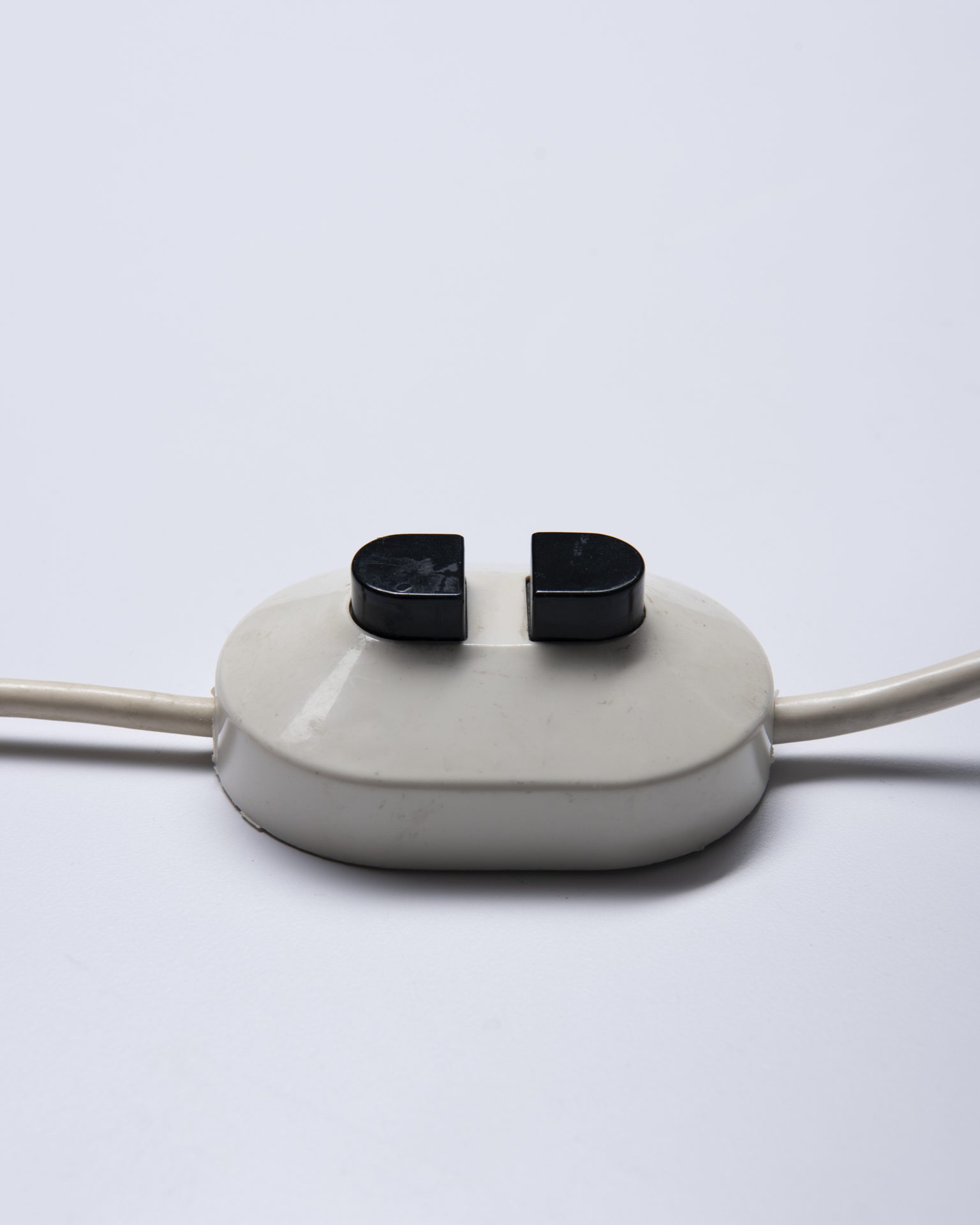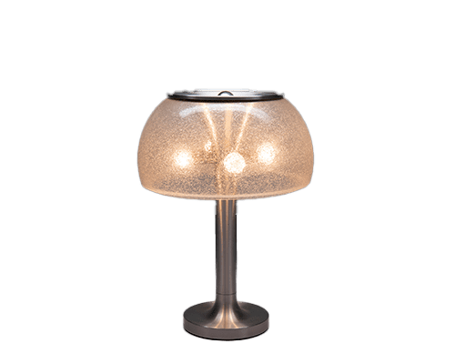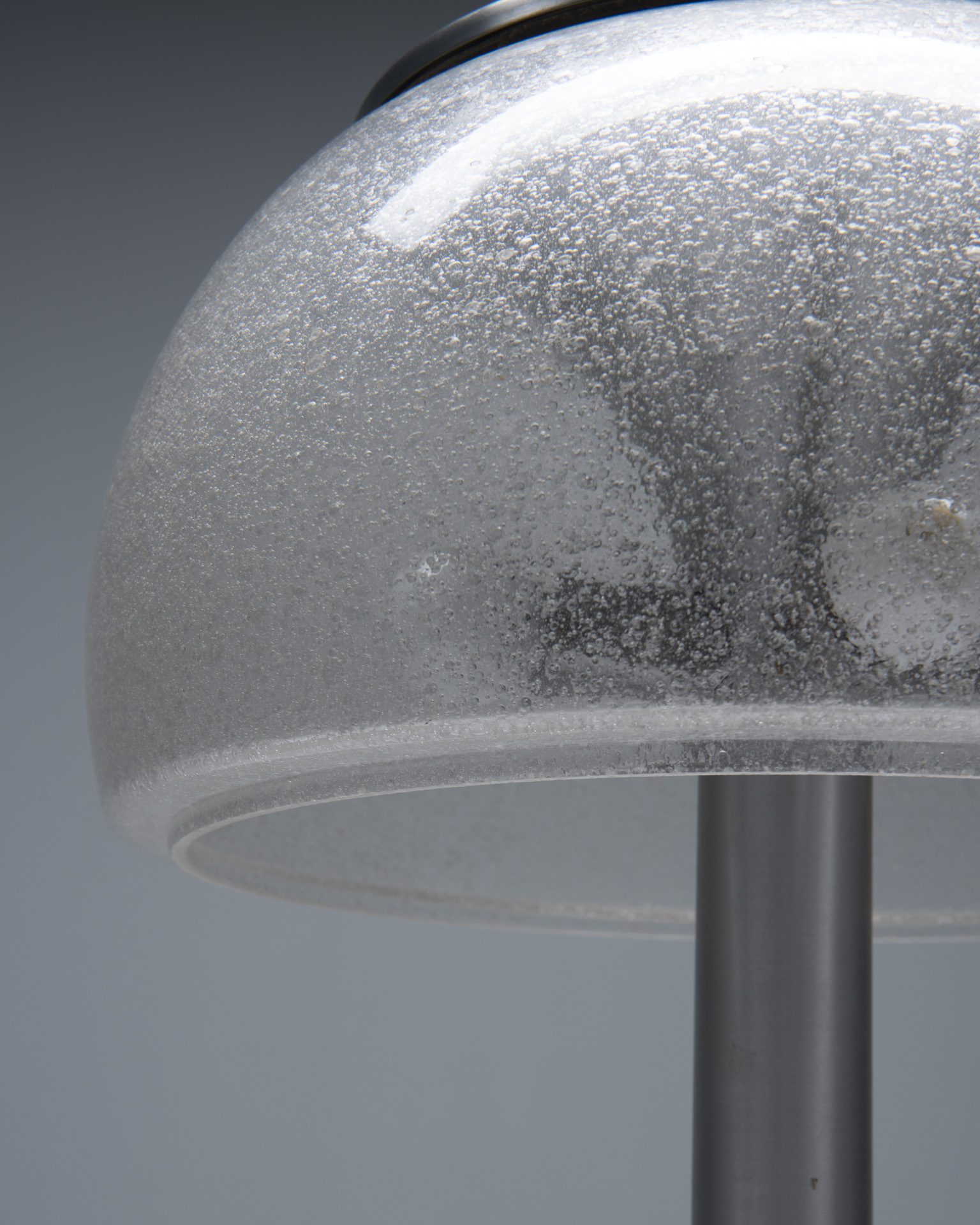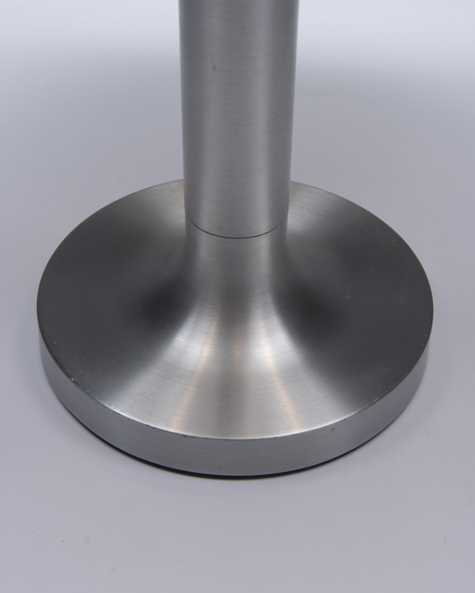 Une lampe de table rare, fabriquée dans les années 1960 par Temde, Allemagne. Elle se compose d'une base en aluminium brossé sur laquelle repose un dôme en verre bullé. La lampe a 5 prises E14 au total, 4 sous le dôme en verre, 1 au-dessus. Les deux peuvent être allumées séparément. Pour la douille supérieure, il est recommandé d'utiliser une ampoule miroir pour un éclairage optimal. Cet article est dans son état d'origine et présente peu de traces d'usure telles que des rayures.