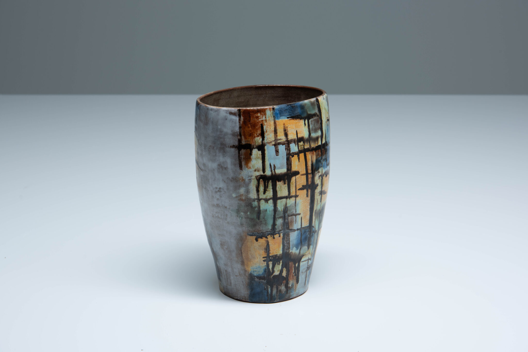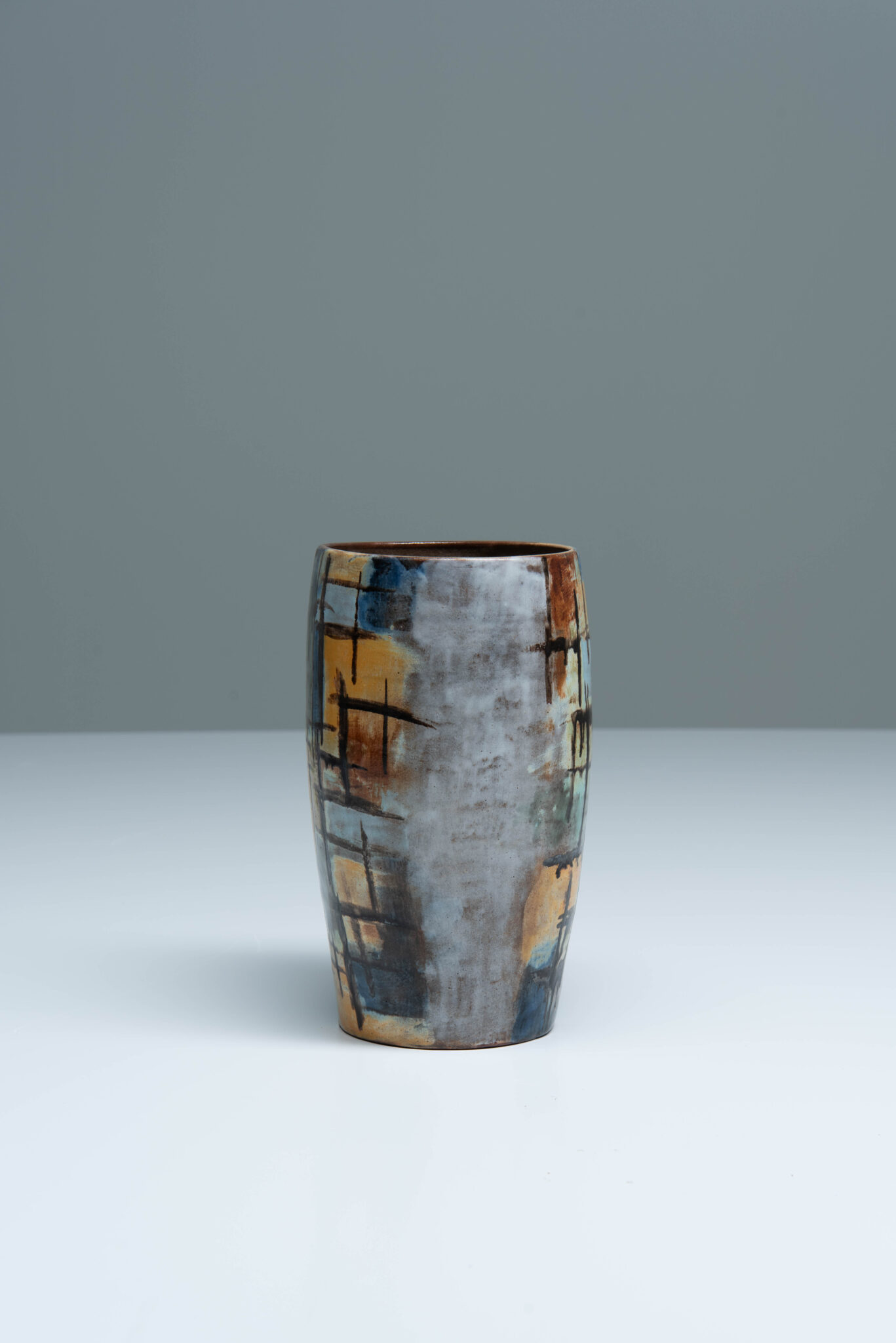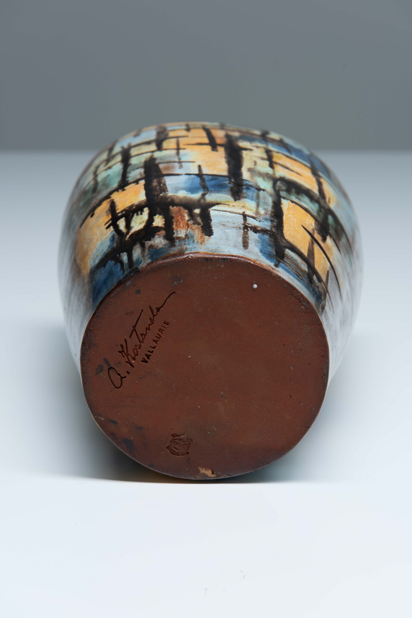 Vase décoratif en céramique réalisé par Alexandre Kostanda à Vallauris, en France. Cette pièce est rare car elle s'éloigne de son style habituel et utilise une palette de couleurs plus vibrantes sur les deux faces. Signé "A. Kostanda Vallauris" sur le fond.