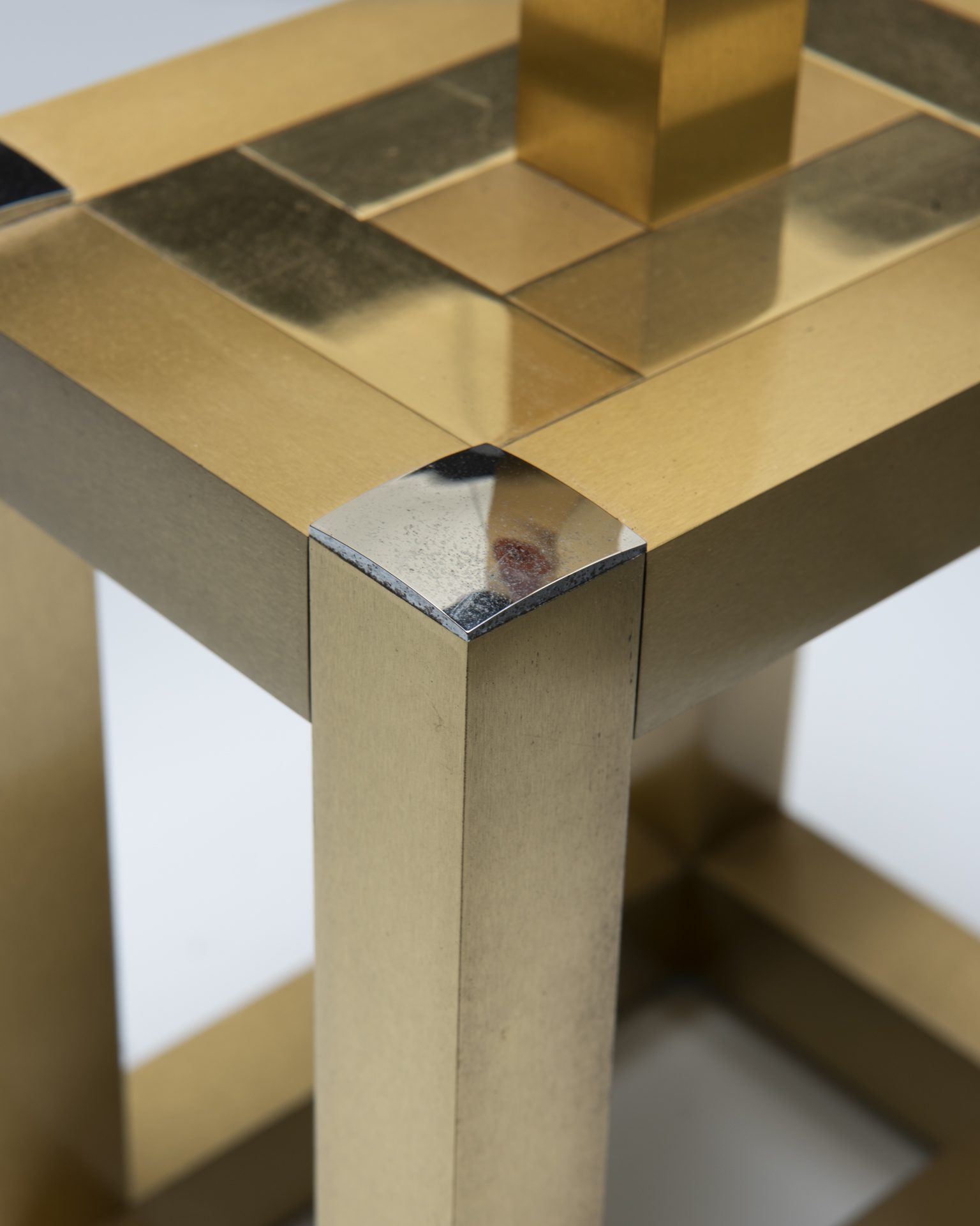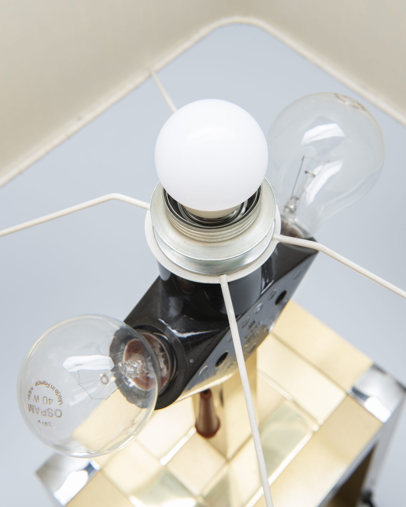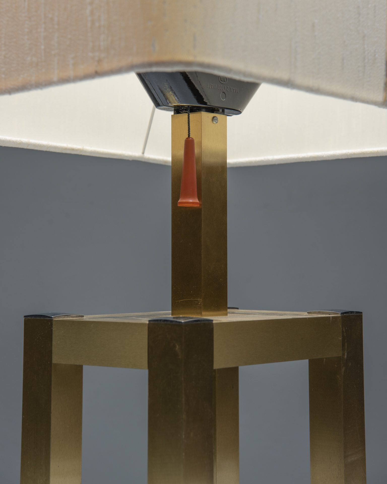 De lamp bestaat uit een kubusvormige messing voet met verchroomde onderdelen en een beige kap. In de fitting passen 3 E27 lampen, die afzonderlijk kunnen worden aangestoken. Eén kant van de kap is iets donkerder gekleurd dan de andere kanten. De lamp is in originele vintage staat met enkele gebruikssporen die te wijten zijn aan leeftijd en gebruik.
