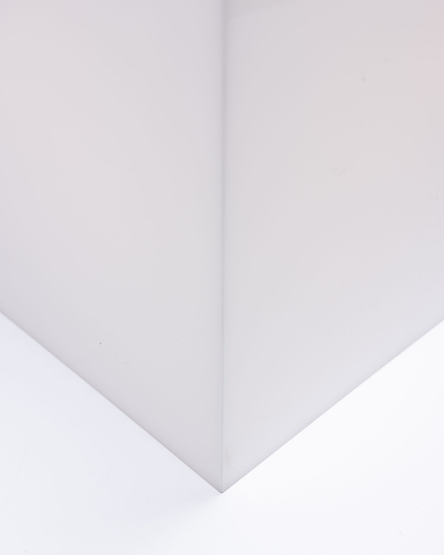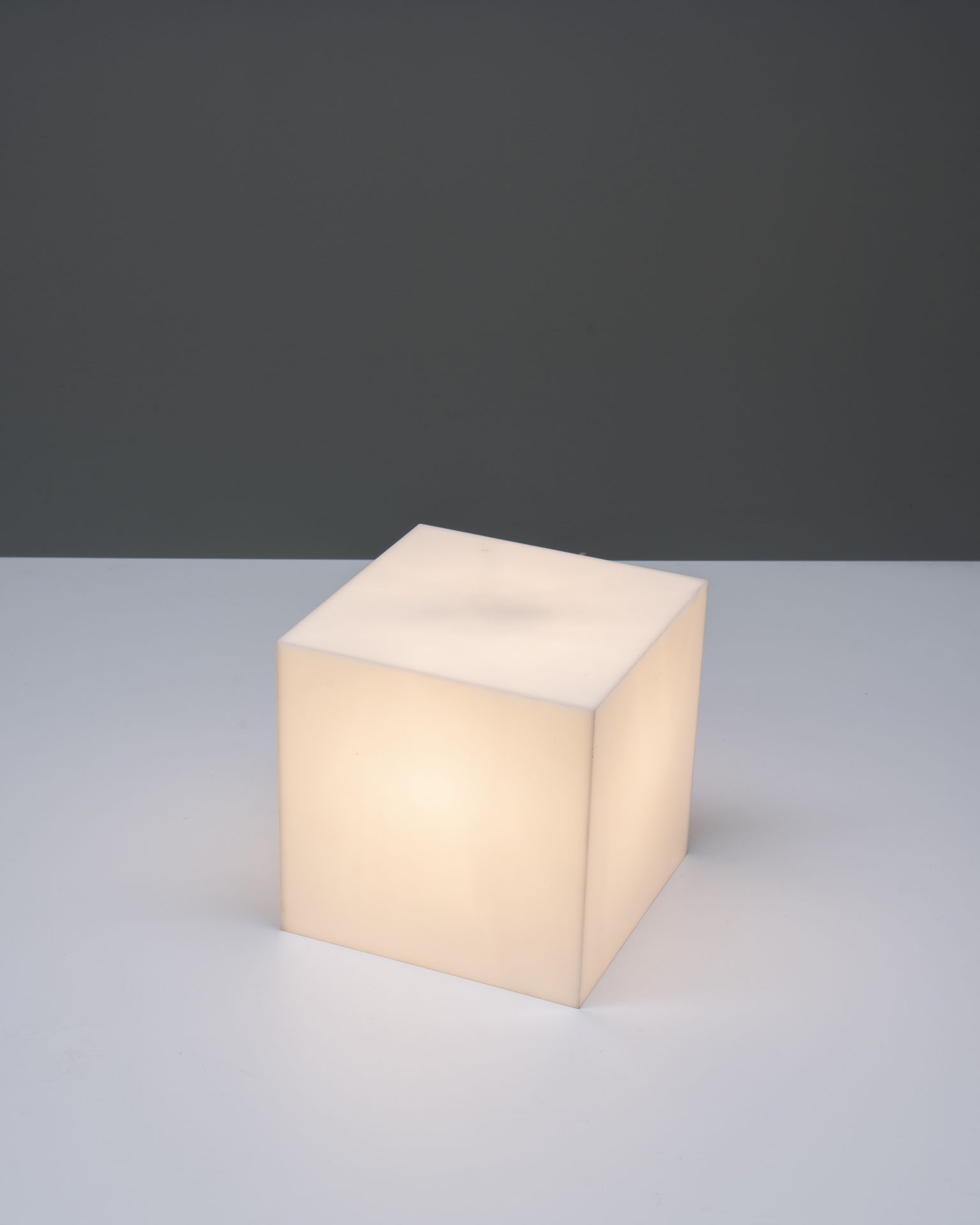Een kubusvormige bureaulamp, vervaardigd in de jaren 1980 door Harco Loor, Nederland. De lamp is gemaakt van plexi en geeft een sfeervol, diffuus licht. De lamp heeft één E27 fitting. Op wat krasjes na is de lamp in zeer goede staat.