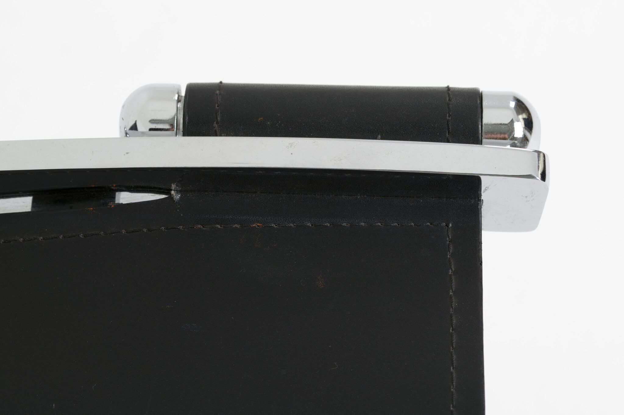 Het frame is gemaakt van verchroomd staal. Hierop is het zwarte leer gestikt en het wordt op zijn plaats gehouden door zes cilindervormige stukken. De stoelen hebben een elegant maar eenvoudig ontwerp, waarbij de nadruk ligt op Citterio's principes van functionaliteit en esthetiek.