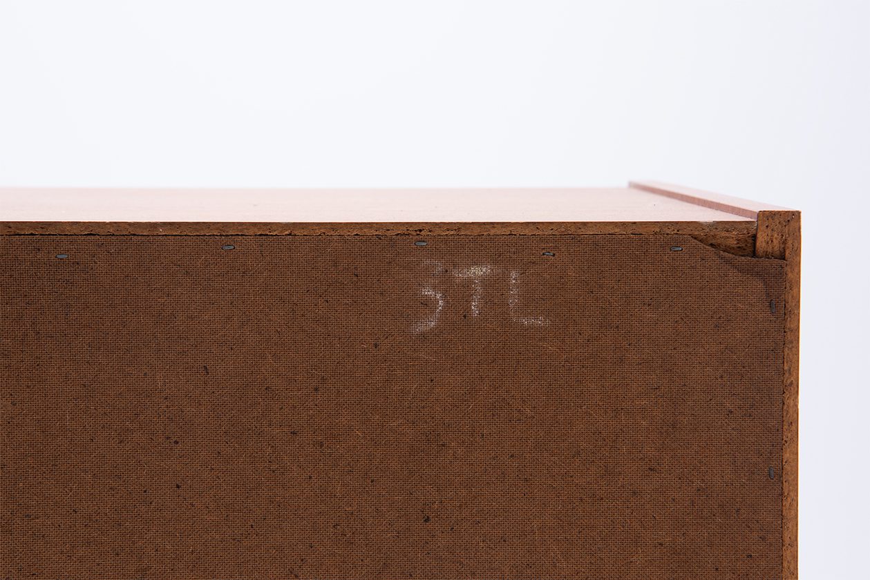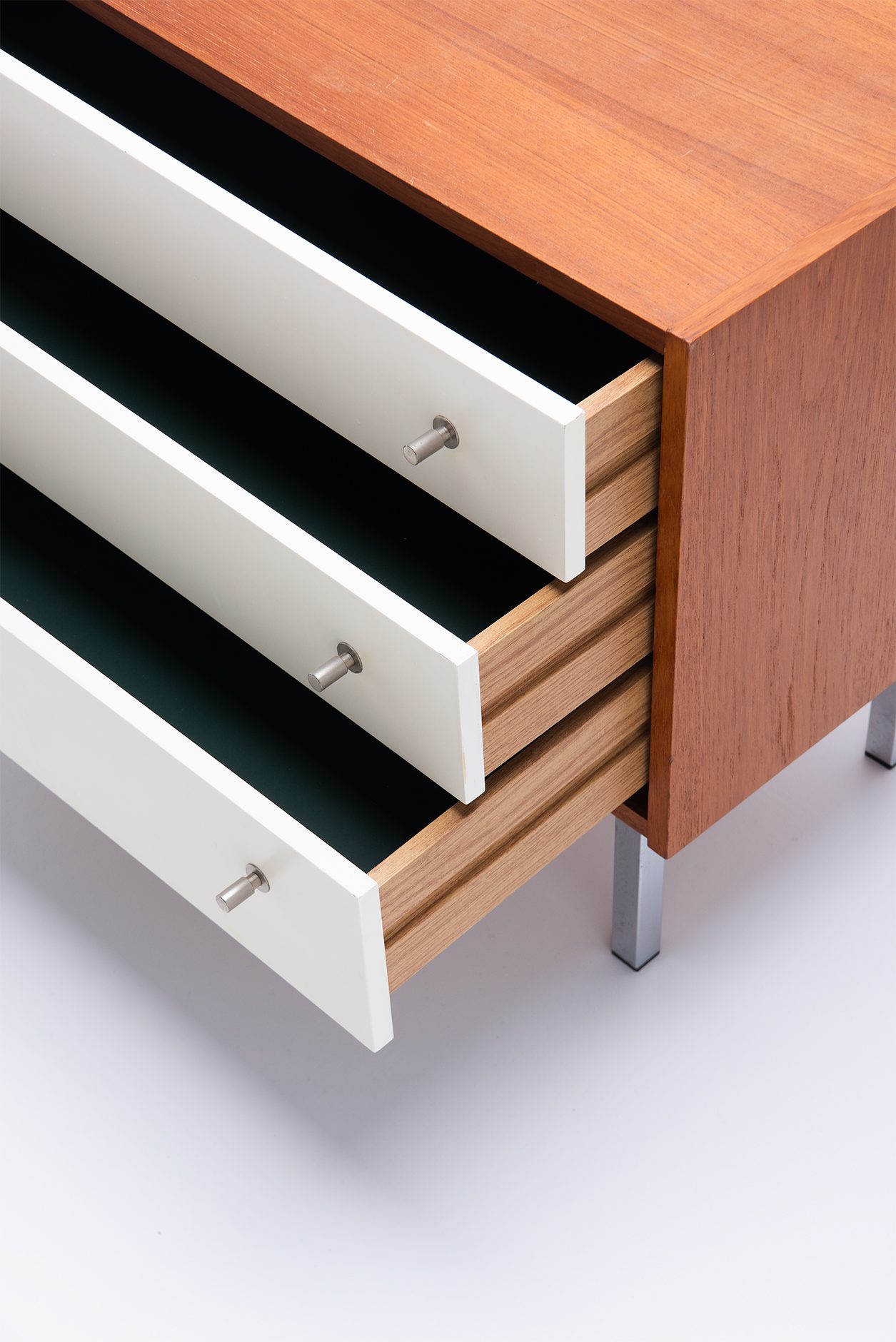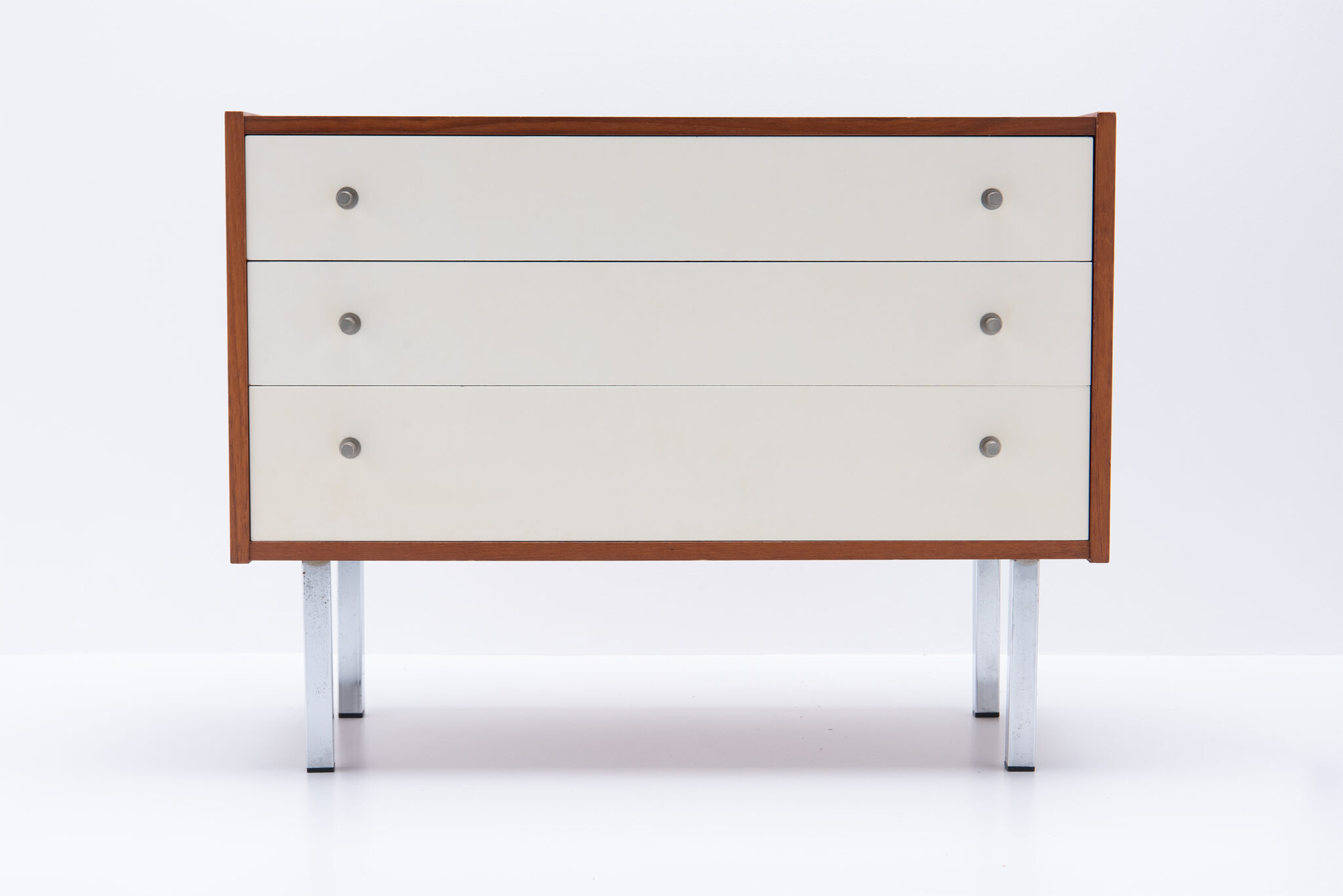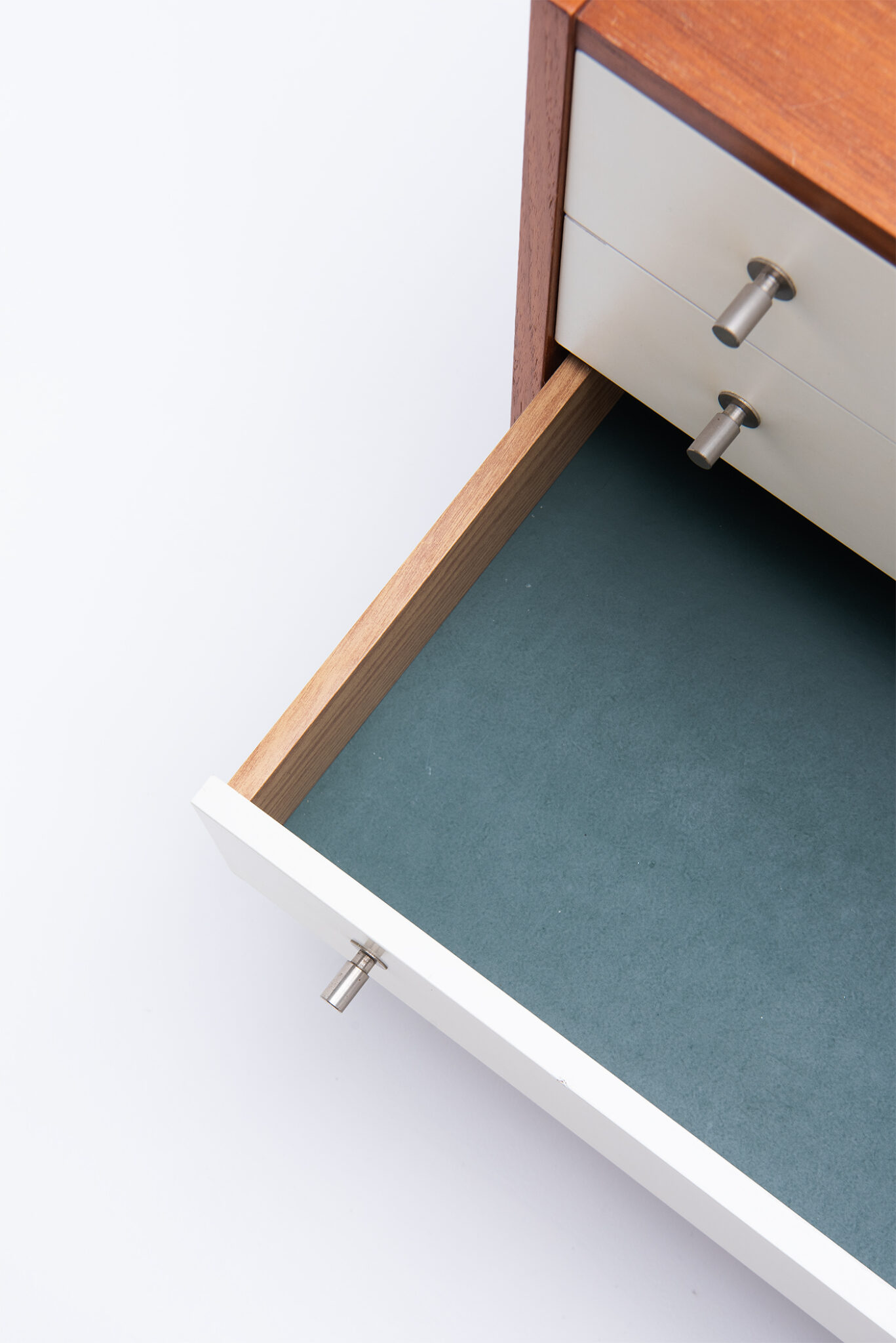Een moderne ladekast gemaakt van teakhout en afgewerkt met wit gelakte laden. De deurknoppen zijn gemaakt van nikkel en de poten zijn verchroomd. Het ontwerp is van Anton Slotboom voor Lockwood en dateert uit de jaren 1960. De ladekast verkeert in een goede originele staat en vertoont lichte gebruikssporen die passen bij de leeftijd en het gebruik.