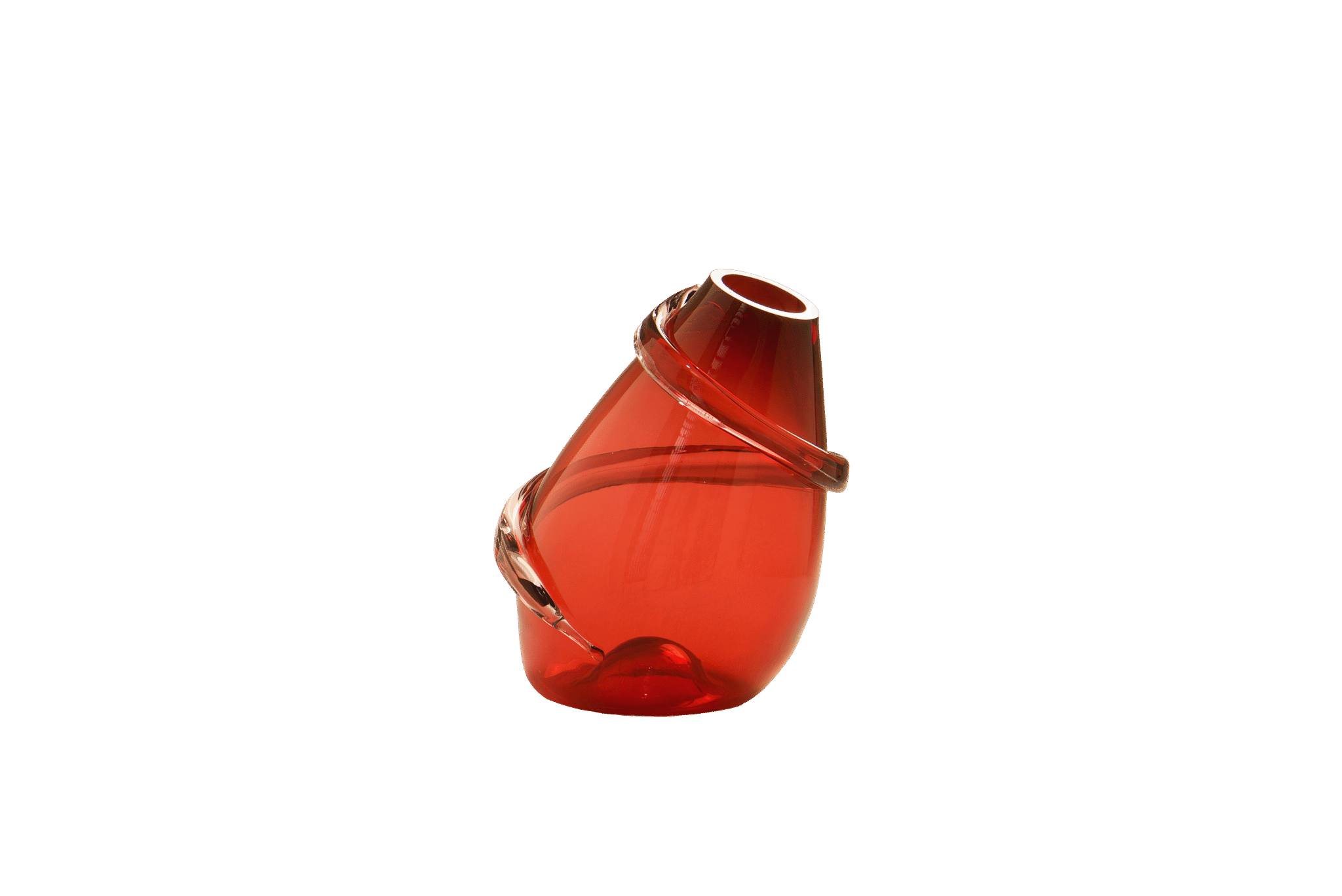 De vaas heeft een hoekige, leunende houding in plaats van een verticale, wat wordt geaccentueerd door de spiraal die eromheen is geplaatst. De kleur verloopt in een gradiënt, van lichtrood naar intenser rood.