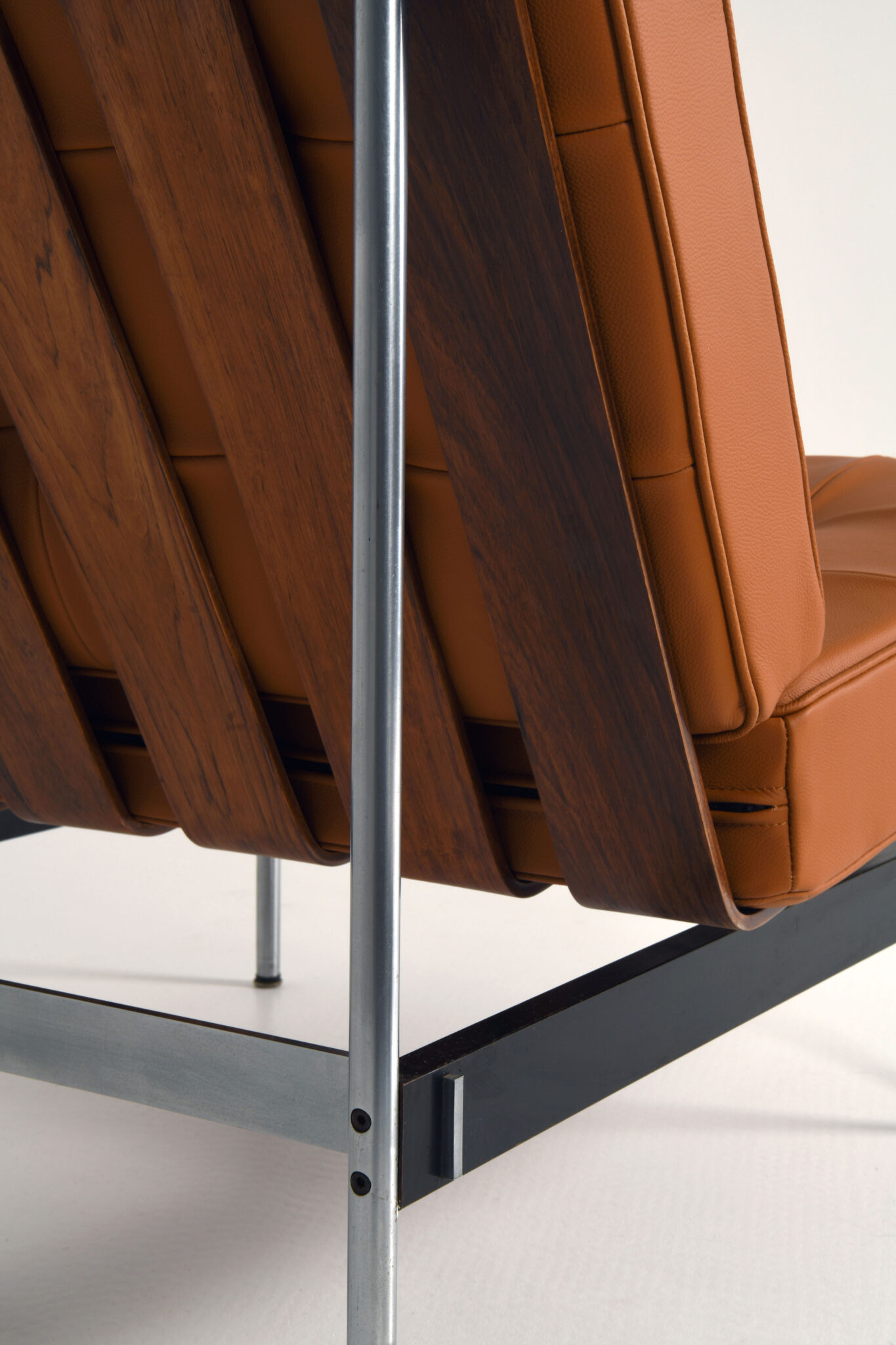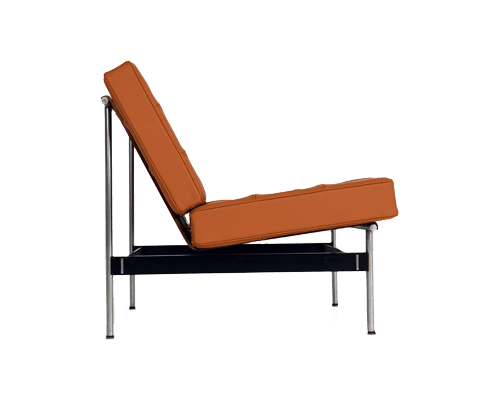 De 'F416' fauteuil vertegenwoordigde een nieuwe manier van ontwerpen toen hij voor het eerst werd geïntroduceerd, een combinatie van zachte materialen en stijve structuren. Het frame is gemaakt van geborsteld roestvrij staal, zwart gecoat metaal en multiplex latten. De kussens zijn opnieuw bekleed met Panama leer.