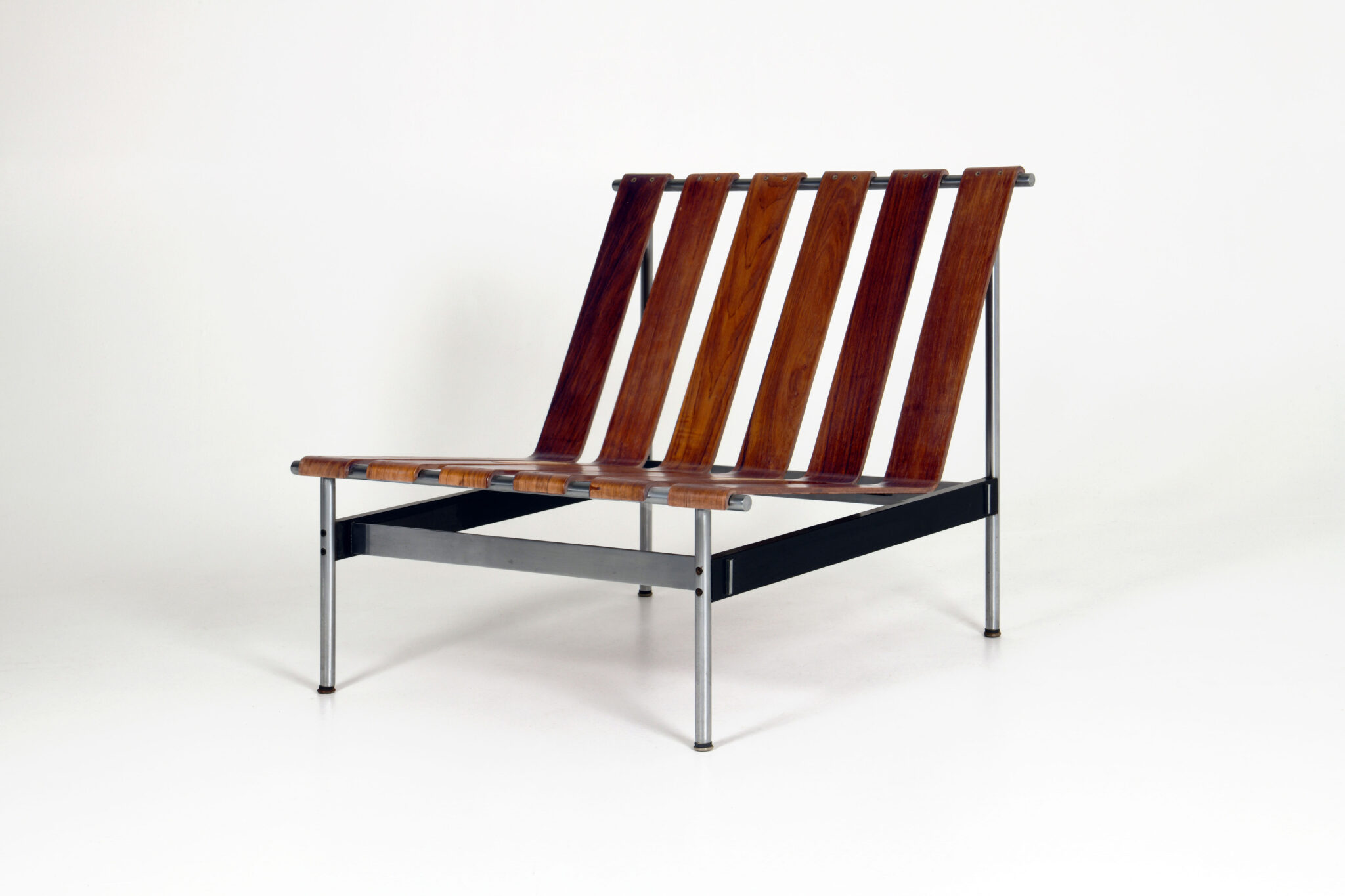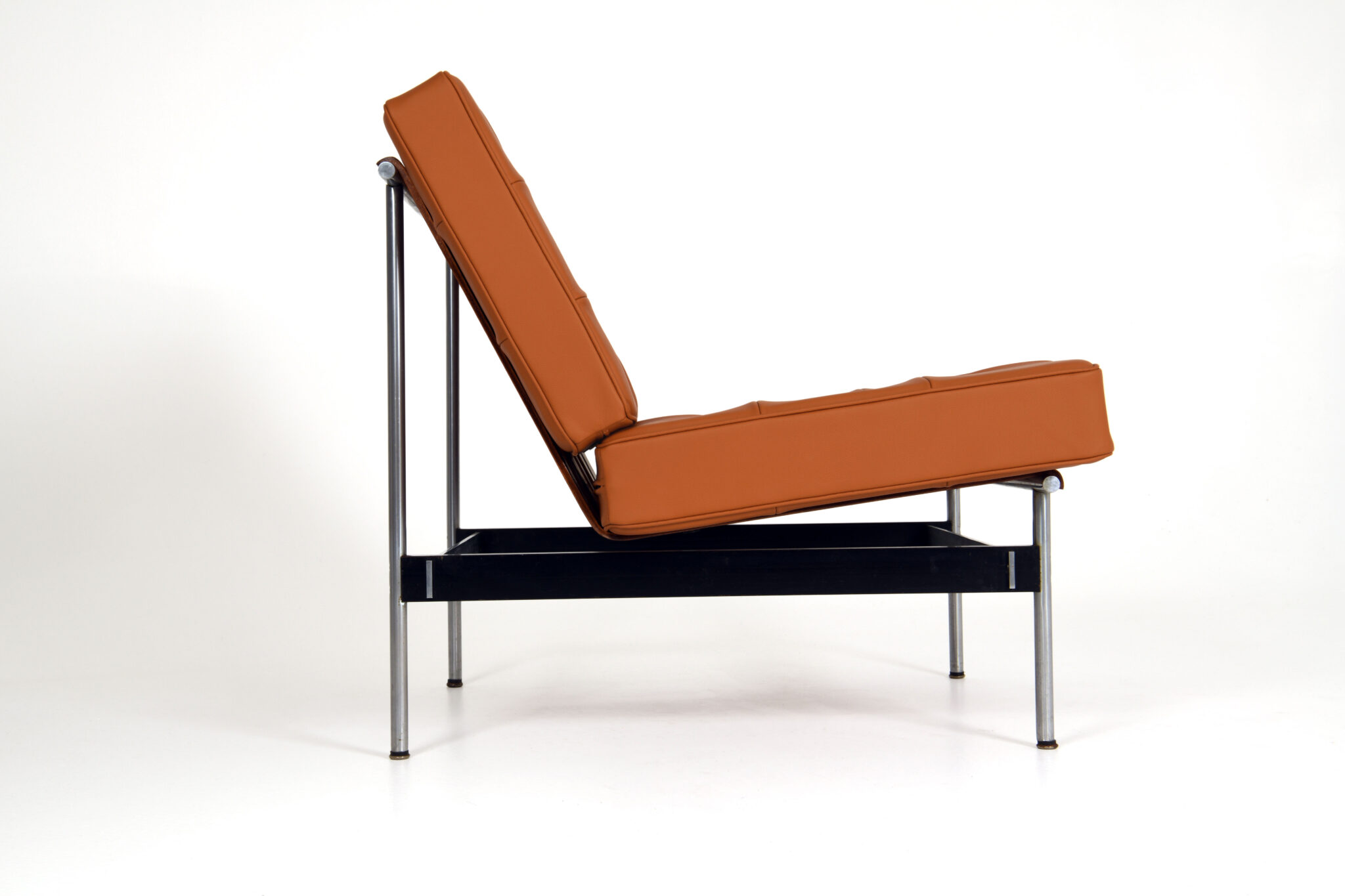 De fauteuil is in zeer goede staat, met slechts kleine gebruikssporen op het metalen onderstel die passen bij de leeftijd.