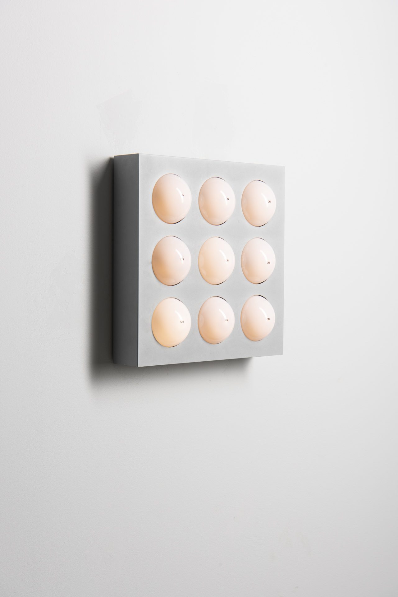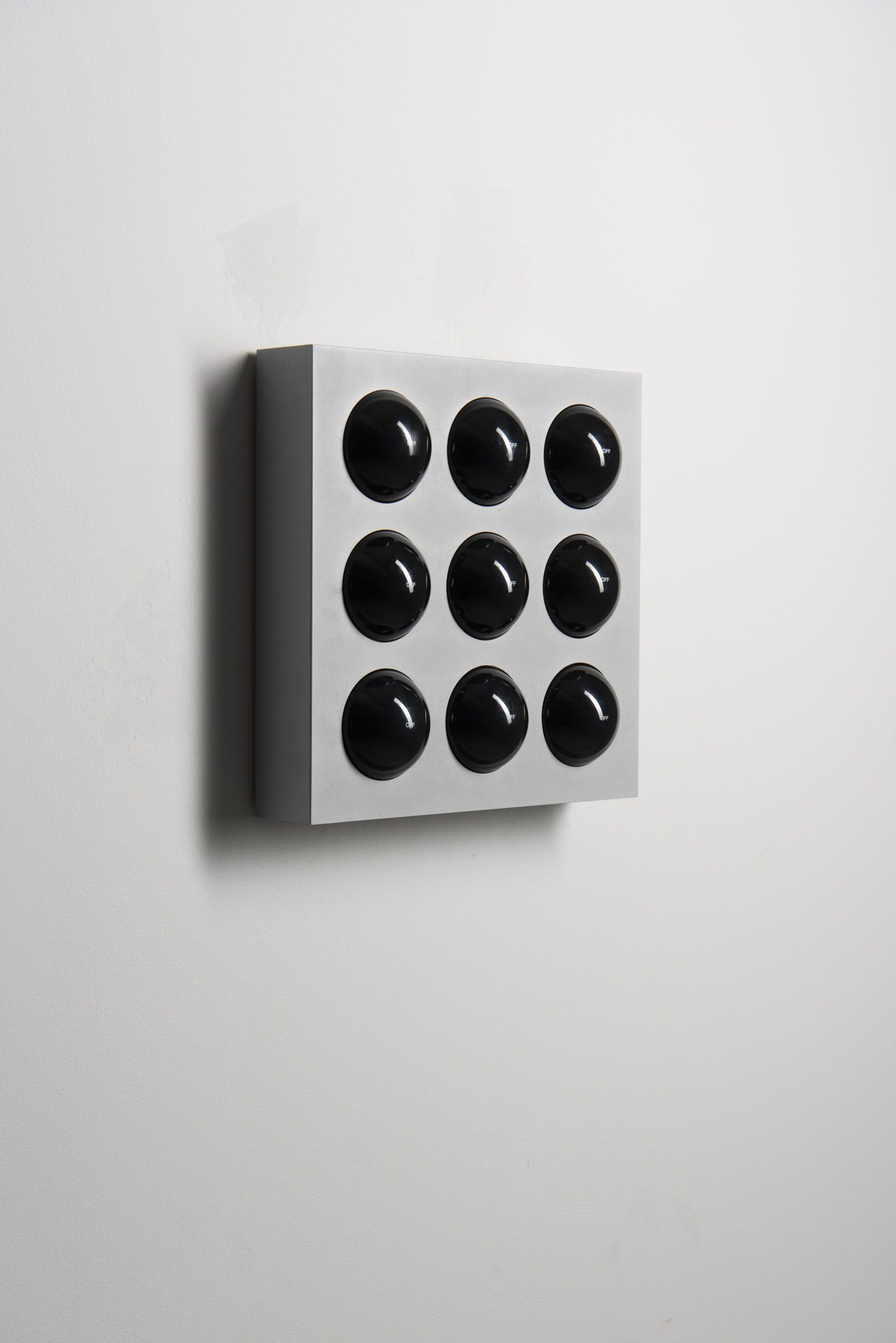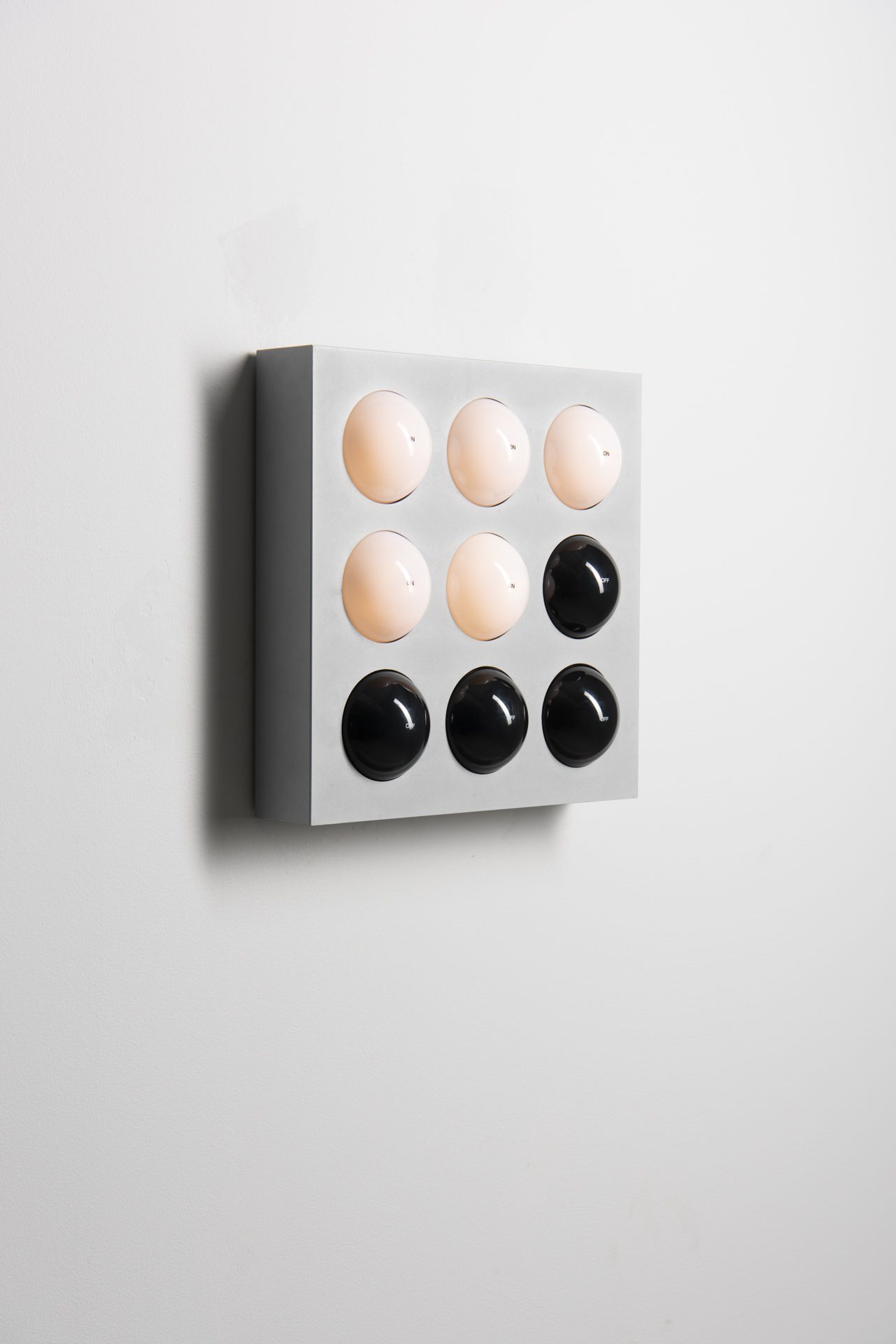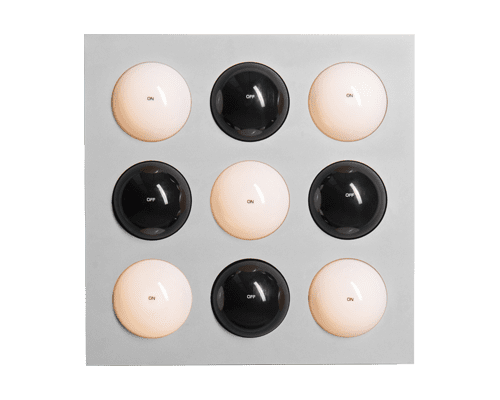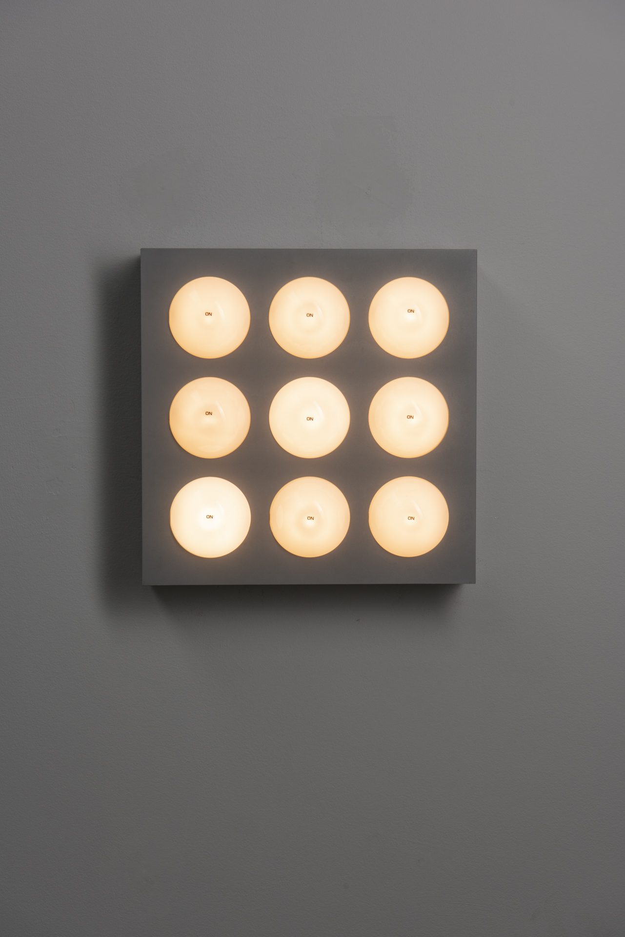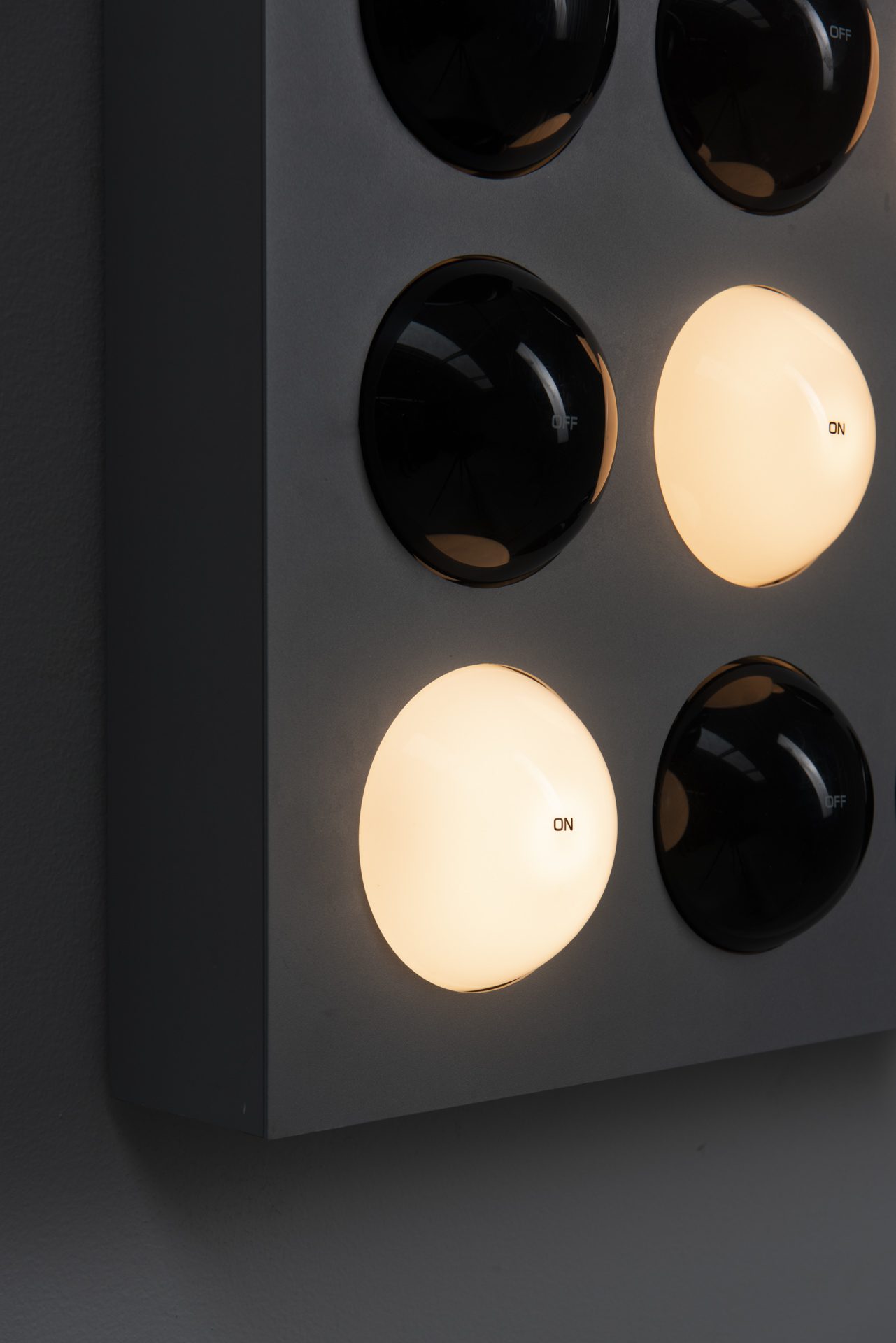 De lamp bestaat uit een aluminium frame met 9 plastic bollen met "On" of "Off" erop geschreven. De bollen kunnen in verschillende patronen worden gedraaid. Dit item is in zeer goede staat.