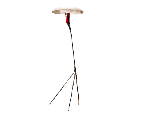 Het toont een slanke grijze metalen arm verankerd aan een driepoot basis, wiegend een levendige rode metalen kegel met de gloeilamp genesteld onder een slanke witte schijfvormige kap. Het minimalistische ontwerp is doordrenkt met een heerlijk oog voor detail. Opvallend is de perforatie in het midden van de kap, waardoor het licht een opwaartse gloed uitstraalt als het brandt. Het resultaat is een prachtig verspreid, zacht diffuus licht dat een vleugje elegantie toevoegt aan elke ruimte.