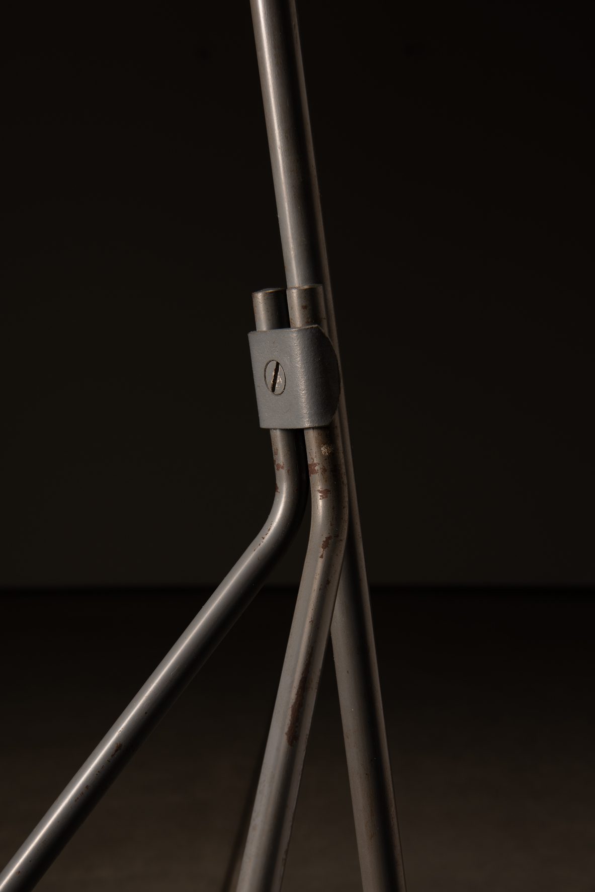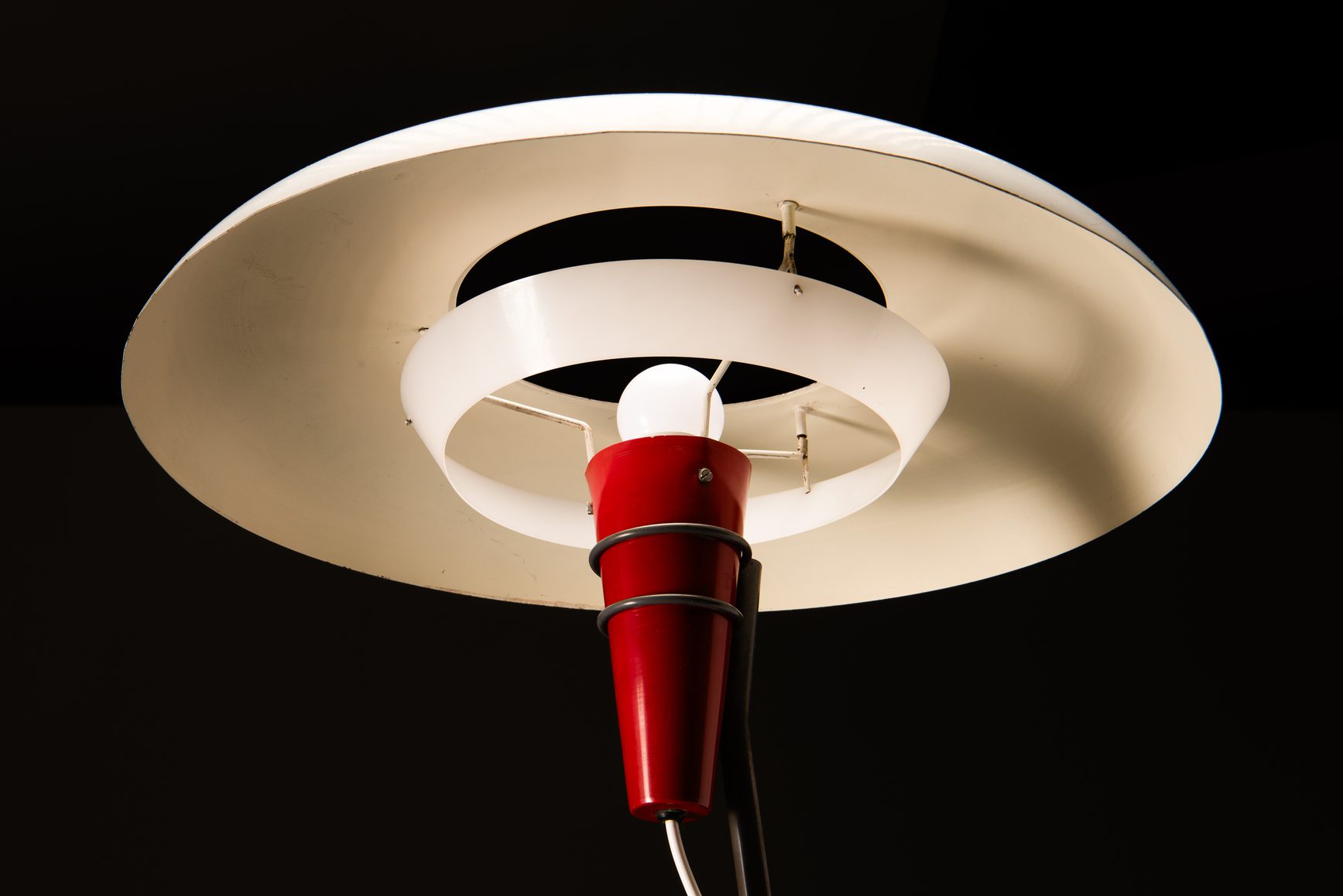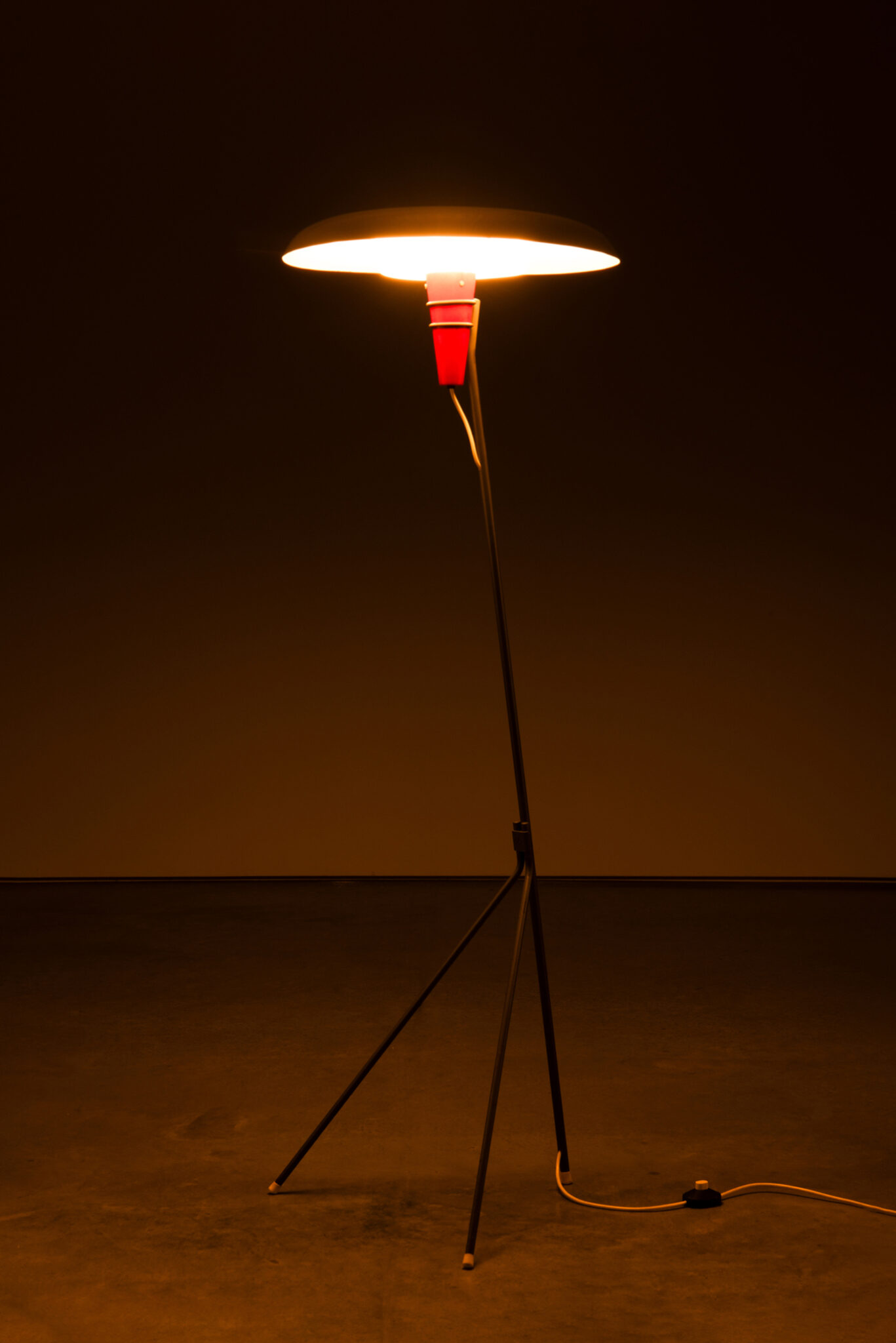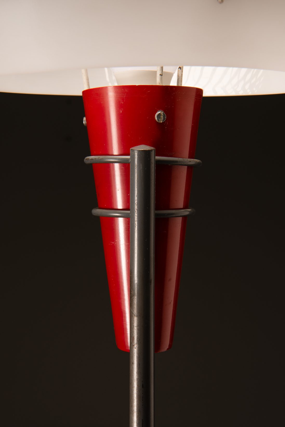 Het toont een slanke grijze metalen arm verankerd aan een driepoot basis, wiegend een levendige rode metalen kegel met de gloeilamp genesteld onder een slanke witte schijfvormige kap. Het minimalistische ontwerp is doordrenkt met een heerlijk oog voor detail. Opvallend is de perforatie in het midden van de kap, waardoor het licht een opwaartse gloed uitstraalt als het brandt. Het resultaat is een prachtig verspreid, zacht diffuus licht dat een vleugje elegantie toevoegt aan elke ruimte.
