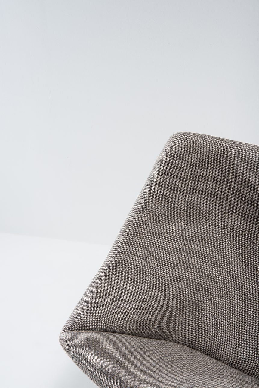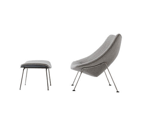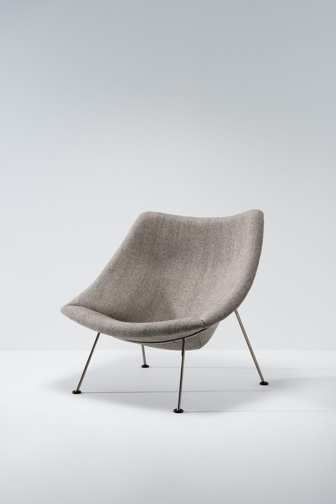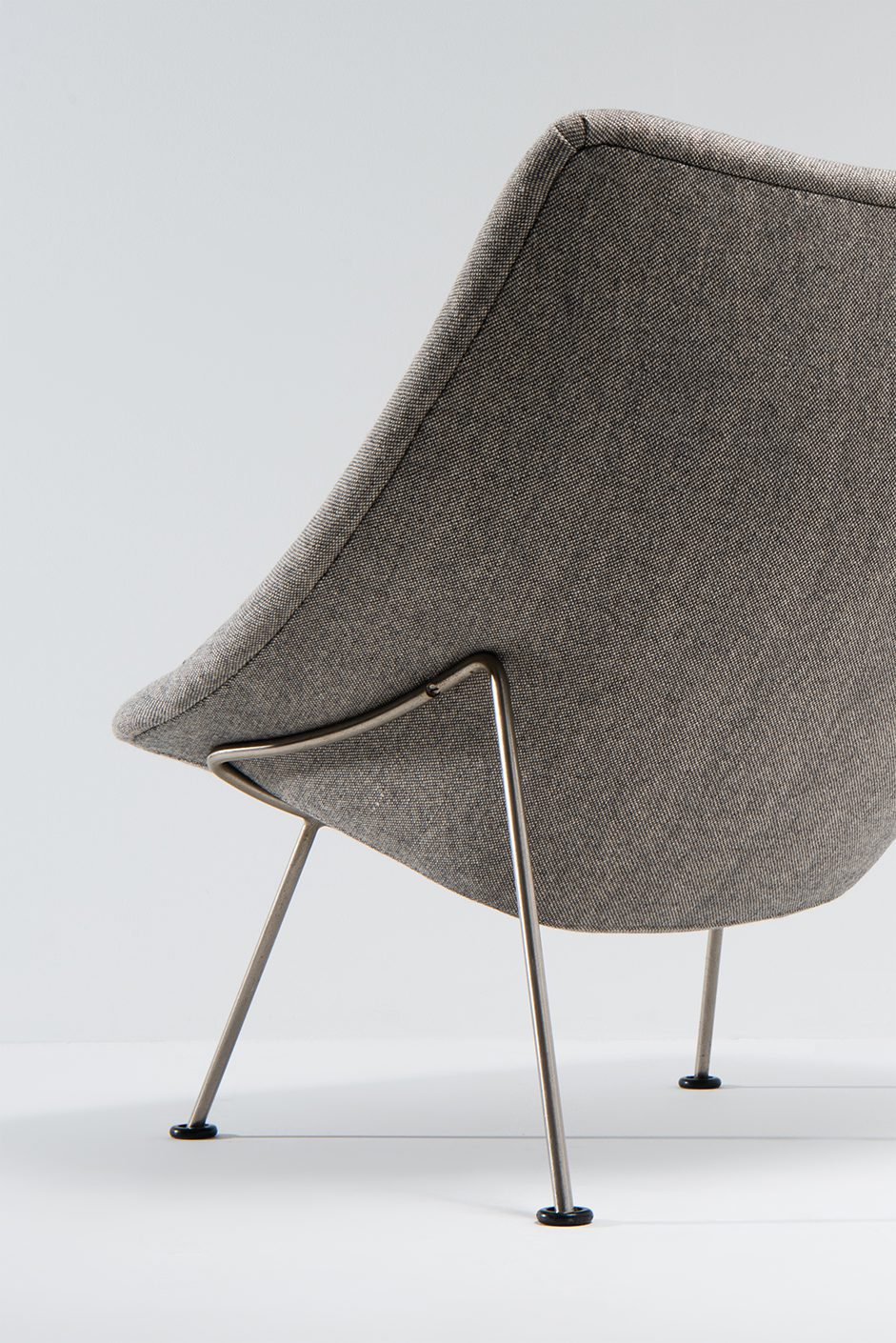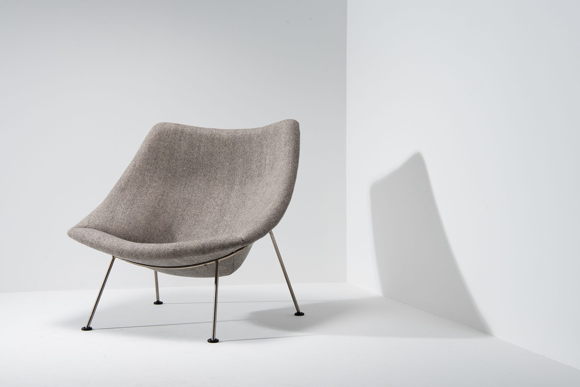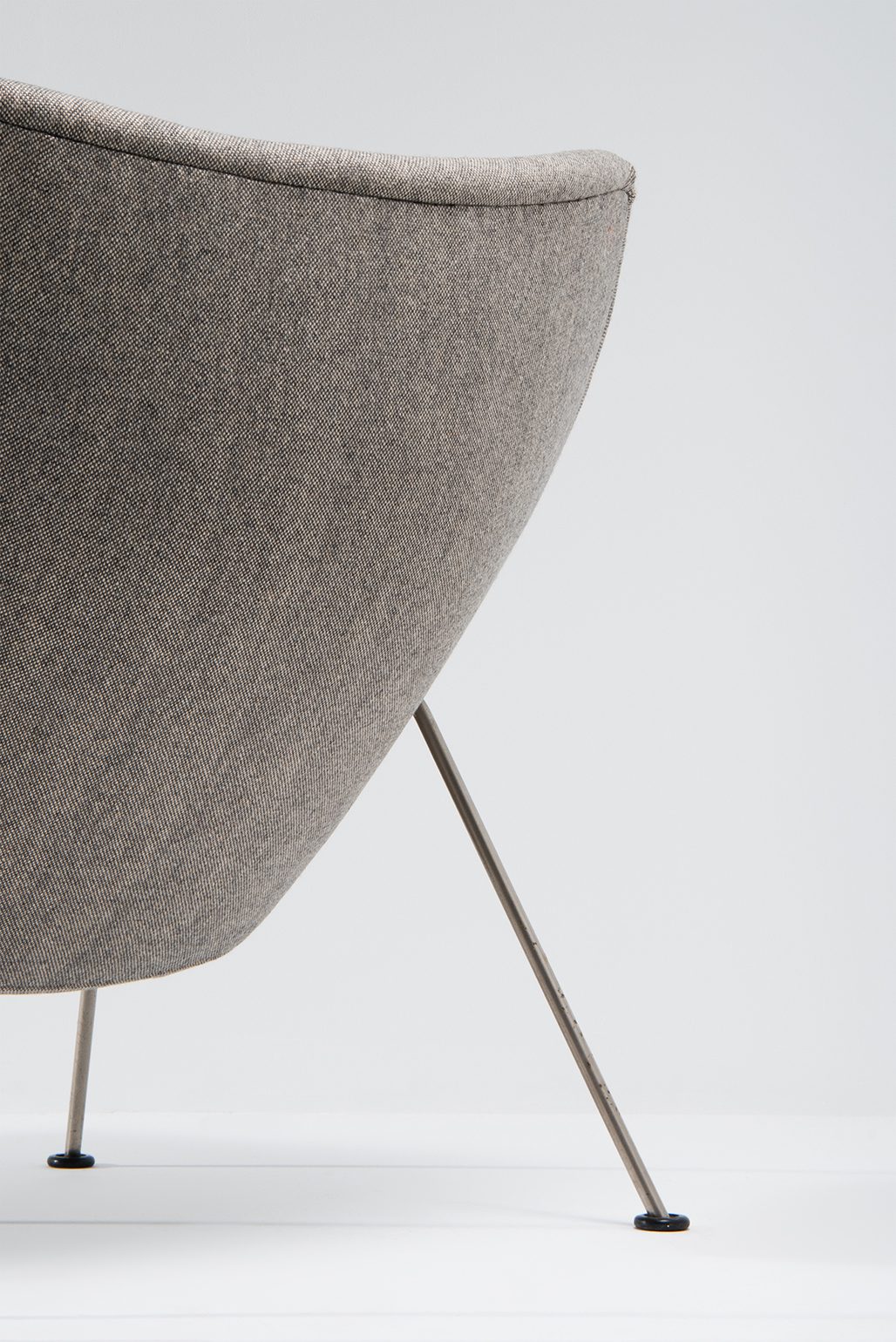 De Oyster Lounge Chair F157 met originele Ottoman, ontworpen door de Franse ontwerper Pierre Paulin voor Artifort Holland in 1959, is een vroege editie met een vernikkeld frame. Hij is volledig gerestaureerd met de stof Hallingdahl van Kvadrat en voorzien van nieuw schuim van hoge kwaliteit. De herstoffering is vakkundig uitgevoerd door een professionele stoffeerder.