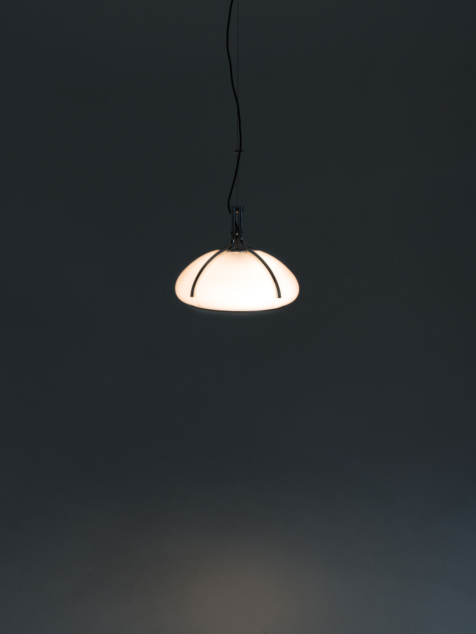 Deze Quadrifoglio hanglamp bestaat uit een witte acryl lampenkap die ondersteund wordt door vier verchroomde metalen stangen. Aan de binnenkant vinden we een verchroomde reflector waarin de gloeilamp is geplaatst.