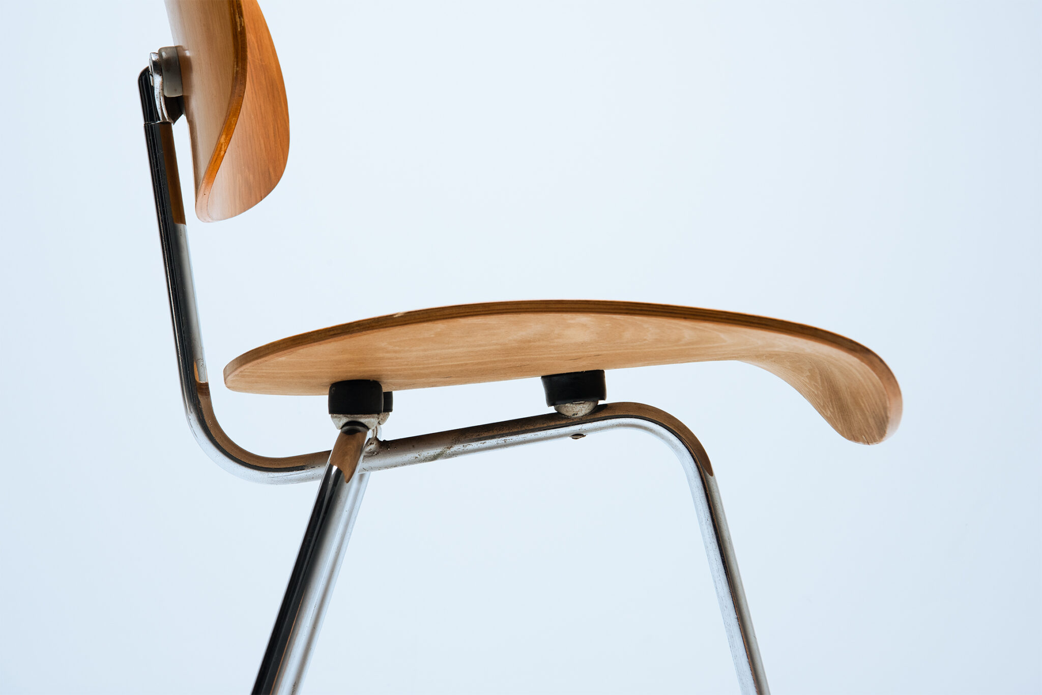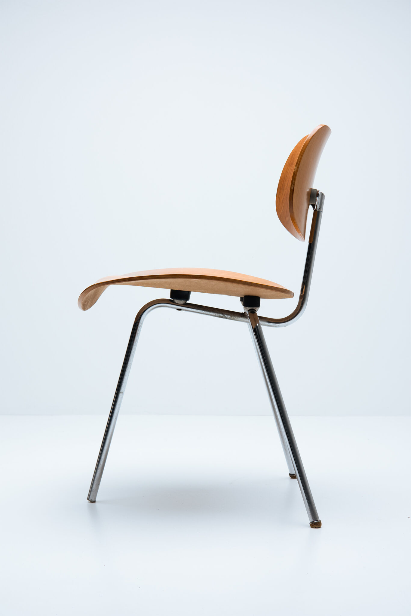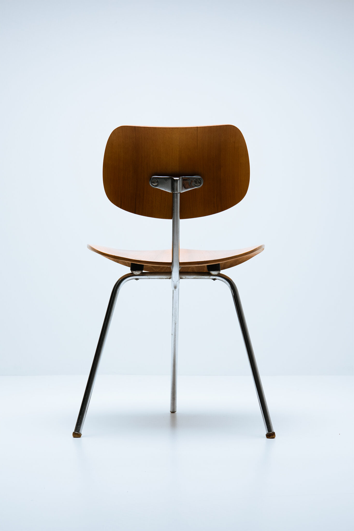 Een uiterst zeldzaam paar driepootstoelen, model "SE 69", ontworpen door Egon Eiermann in de jaren 1950 voor Wilde & Spieth, Esslingen (Duitsland). Dit model werd slechts een of twee jaar geproduceerd voordat het uit de catalogus van de fabrikant werd gehaald. Verchroomd stalen buisframe met rubberen poten, zitting en rugleuning van multiplex met walnootfineer. De stoelen hebben nog het originele papieren label onder de zitting. Lit: Egon Eiermann, Badisches Landesmuseum Karlsruhe 1999, p. 93 - W. Schirmer, Egon Eiermann 1904-1970, Stuttgart 1993. Opmerking: Een van de rubberen voetjes ontbreekt en de stoelen vertonen ouderdomssporen. Let op: De prijs is voor één stoel.
