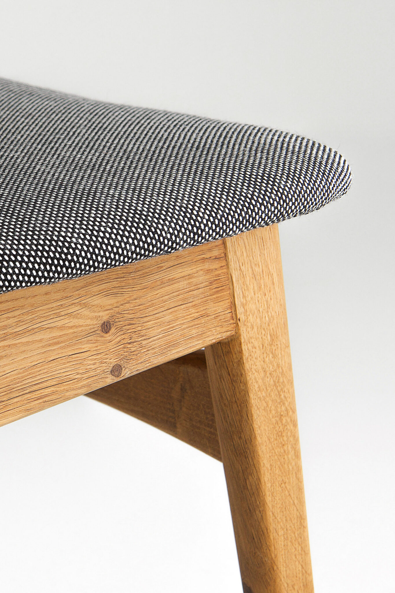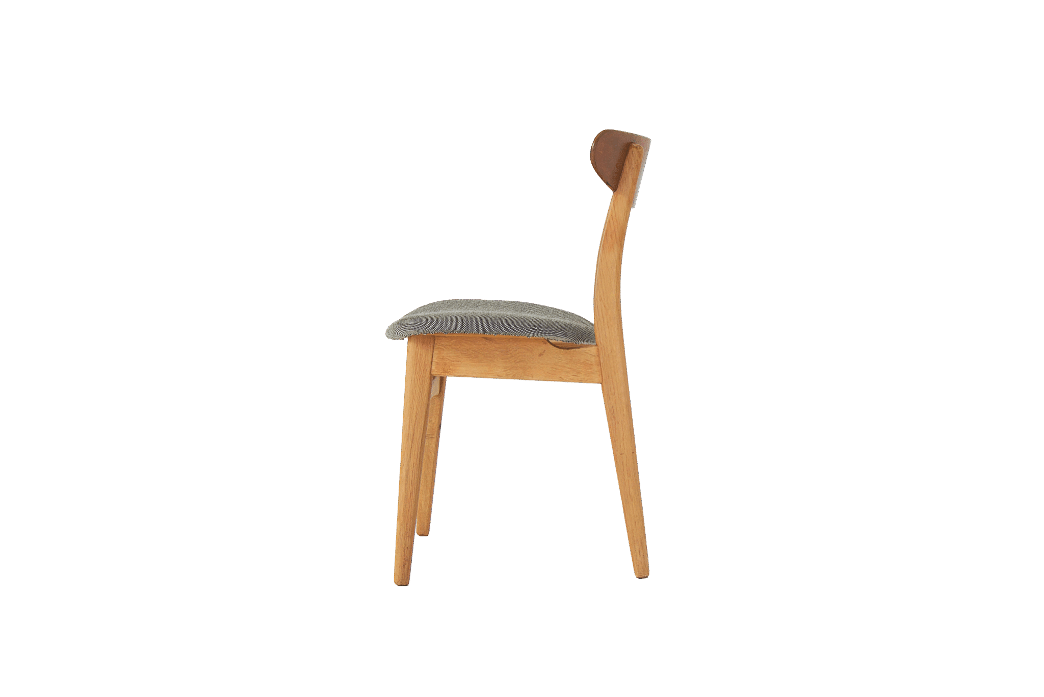 Dit is een originele productie uit de jaren 50 en is uitgevoerd in eikenhout in combinatie met rugleuningen in teakhout. De gestoffeerde zittingen in Kvadrat stof zijn recentelijk gedaan.