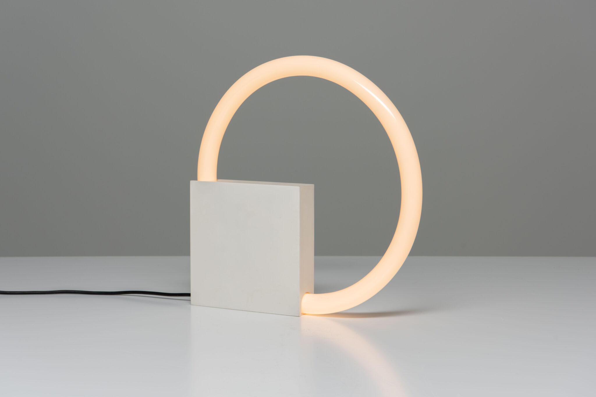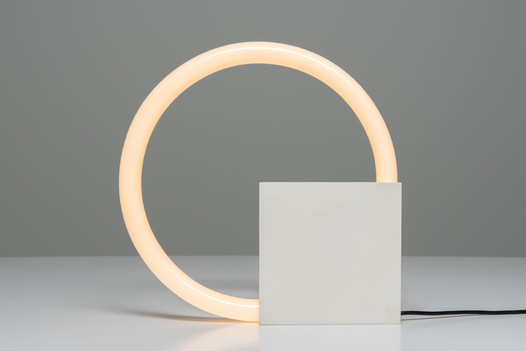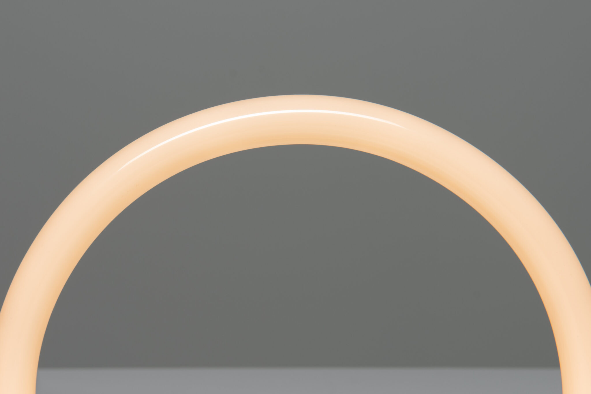 Vroege editie van de cirkelvormige buisvormige tafellamp van Aldo van den Nieuwelaar, 1969 in Amsterdam. Van den Nieuwelaar was erg tevreden met deze lamp, omdat het perfect het ontwerpcredo weerspiegelt dat hem inspireerde; "Less is more".