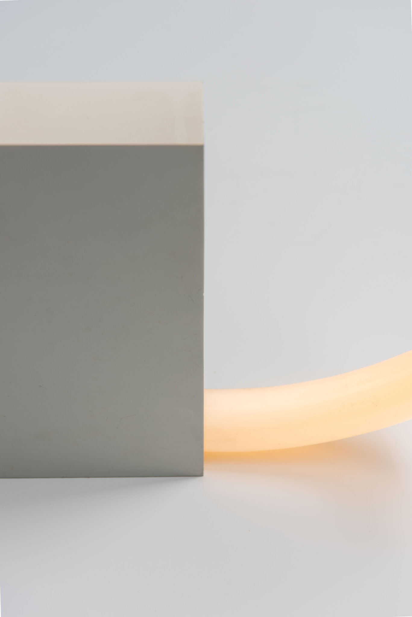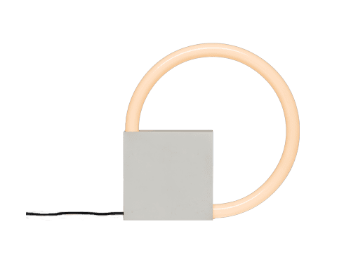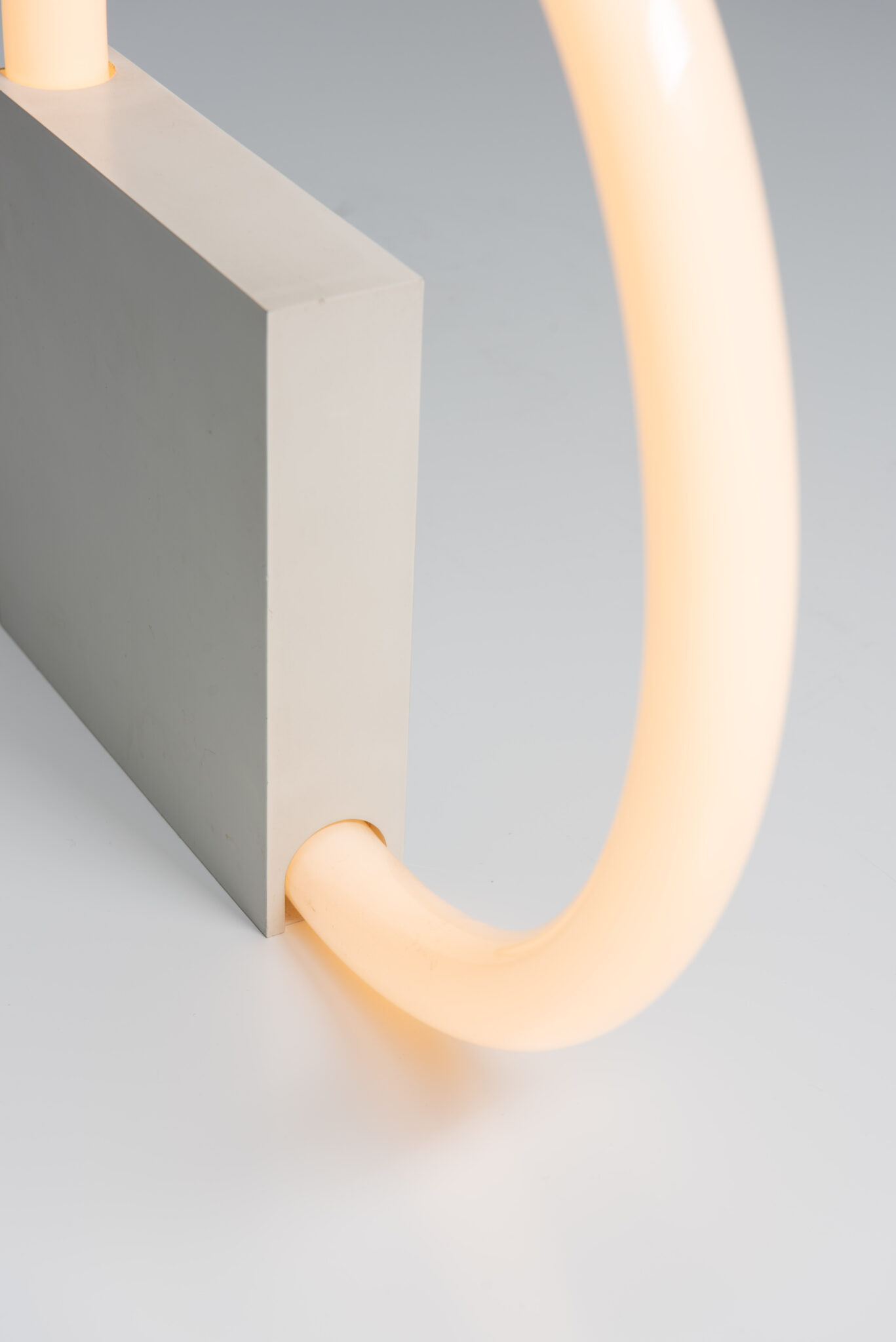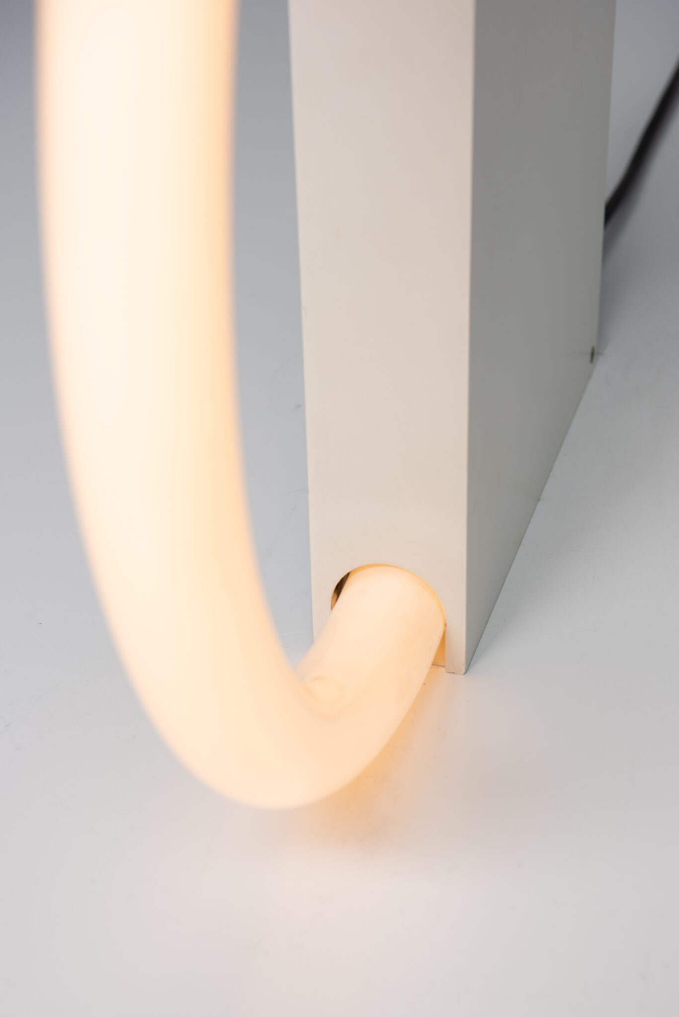 De ronde fluorescerende lamp is eenvoudig maar opvallend en past in de witgelakte stalen voet.