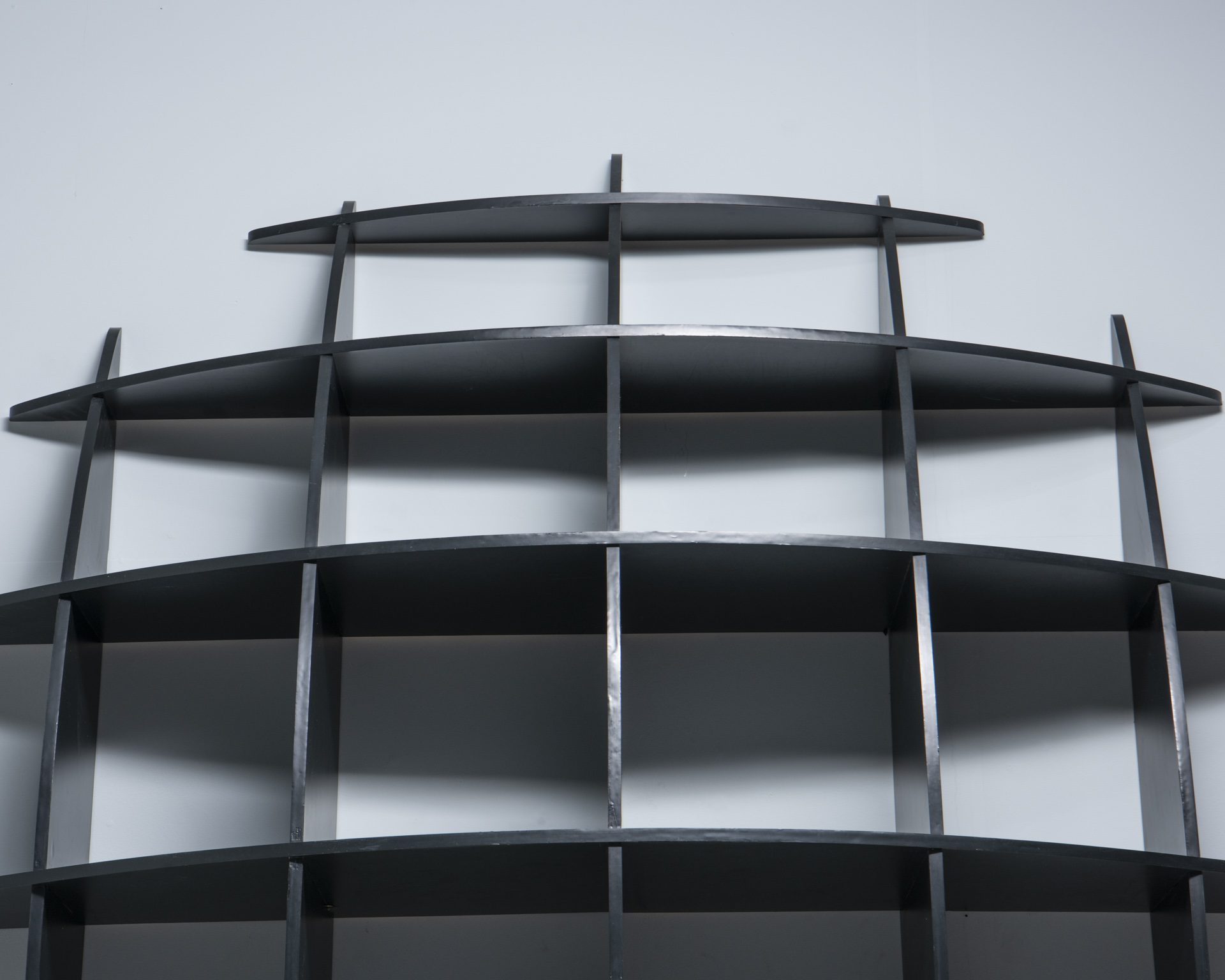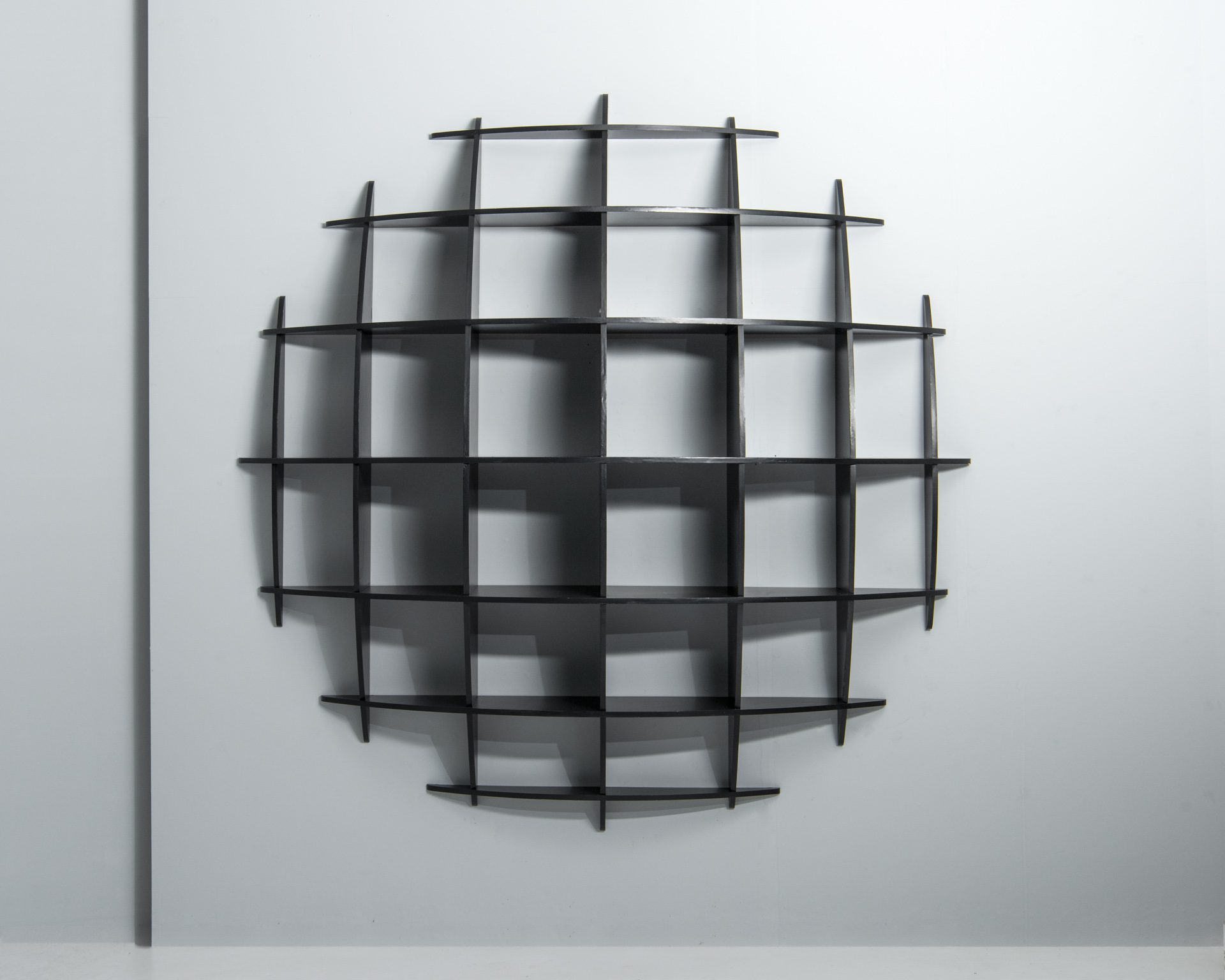 Een prachtig, groot 'Tyco' wandmeubel, ontworpen in de jaren 1970 door Manfredo Massironi. Vervaardigd door Nikol International, Italiƫ. Het bestaat uit 7 horizontale en 7 verticale gelakte multiplex elementen die in elkaar geschoven zijn, waardoor er 26 opslagcapaciteiten met verschillende dieptes ontstaan. De gemonteerde kast is echt indrukwekkend vanuit elke hoek. Zoals op de foto's te zien is, is dit wandmeubel nog in originele vintage staat, met redelijk wat gebruikssporen.