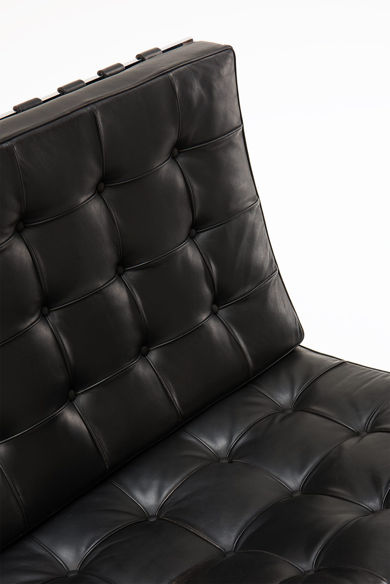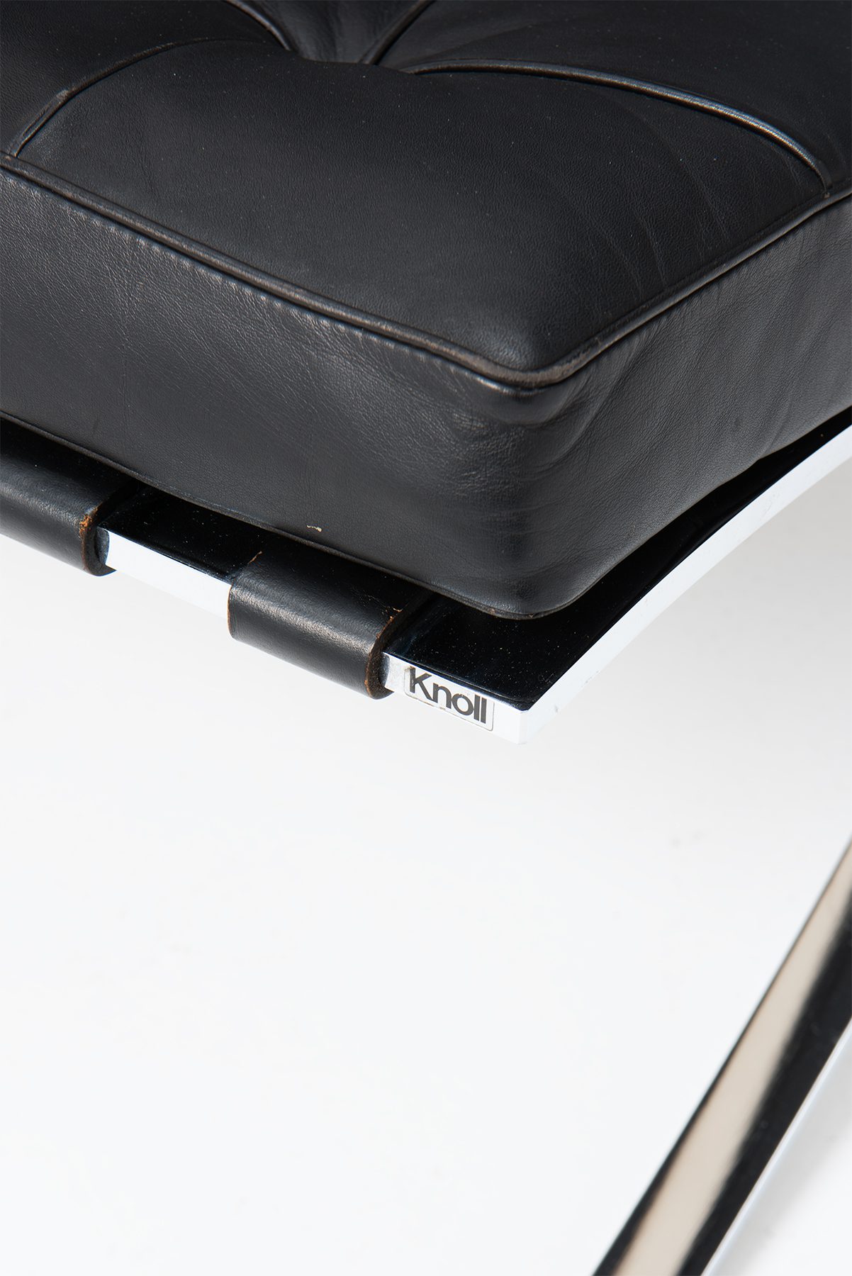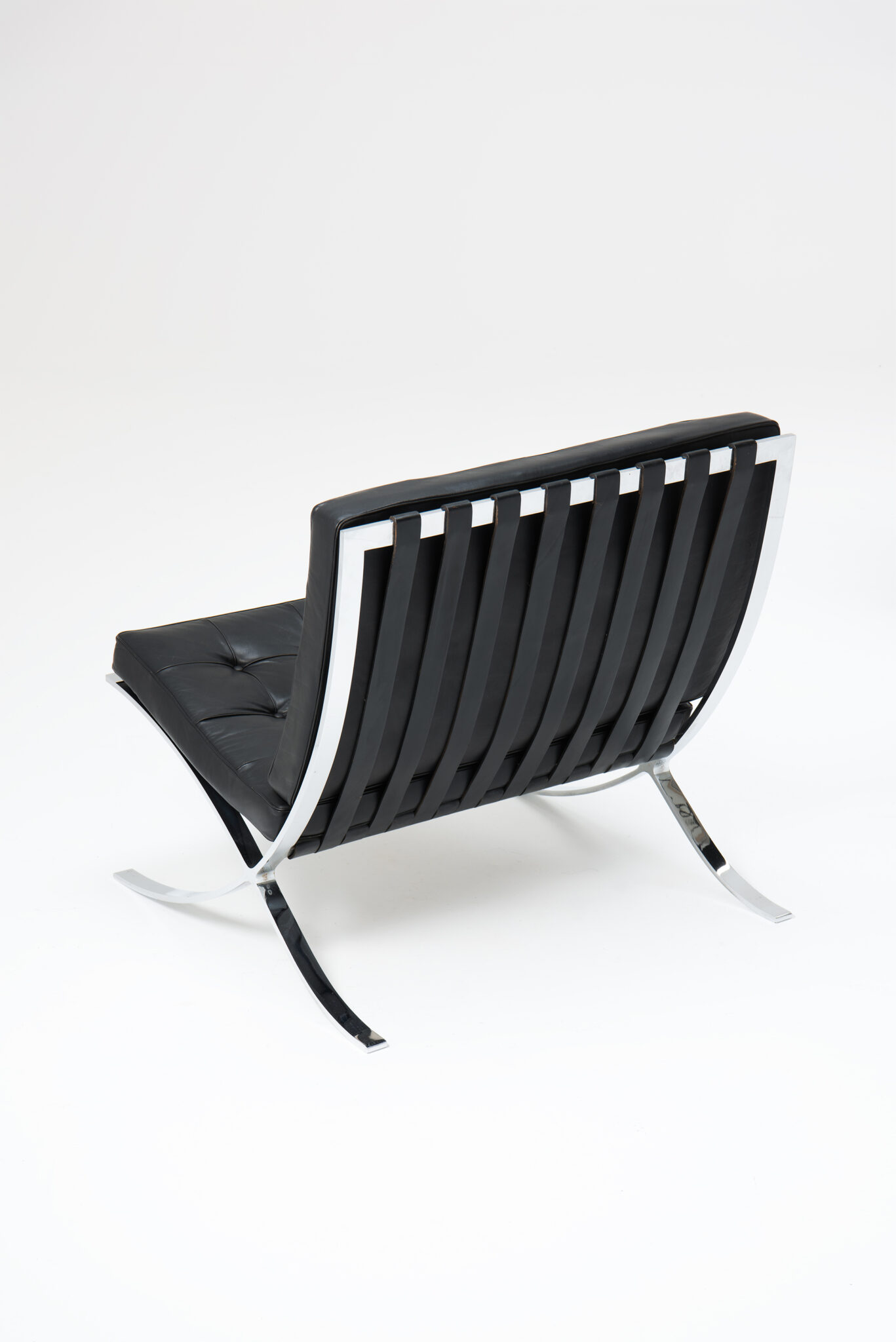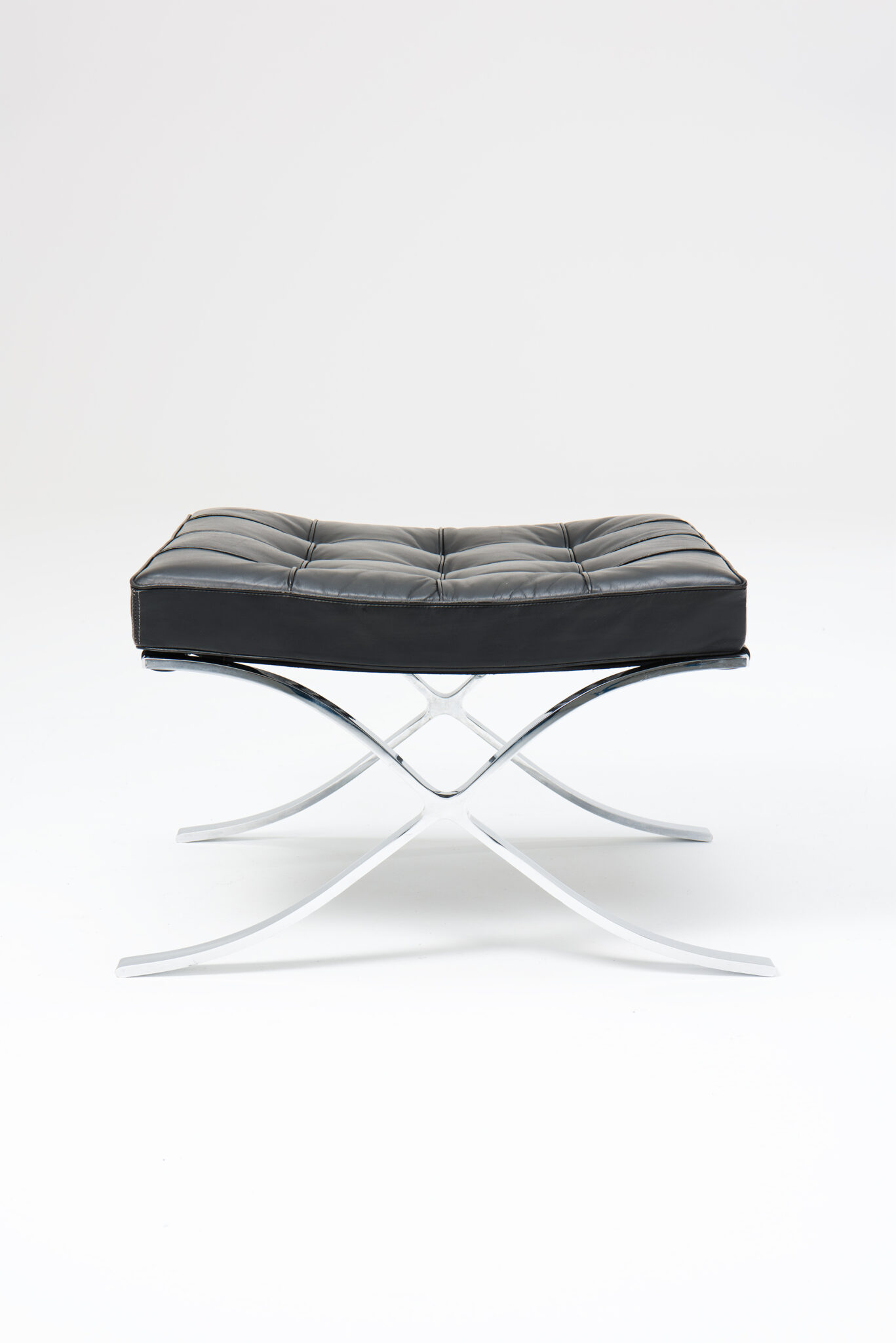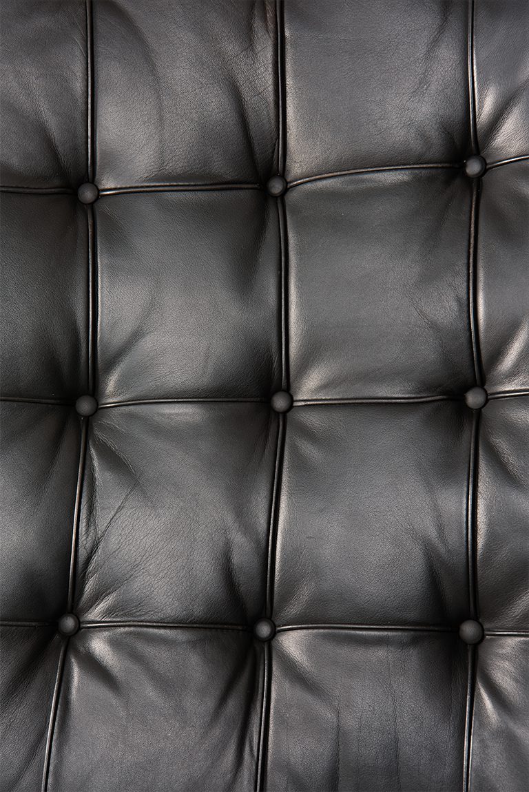 An iconic ‘Barcelona’ Chair in black leather, with foot stool. Designed by Mies Van der Rohe for the 1929 Barcelona International Exposition. The chair is produced by Knoll International in late 70's.