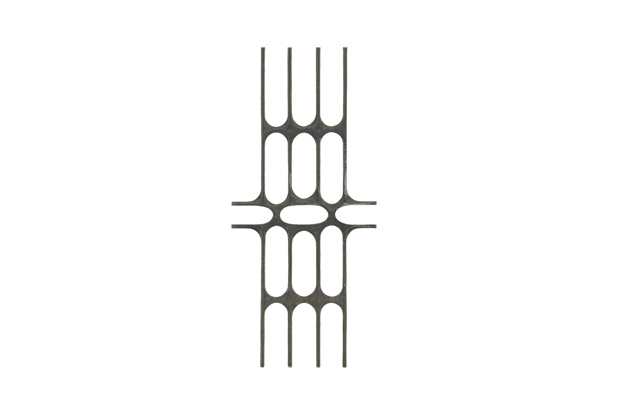 The sculpture is made of iron. It is composed of geometric figures placed vertically and horizontally.