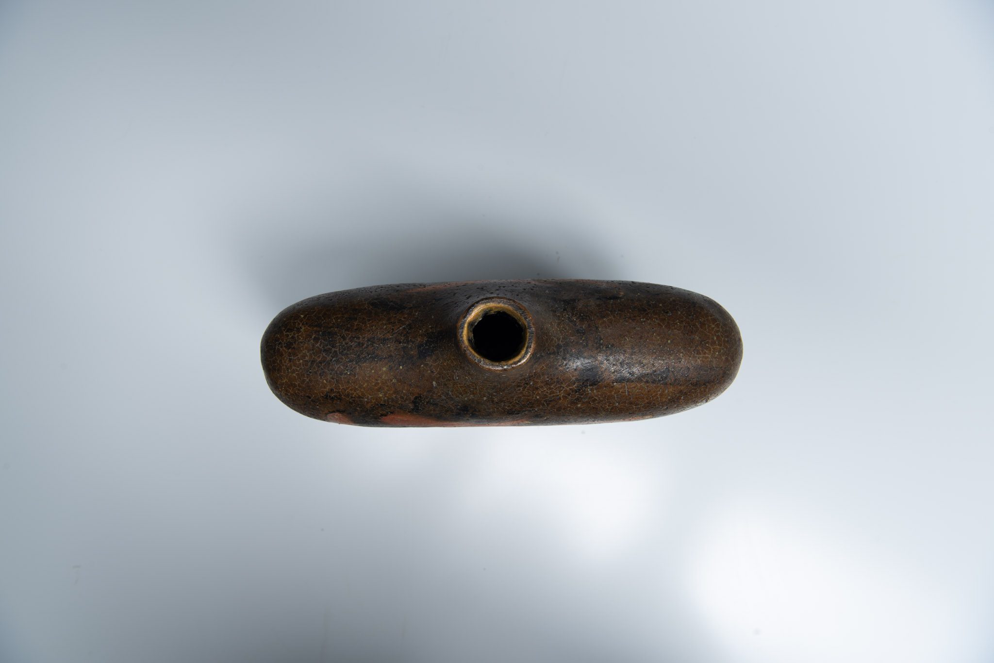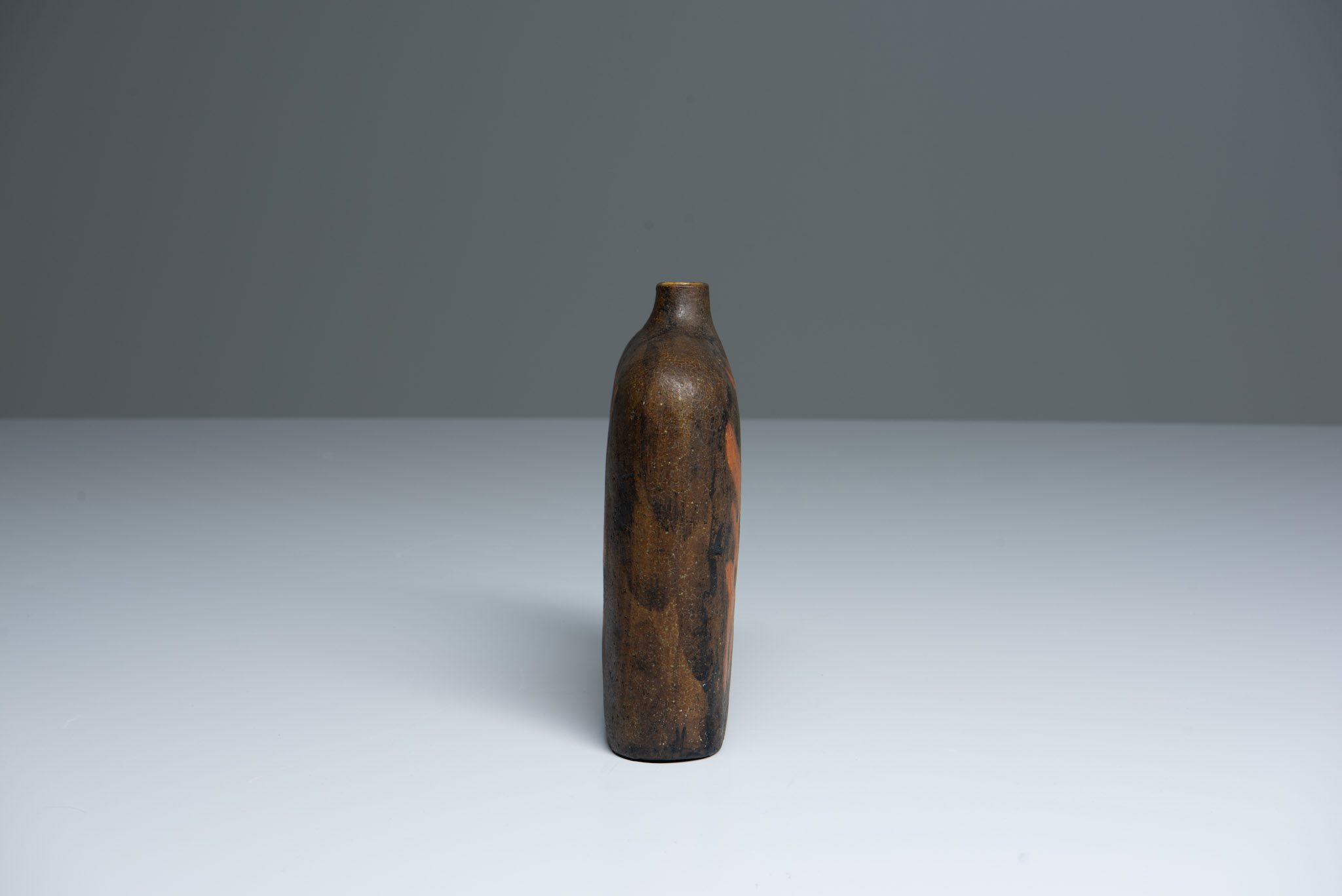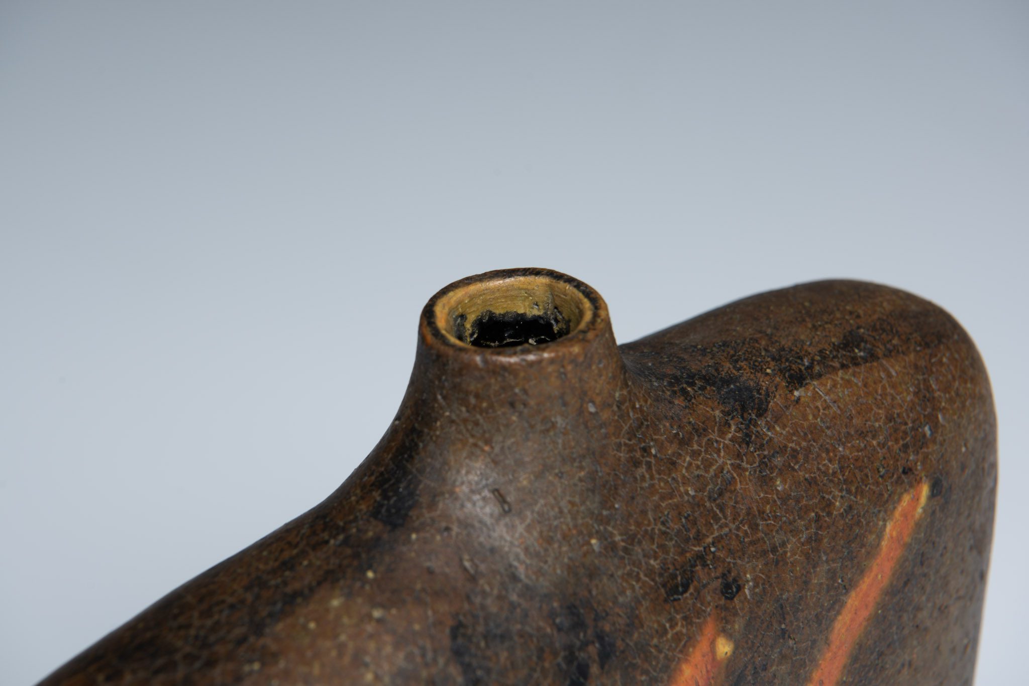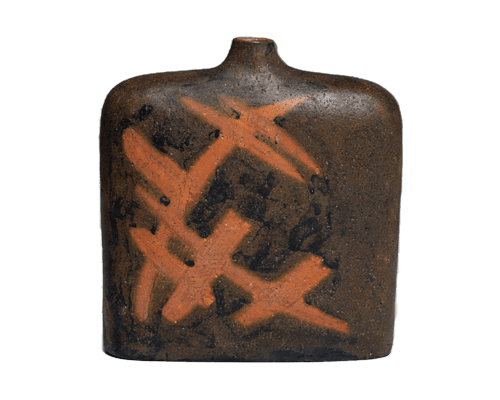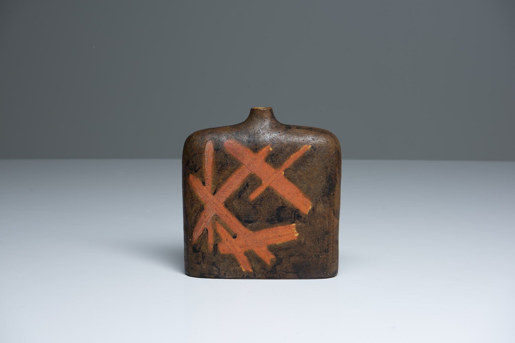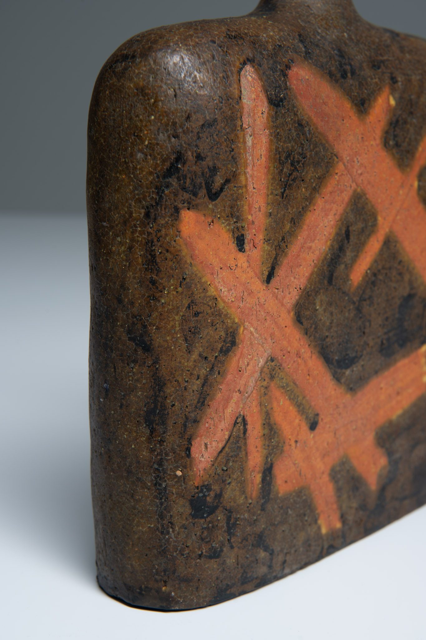 Square glazed earthenware flat bottle neck vase by Florentine master of ceramics, Marcello Fantoni. Likely produced in the 1960's alongside his similarly shaped vases for Raymor. Orange hand painted cross design on both flat, brown faces.