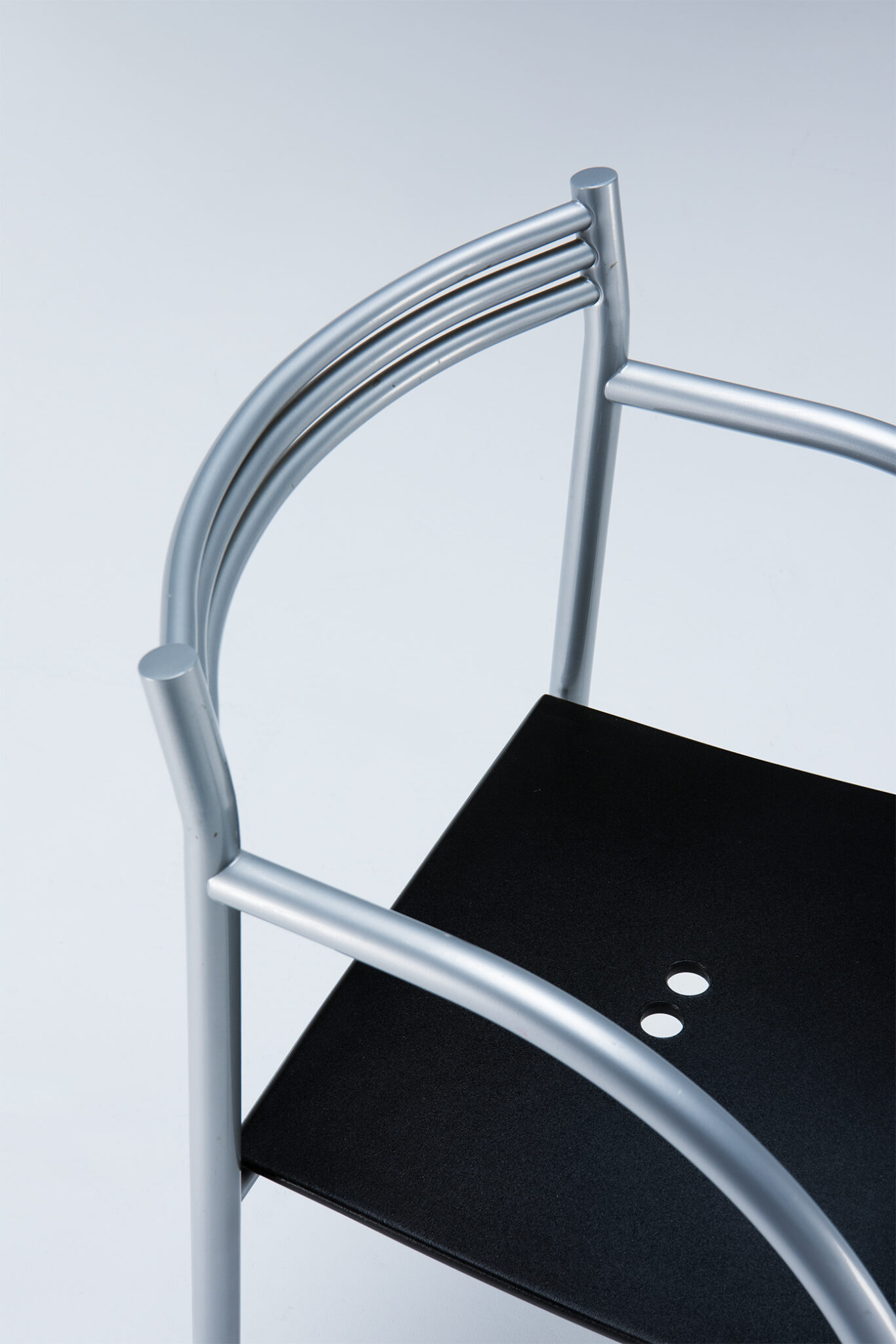 The ‘Francesca Spanish’ chairs consist of silver lacquered tubular structure with a black plastic seat ( textured) pierced with two holes. This is a very early edition and the chairs are signed ‘Baleri Italia Starck’ at the bottom. Overall condition of the chairs is very good with the usual traces of use and age.