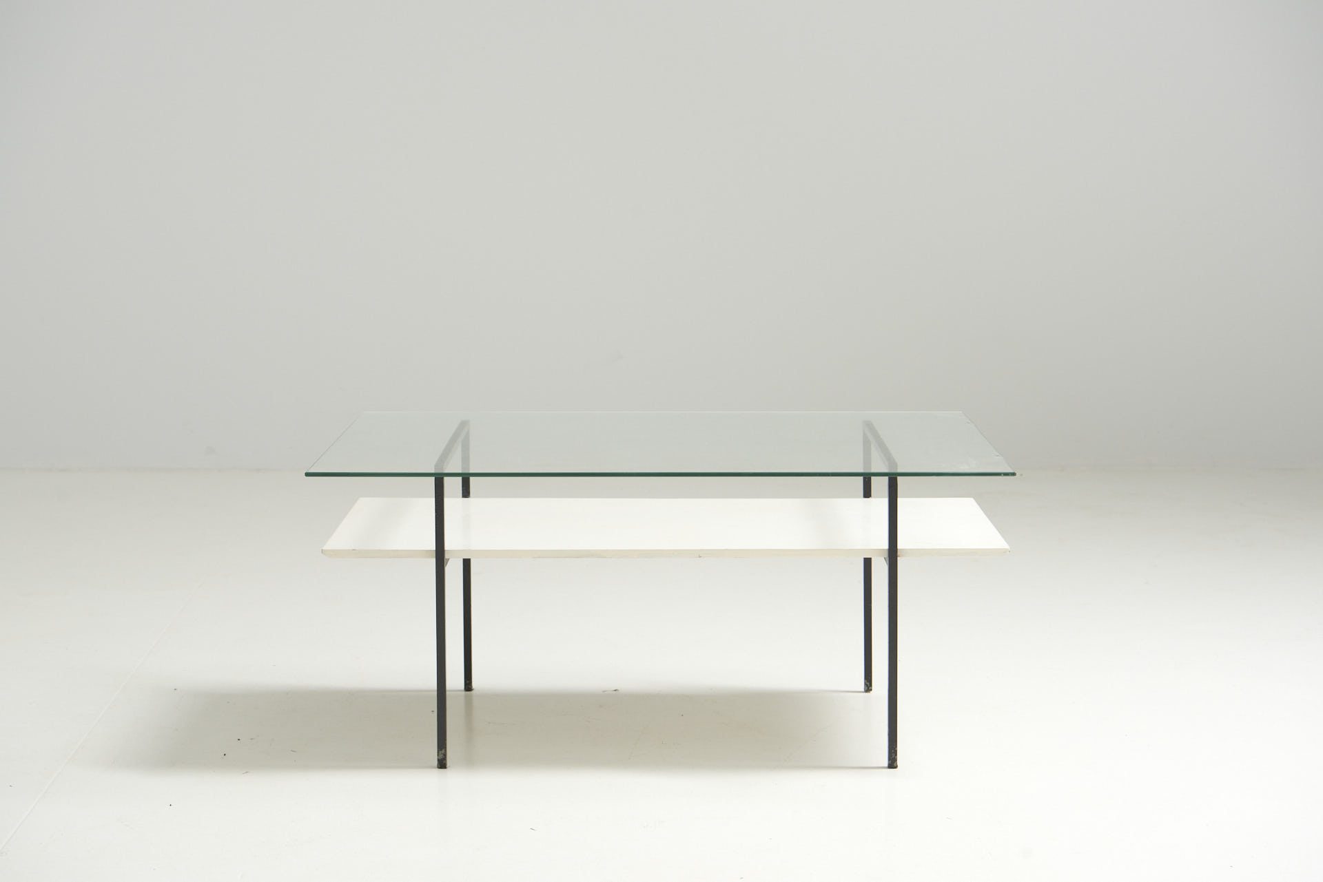 An elegant, minimalist coffee table with a low level shelf designed by Dutch industrial designer Coen De Vries.