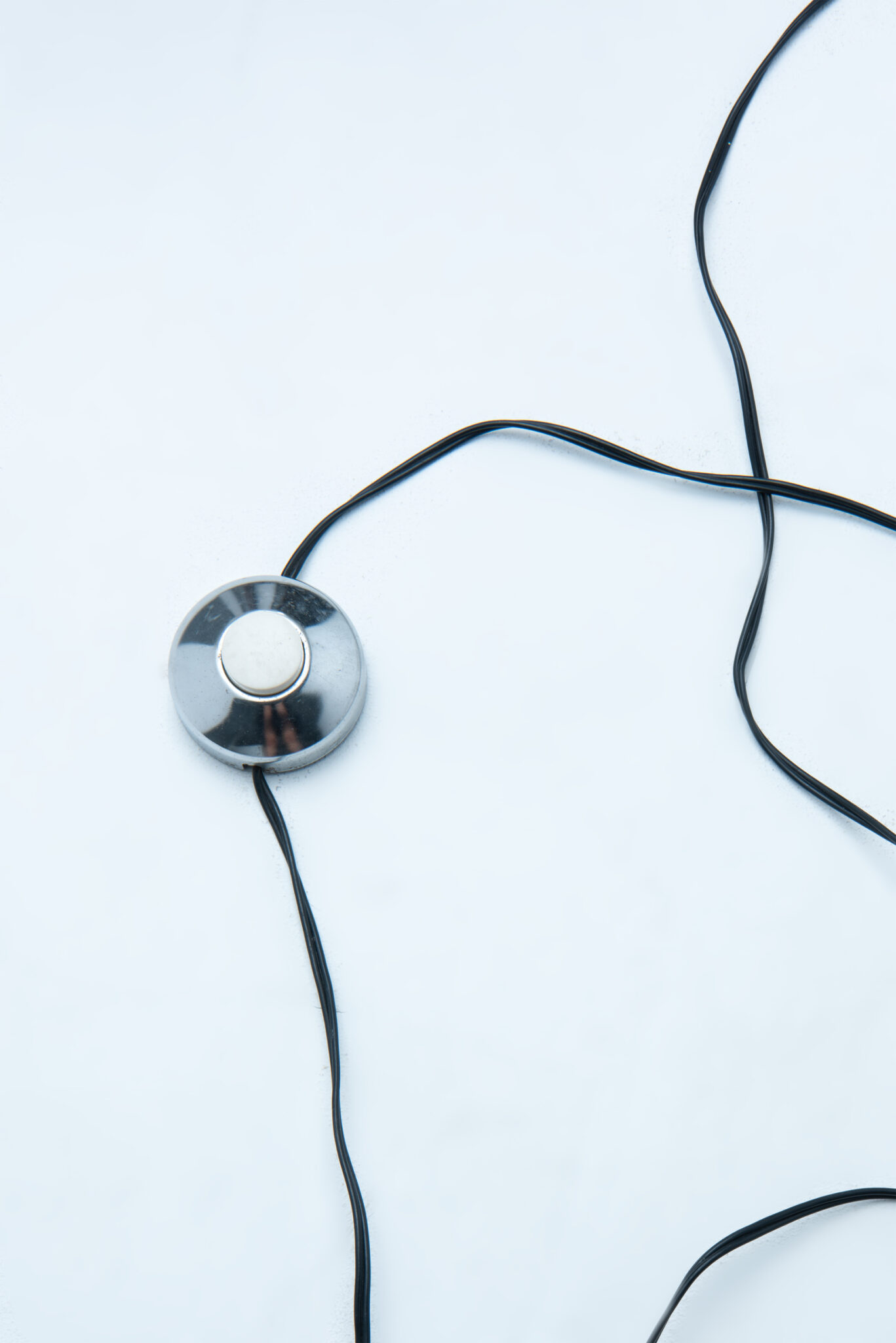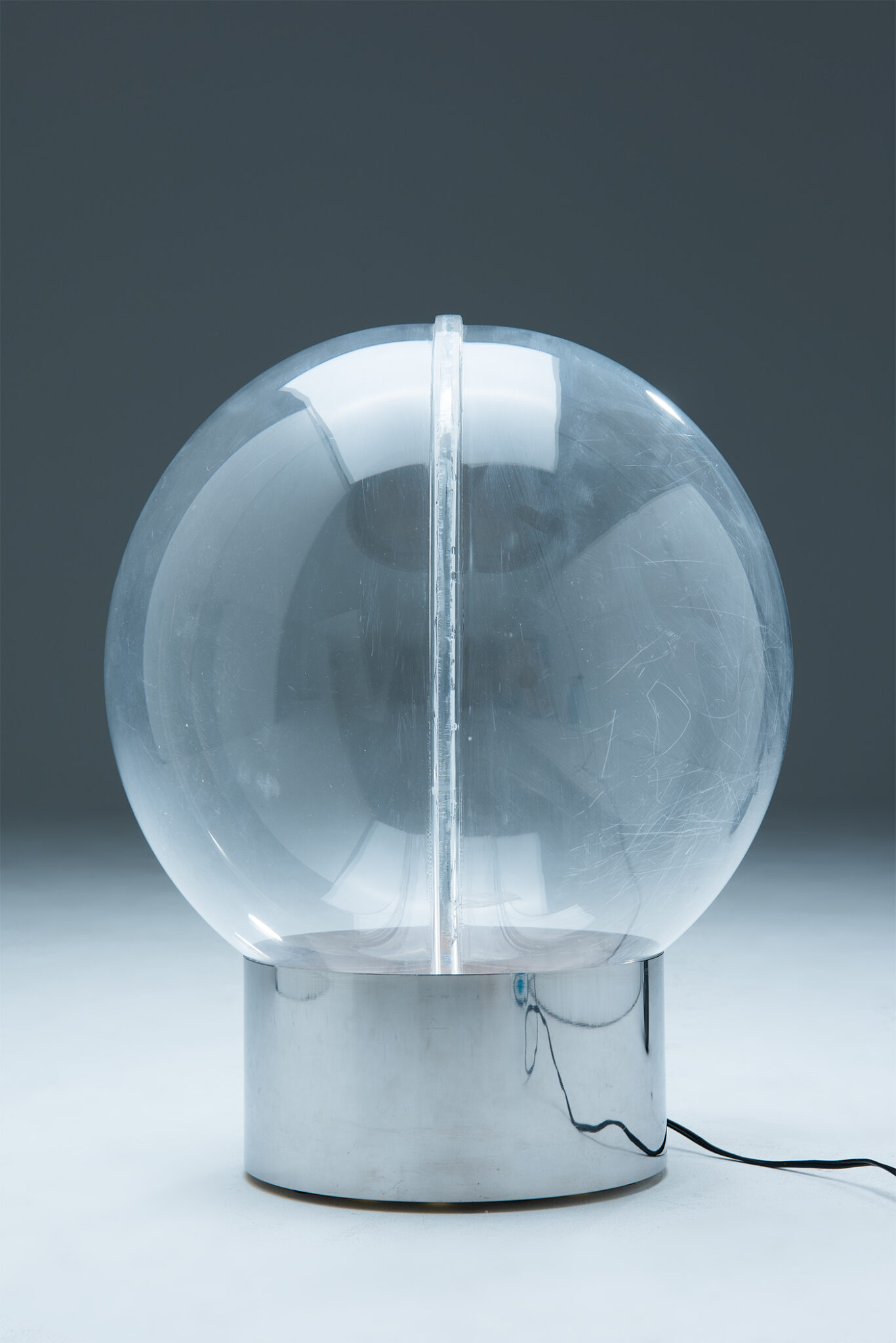 Floor-, table lamp ‘Model 4043’ designed by Filippo Panseca in 1968 for Kartell, Italy. Two different sizes were released, this is the smaller version. The transparent acrylic sphere is divided by a mirror placed in the centre of the sphere. This creates an interesting play of reflected light caused by the light from the base on which the sphere rests. Placing the sphere in different positions on the polished stainless steel base creates a different interaction each time. The lamp is in good condition and shows the necessary signs of use and visible scratches on one side of the sphere that have occurred over the years.