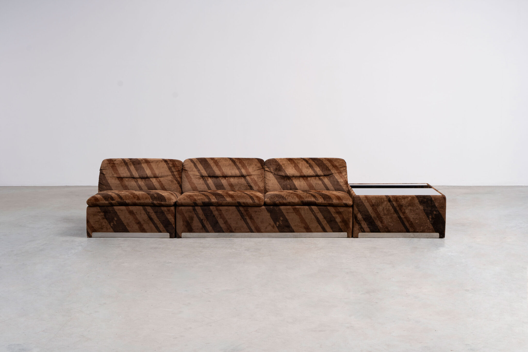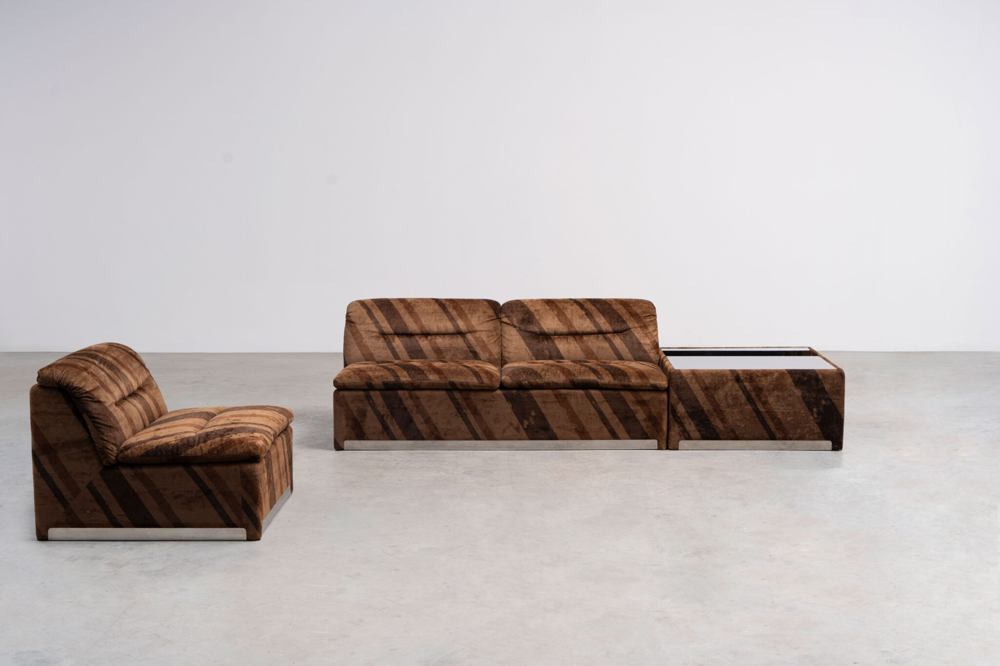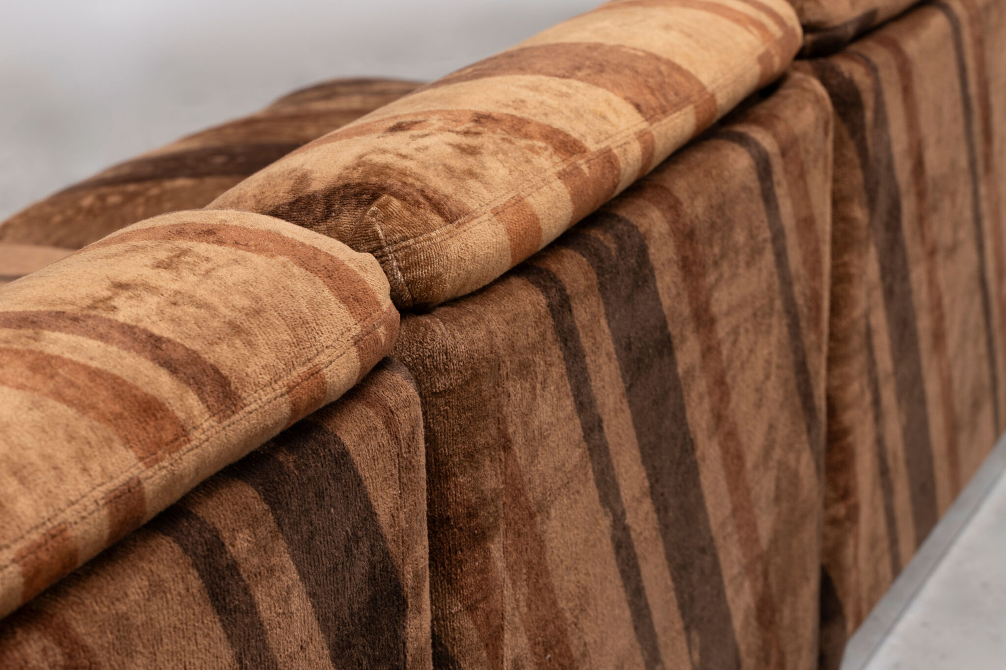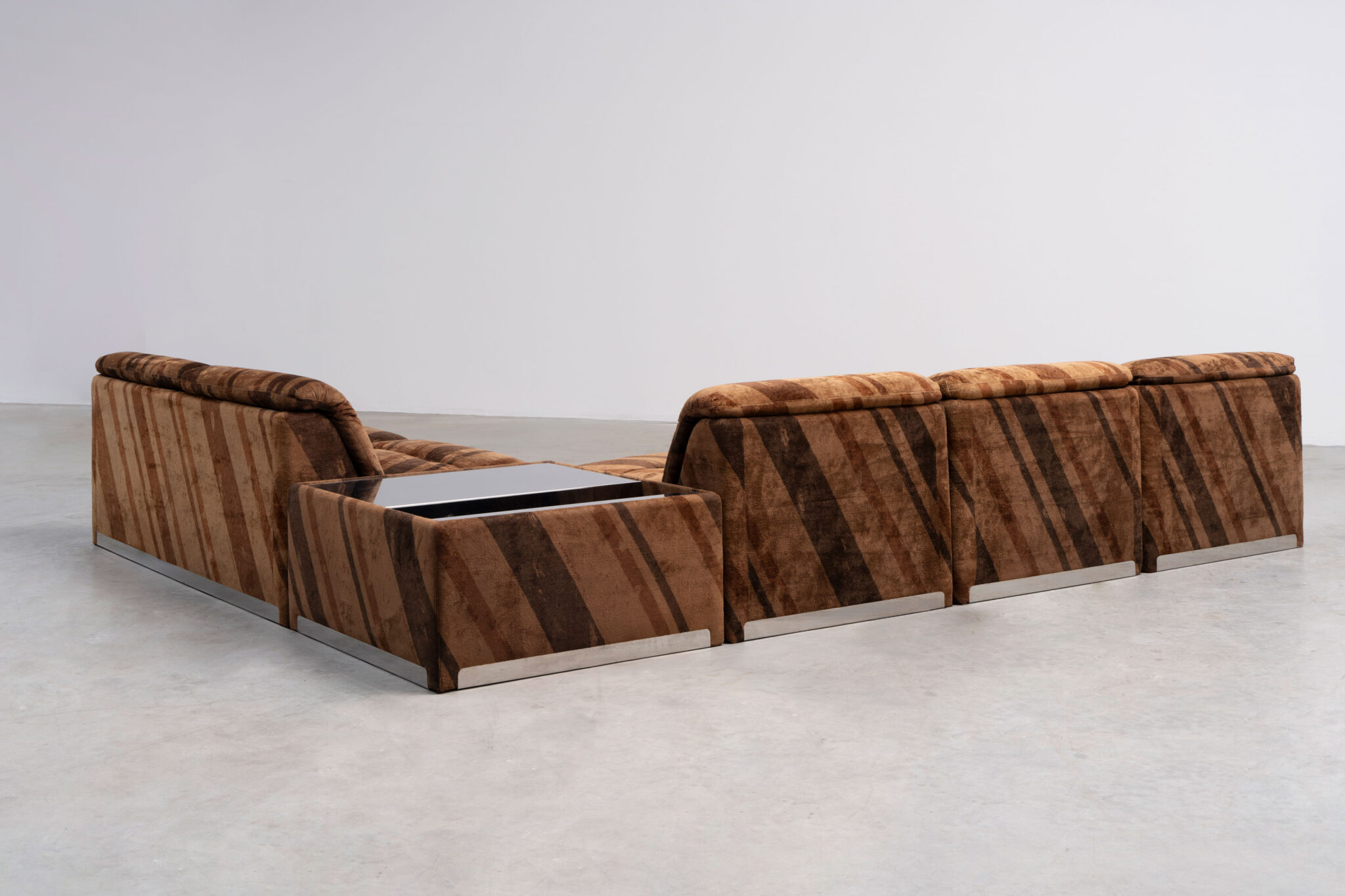 P10 modular sofa and matching coffee table designed by Giovanni Offredi for Proposals (Saporiti) Italy. The set is still upholstered in its original mohair velvet. It consists of a two-seater sofa, three single seats and a square coffee table with a lowered section in polished stainless steel. The bases of the sofa elements are in brushed stainless steel. As you can see from the pictures, all the different elements can be put together in endless combinations. The modular elements are in very good condition. The fabric doesn't show any extreme wear or damage. The polished stainless steel table top has a few scratches which are normal signs of age and use. Note: 3 sofa elements 85 x 85 x 69 cm, 1 sofa element 170 x 85 x 69 cm and the coffee table 87 x 87 x 42 cm.