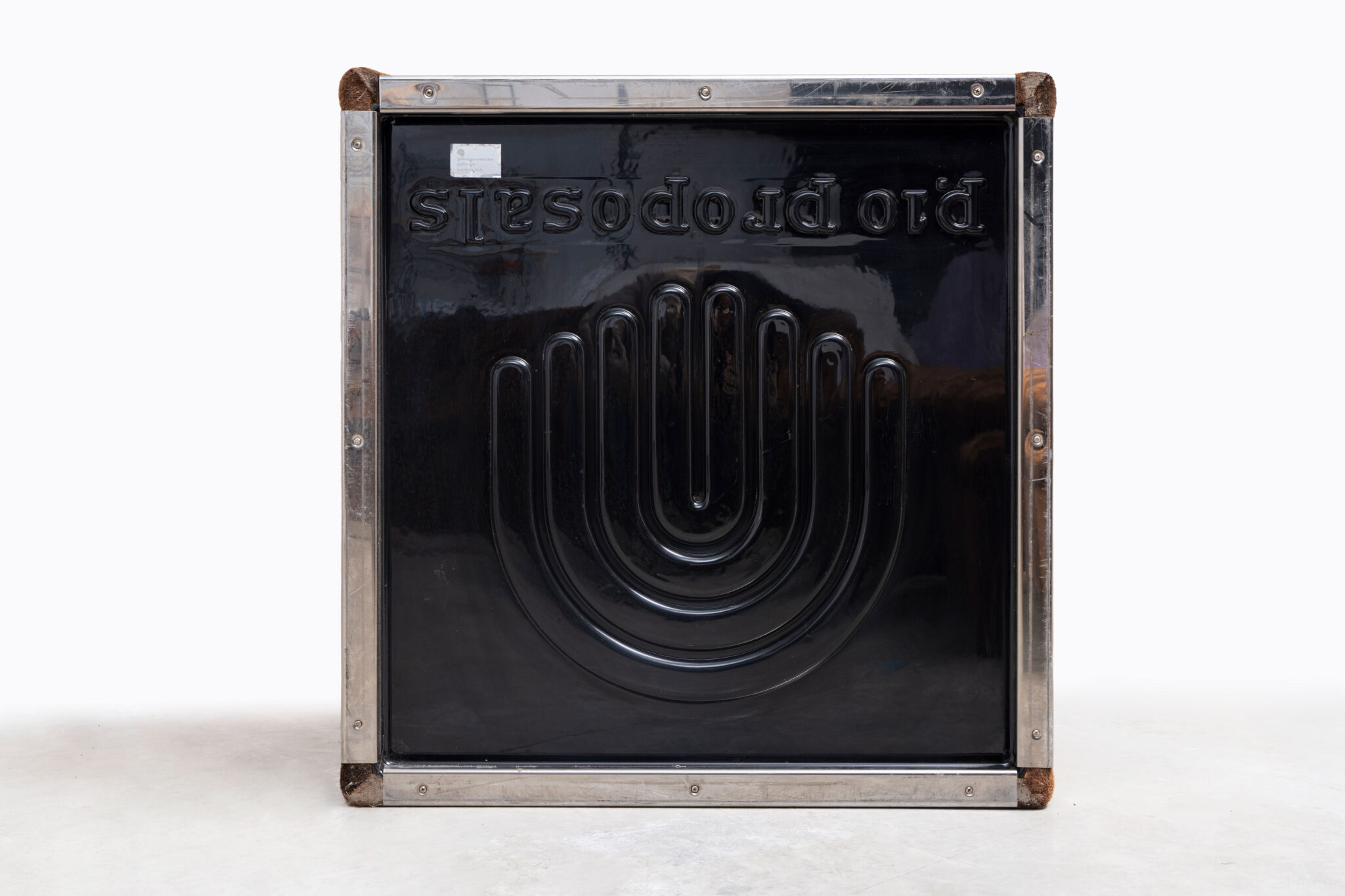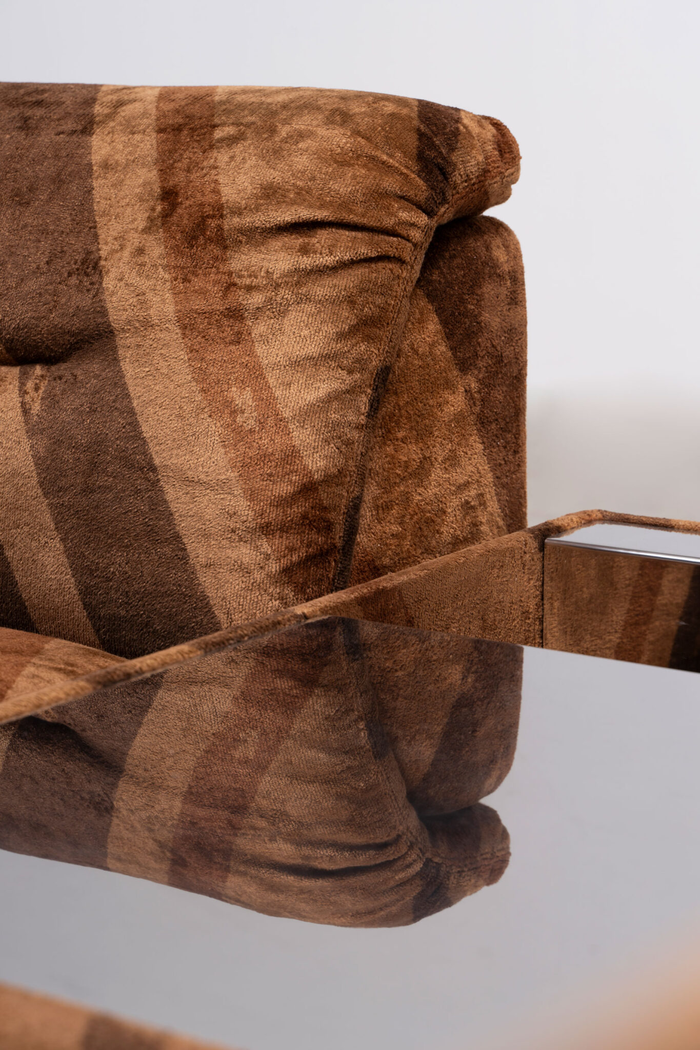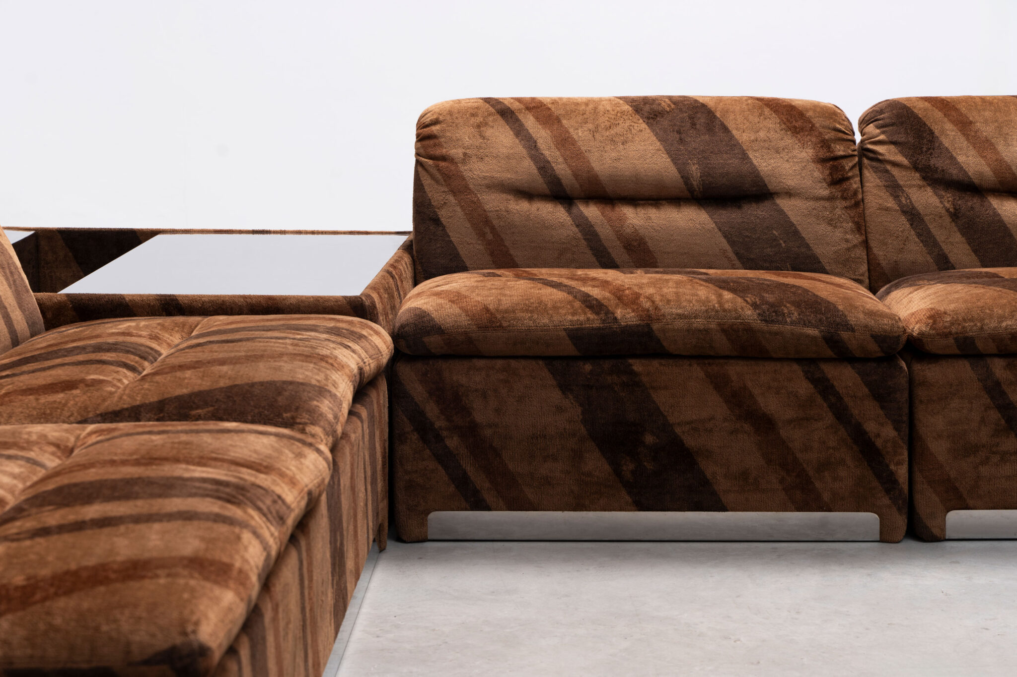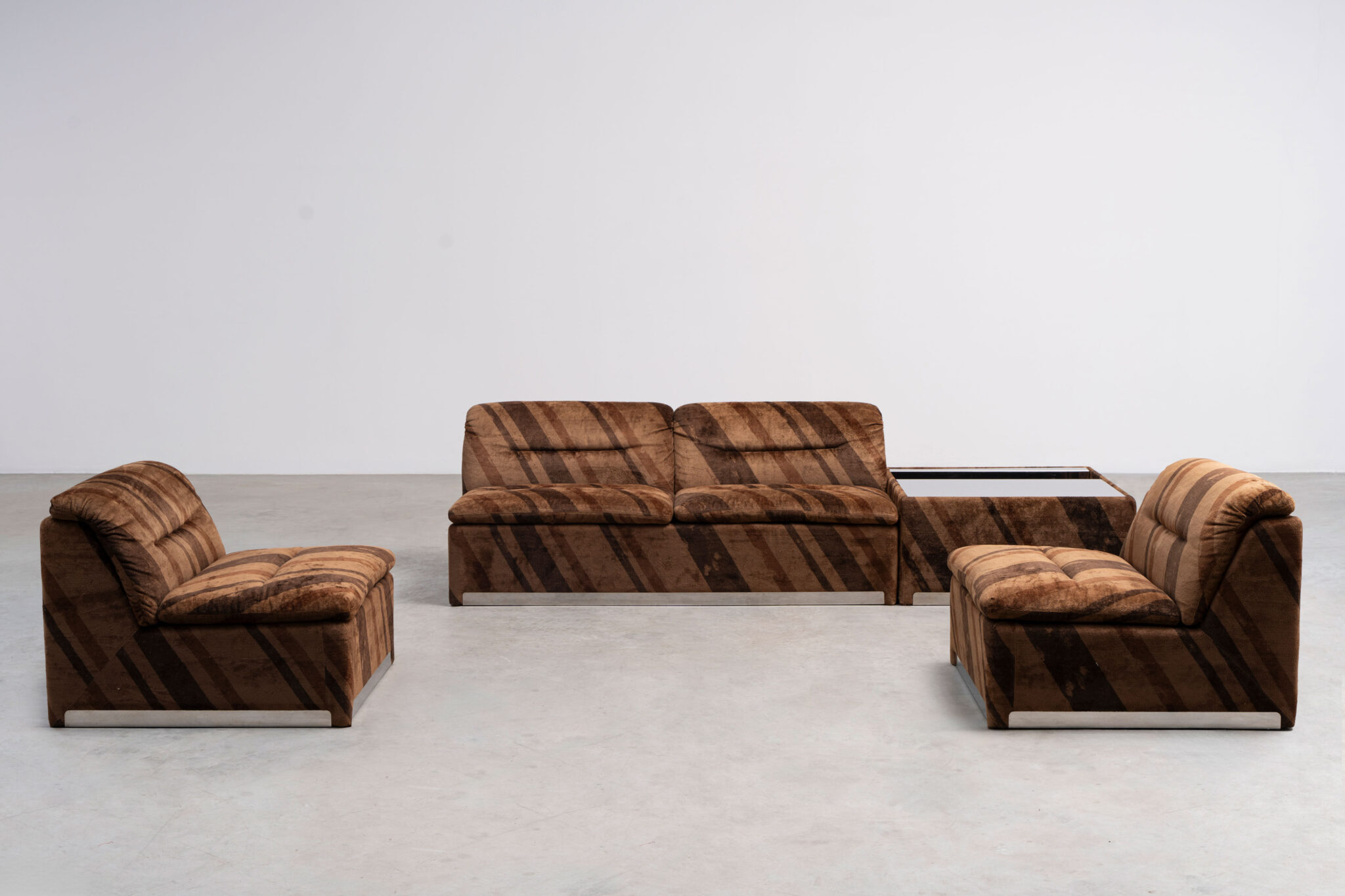 P10 modular sofa and matching coffee table designed by Giovanni Offredi for Proposals (Saporiti) Italy. The set is still upholstered in its original mohair velvet. It consists of a two-seater sofa, three single seats and a square coffee table with a lowered section in polished stainless steel. The bases of the sofa elements are in brushed stainless steel. As you can see from the pictures, all the different elements can be put together in endless combinations. The modular elements are in very good condition. The fabric doesn't show any extreme wear or damage. The polished stainless steel table top has a few scratches which are normal signs of age and use. Note: 3 sofa elements 85 x 85 x 69 cm, 1 sofa element 170 x 85 x 69 cm and the coffee table 87 x 87 x 42 cm.