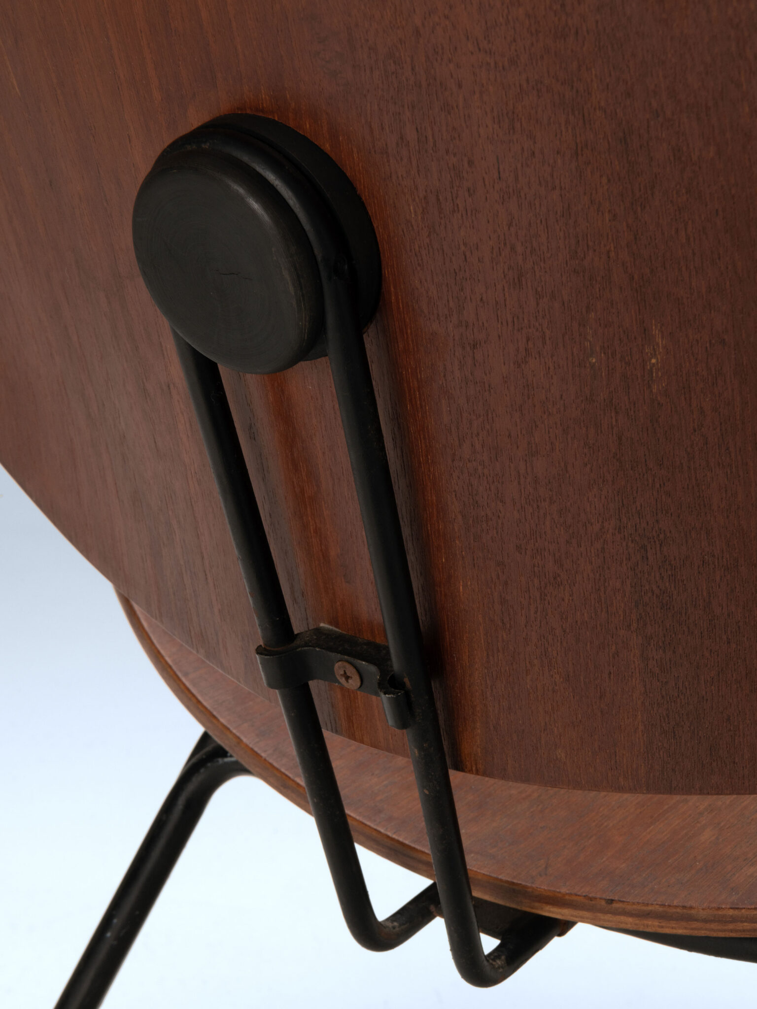 The P31 represents Borsani’s design ideology perfectly, being a pure and simple design, yet made interesting through one detail. With this specific chair, Borsani opted for a tripod base, where the two front legs are bound together, instead of the traditional four-legged design. The seat and backrest are made in teak and slightly curved for ergonomic comfort. The frame is made of steel tubes, painted black. The chair is in very good condition but displays some signs of use and wear consistent with its age.