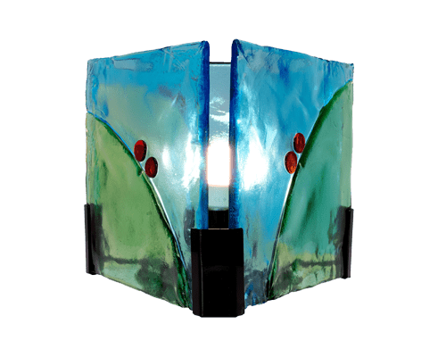 Here we have a table lamp in stained Murano glass. It consists out of three glass panels, attached to the base by a metal rail, which makes the lamp rotatable. The panels are positioned in a triangular configuration.