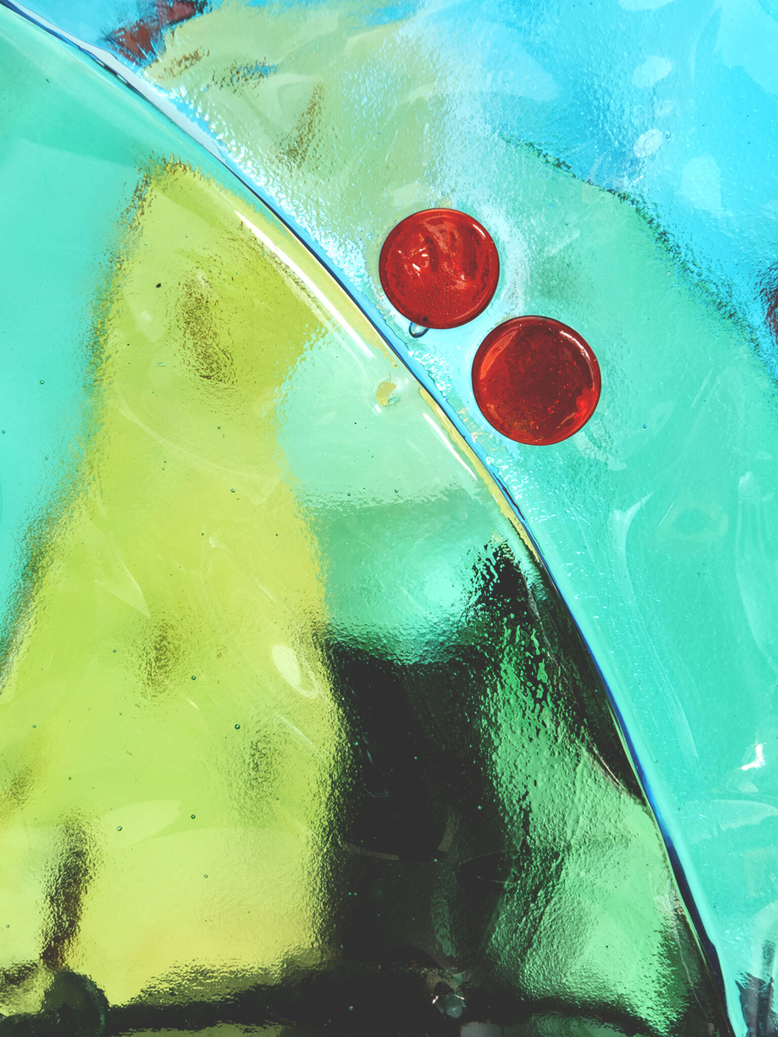 Here we have a table lamp in stained Murano glass. It consists out of three glass panels, attached to the base by a metal rail, which makes the lamp rotatable. The panels are positioned in a triangular configuration.