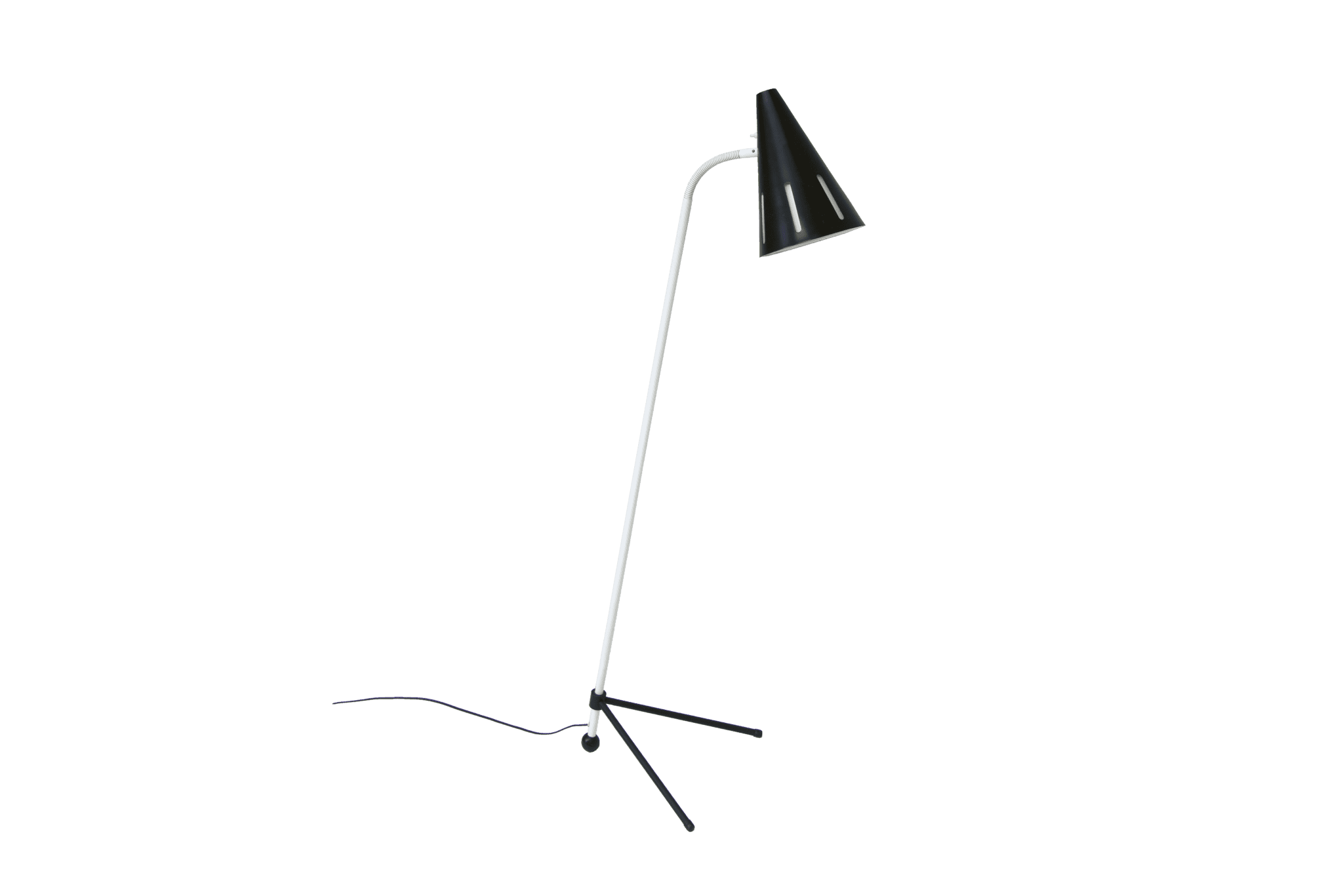 The shade consists of a black lacquered hood with a white metal diffuser underneath. Furthermore it has a white rod and a black V-shaped foot. The diffusion of the light can be adjusted by turning the inner shade, made possible by the gooseneck. Its design reminds of other mid-century floor lamps, such as those of Willem Hagoort and Van Doorn.