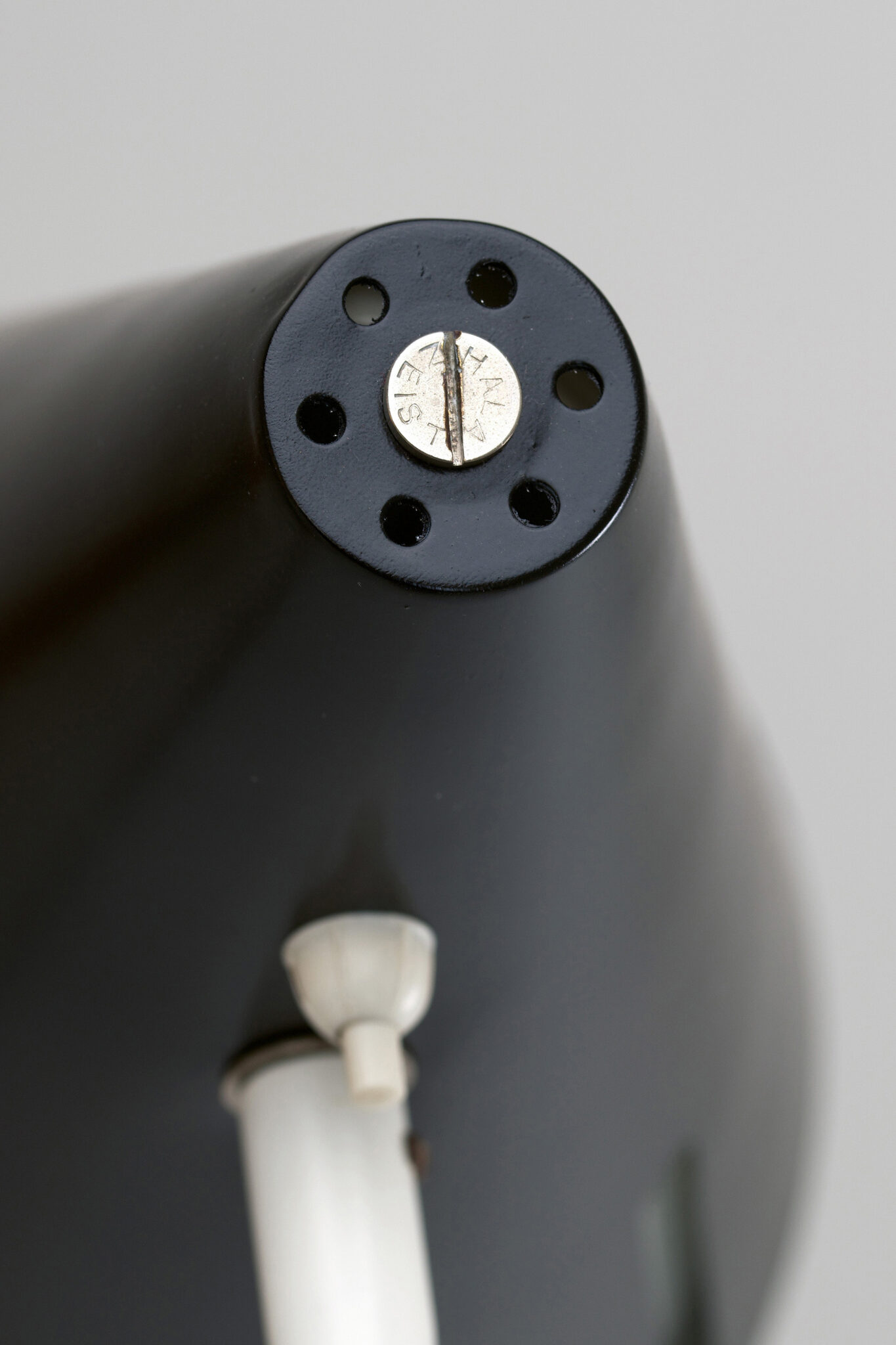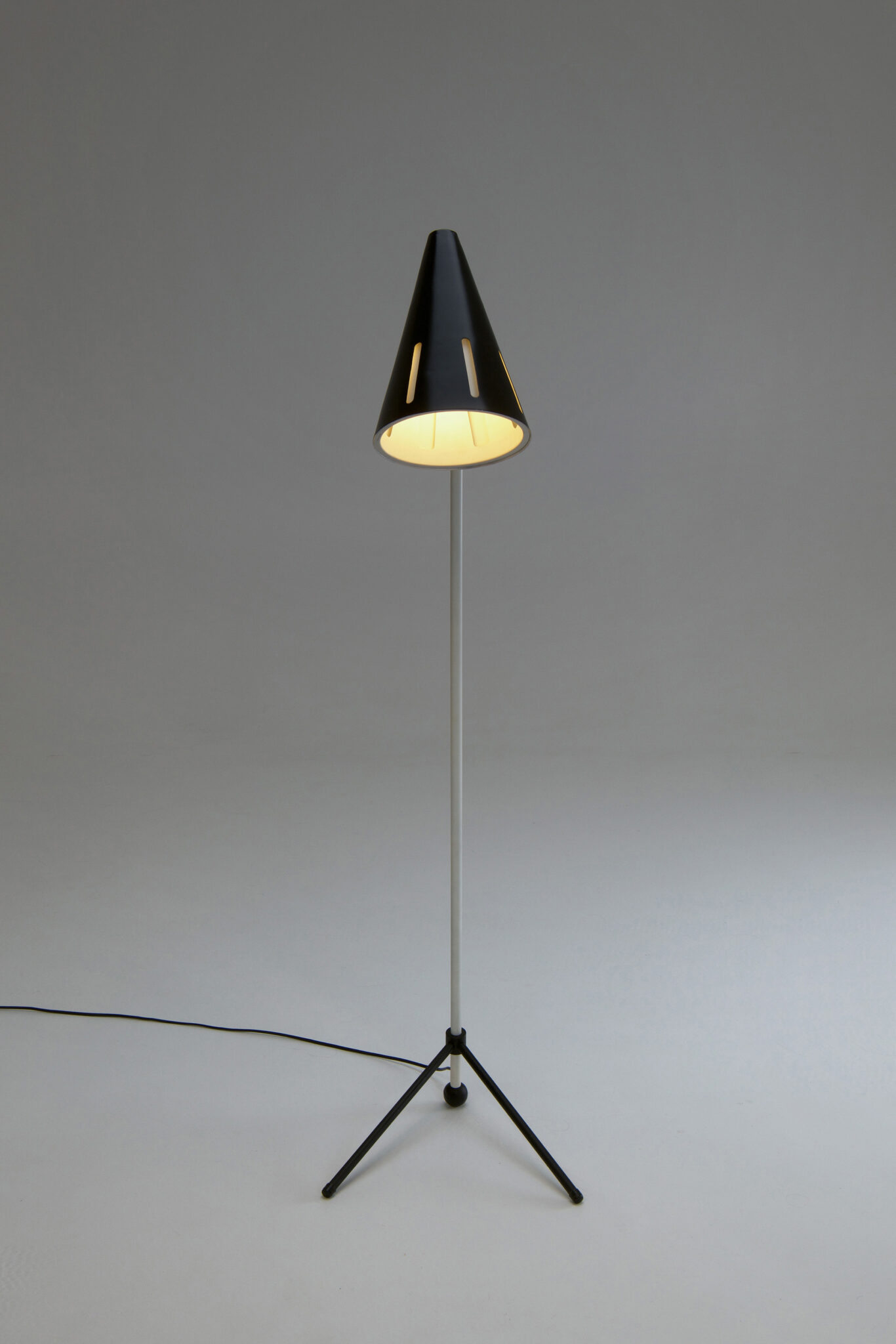 The shade consists of a black lacquered hood with a white metal diffuser underneath. Furthermore it has a white rod and a black V-shaped foot. The diffusion of the light can be adjusted by turning the inner shade, made possible by the gooseneck. Its design reminds of other mid-century floor lamps, such as those of Willem Hagoort and Van Doorn.